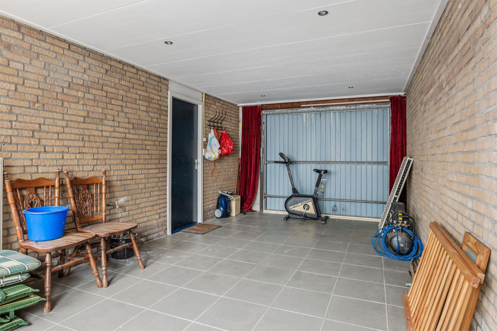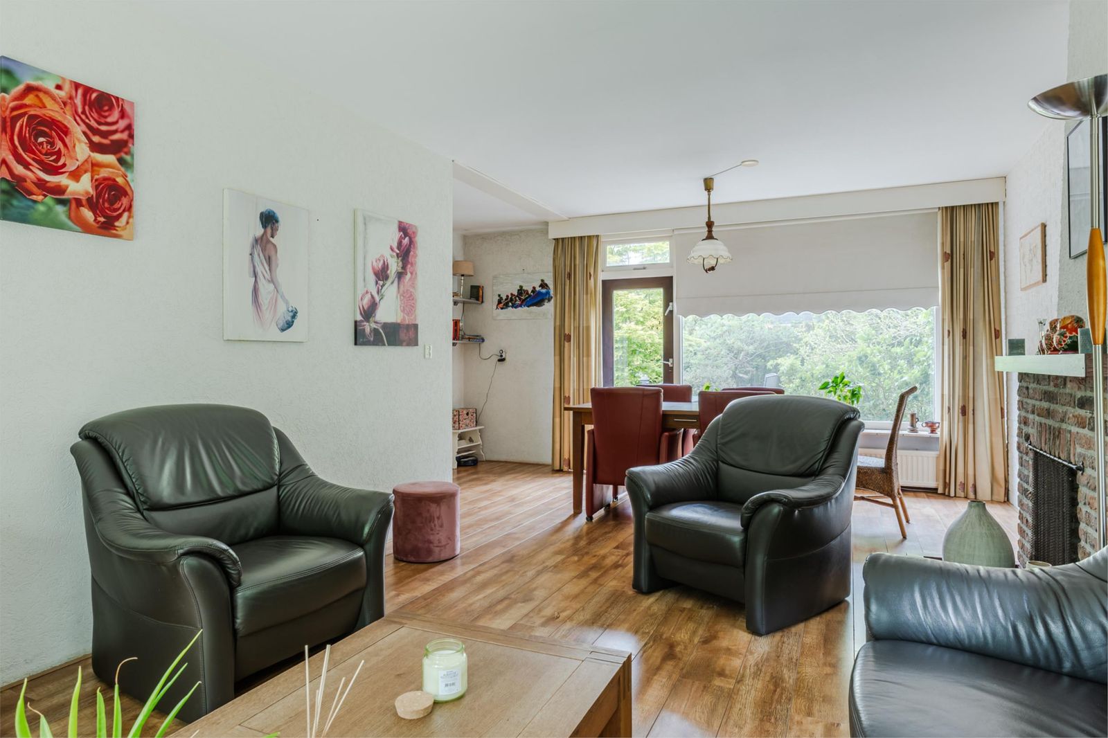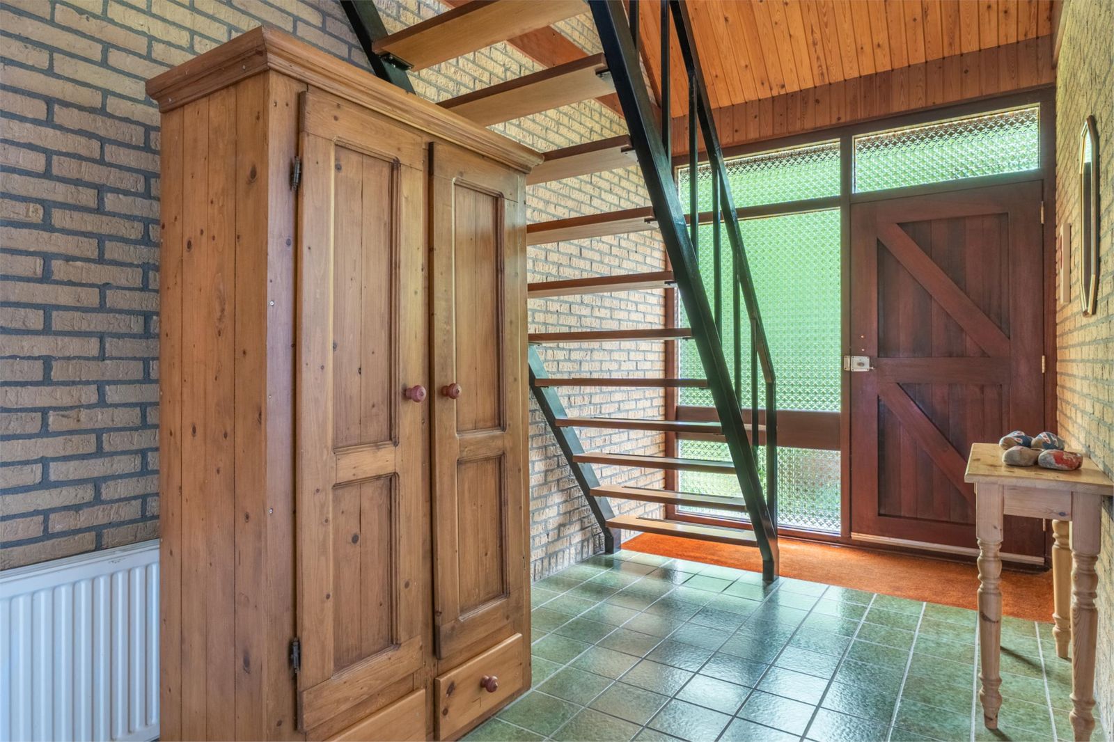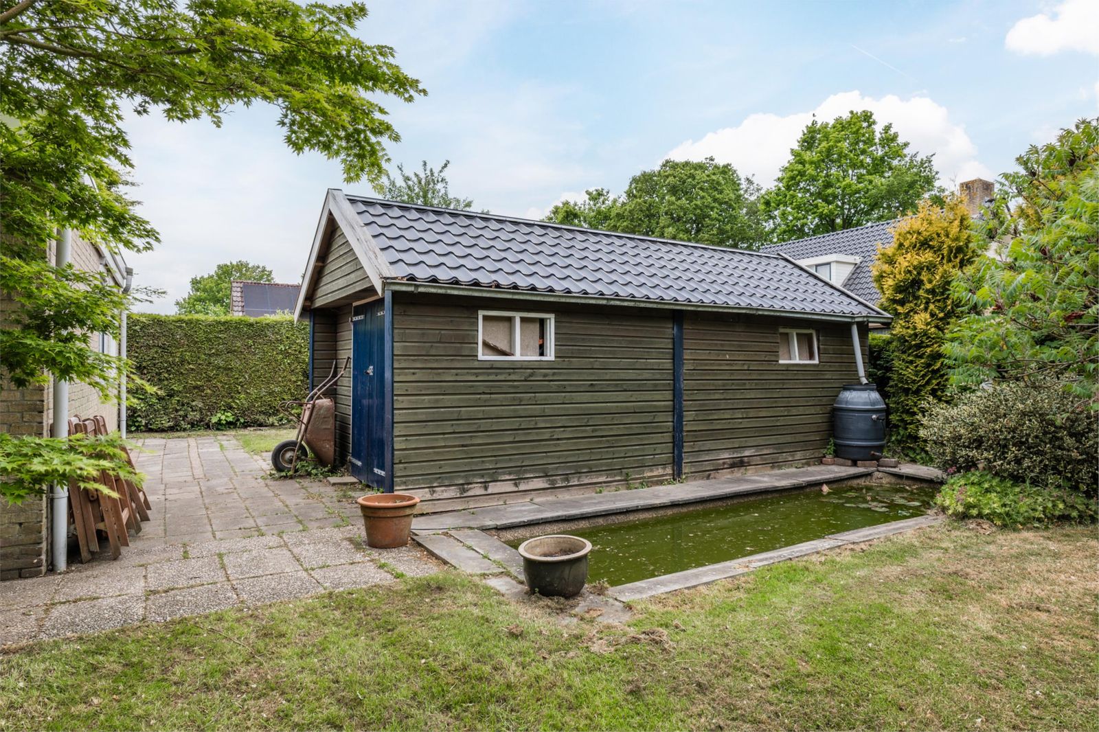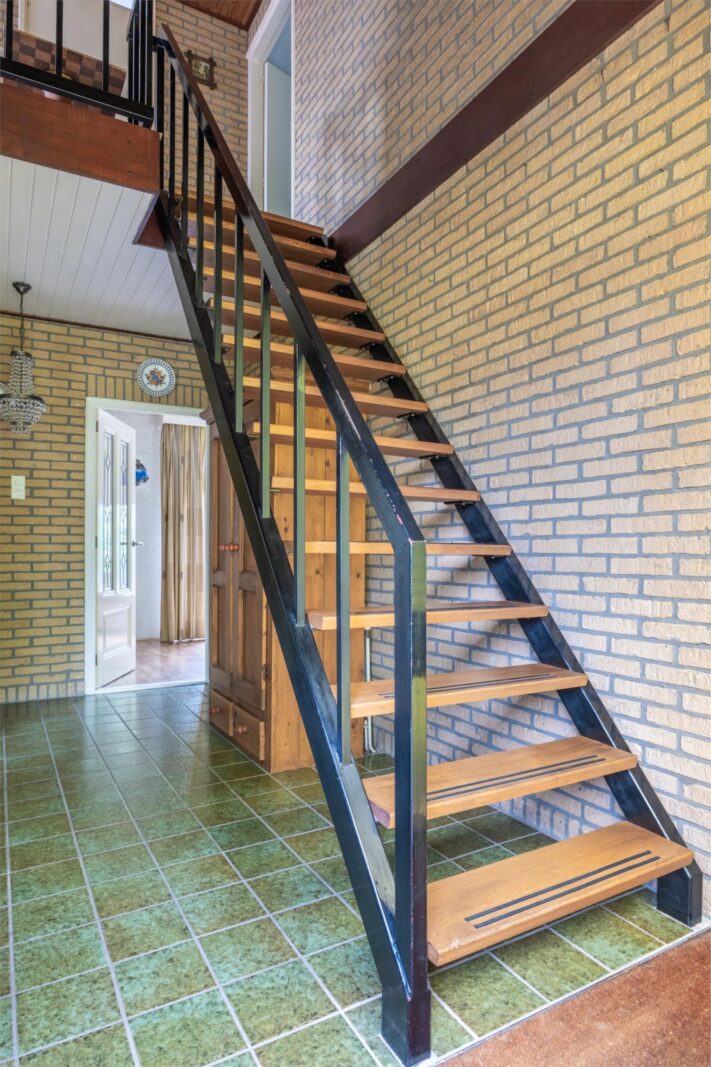 Binnenkomst via de entree met meterkast en toilet. Op de begane grond bevindt zich een ruime slaapkamer, ideaal voor gelijkvloers wonen. De sfeervolle L-vormige woonkamer met open haard biedt directe toegang tot het terras en de tuin. Aangrenzend vind je de keuken en een praktische bijkeuken. De badkamer met douche en wastafel grenst aan de bijkeuken. Via de bijkeuken is er inpandige toegang tot de garage (ca. 3 x 7 m), met daarachter een vrijstaande houten bergschuur (ca. 3 x 6 m), ideaal voor tuingereedschap of hobbyruimte.