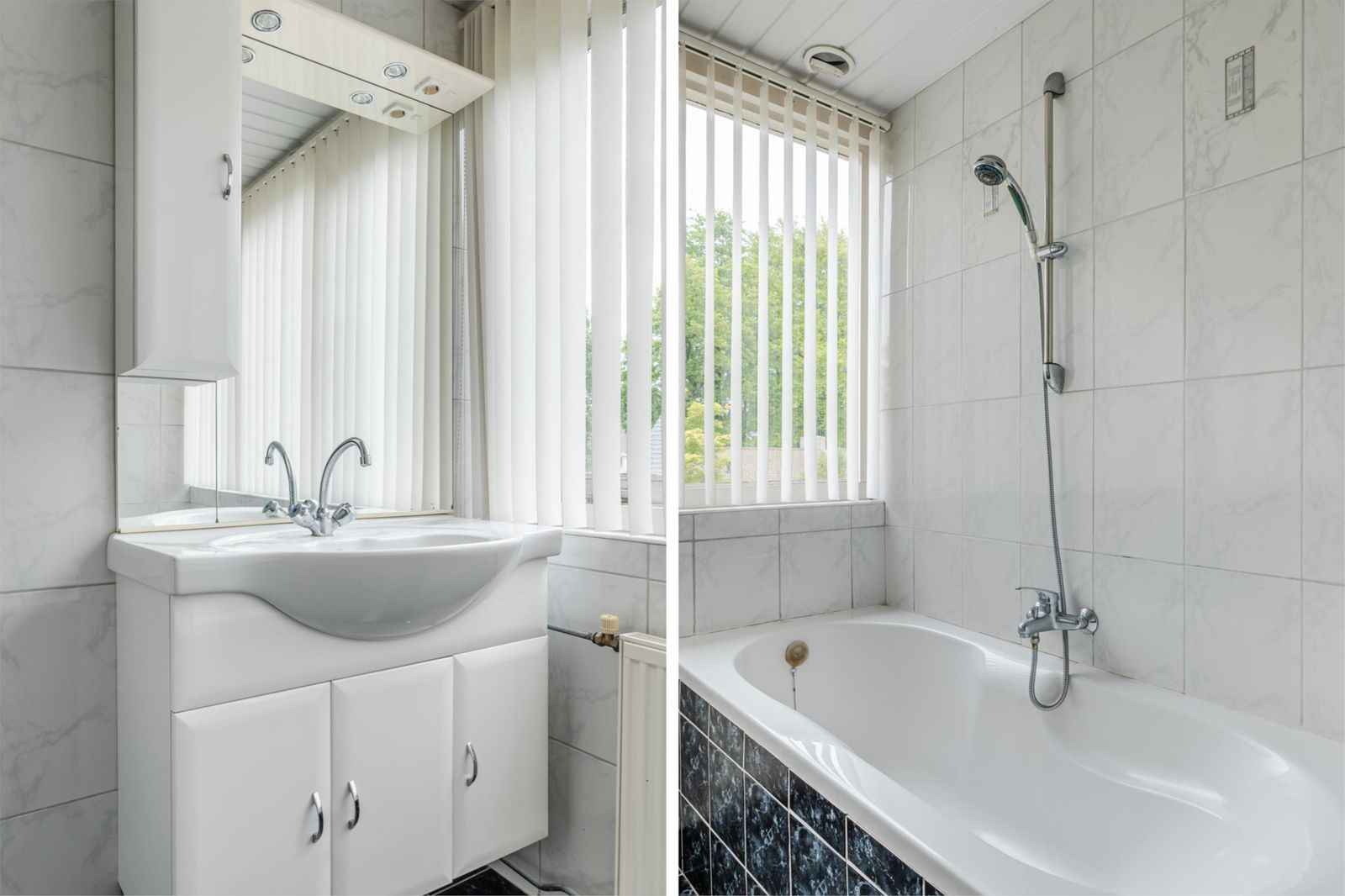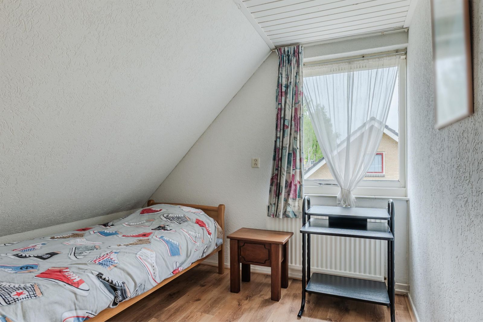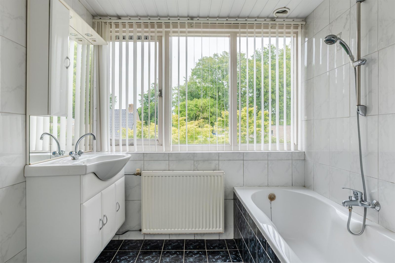 Overloop met vide, drie slaapkamers (waarvan één met vaste kastruimte), en een tweede badkamer voorzien van ligbad, wastafel en toilet. Via een luik is de bergzolder bereikbaar.