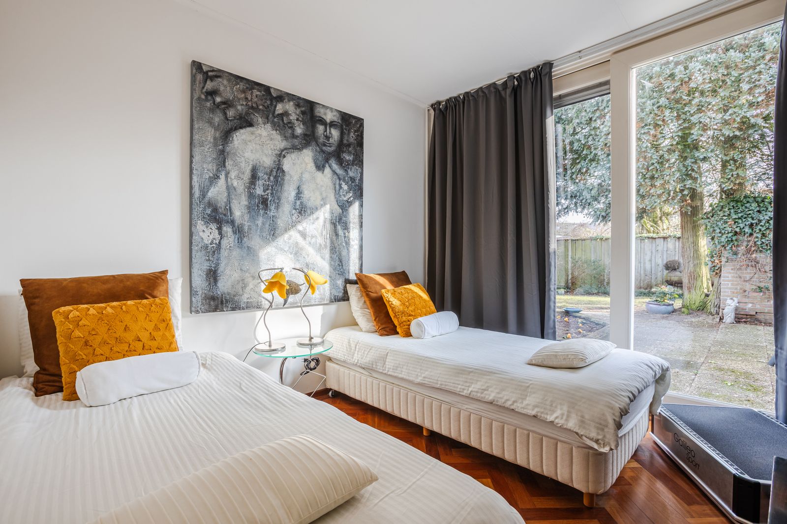 Via een lichte gang bereik je de slaapvleugel. Drie slaapkamers beschikken elk over een eigen schuifpui naar de binnentuin, waardoor iedere kamer licht en rustig aanvoelt. De badkamer is voorzien van ligbad, regendouche, tweede toilet en een raam waarbij je heerlijk kunt genieten van de tuin en de omgeving. Daarnaast is er een royale extra kamer met aansluitingen voor wasmachine en droger. Deze ruimte kan eenvoudig worden ingericht als inloopkast, tweede badkamer, werkruimte of hobbykamer. De ruime hoofdslaapkamer ligt aan het einde van de gang en heeft een grote schuifpui naar de zonnige tuin. Tussen slaapkamer en badkamer bevindt zich een aparte deur naar de patio een beschutte plek om de dag rustig te beginnen.