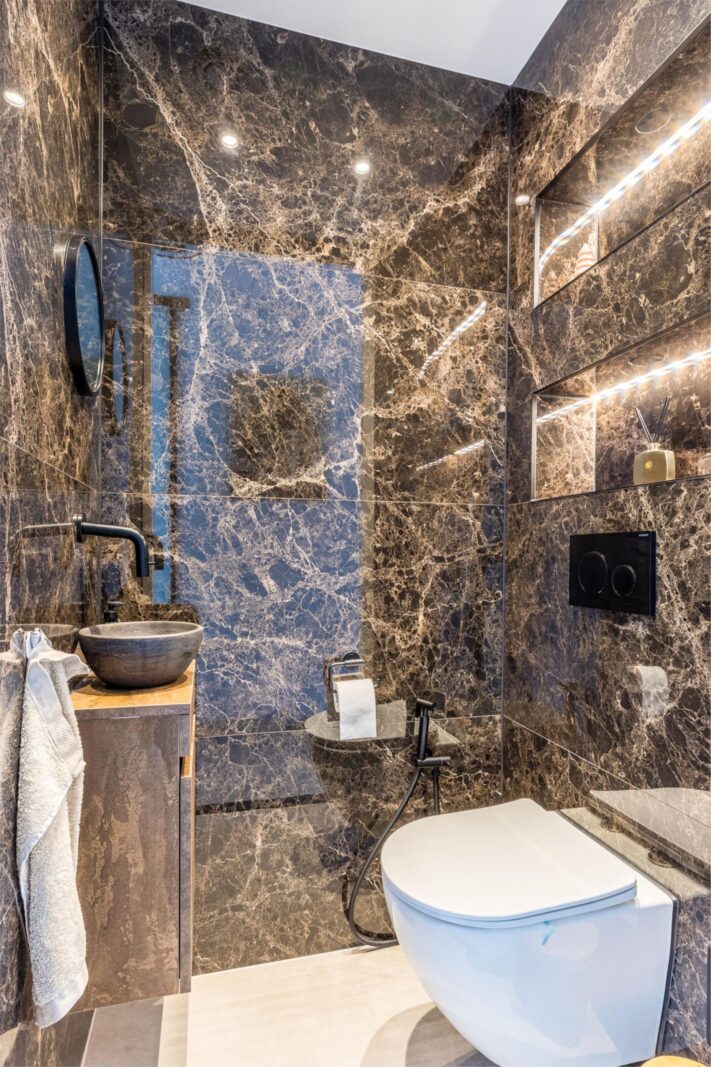 10th floor: Entrance into a spacious hallway providing access to all rooms. There’s a storage room with washing machine connection, central heating system, and WTW unit. The bright living room faces east and opens to the balcony. The adjoining open kitchen features a stylish island with induction cooktop (with integrated extractor), oven, refrigerator, dishwasher, and wine climate cabinet. The spacious bedroom is located on the opposite side and offers a beautiful view. The luxurious bathroom includes a walk-in shower, natural stone sink, and designer radiator. The separate toilet is finished in the same high-end style.
