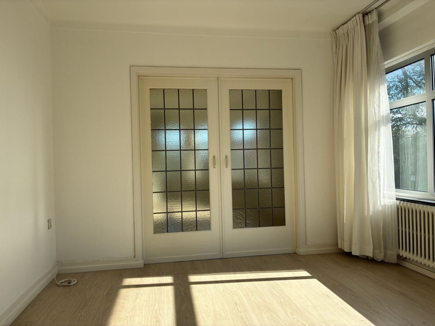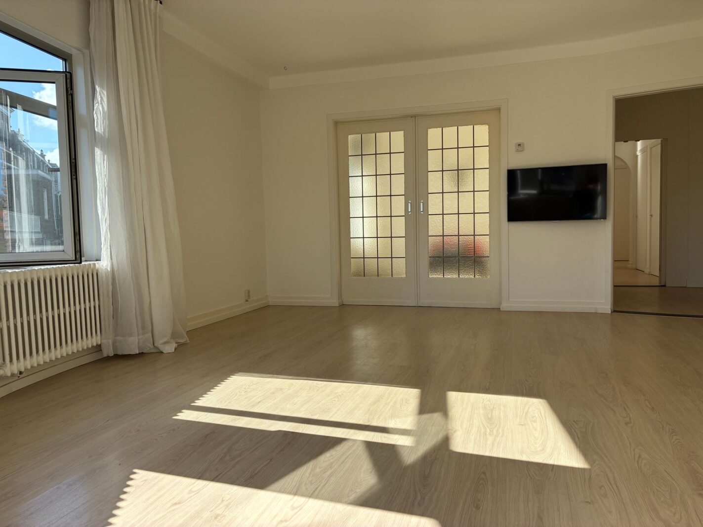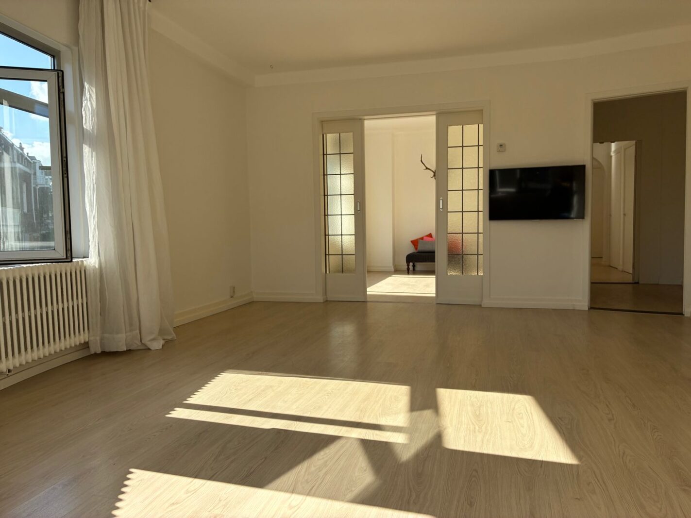 Deze woonkamer kenmerkt zich door grote ramen en een zeer lichte en zonnige uitstraling met grote raampartijen en originele schuifseparatie naar de eetkamer (woonkamer ensuite). Dankzij de slimme indeling kun je zowel via de gang als via een kleine doorloop de woonkamer bereiken, waardoor een speelse en open rondloop ontstaat.