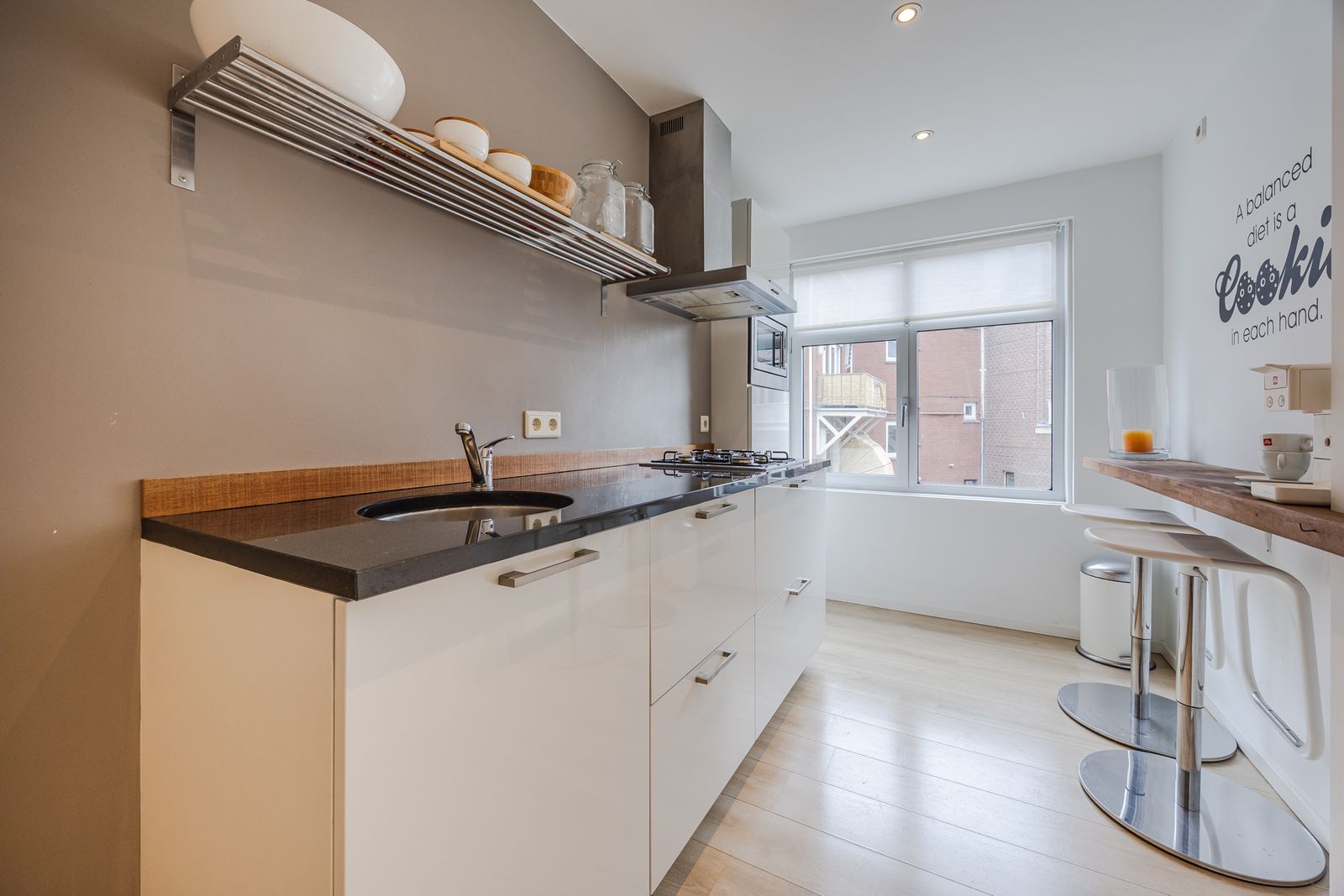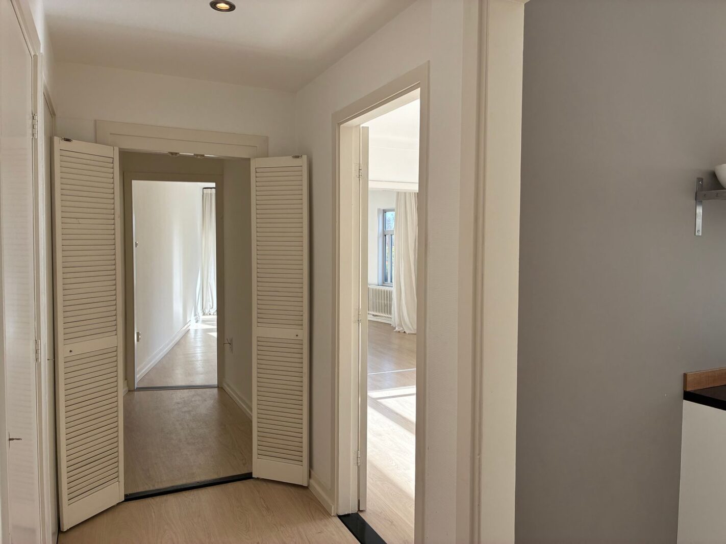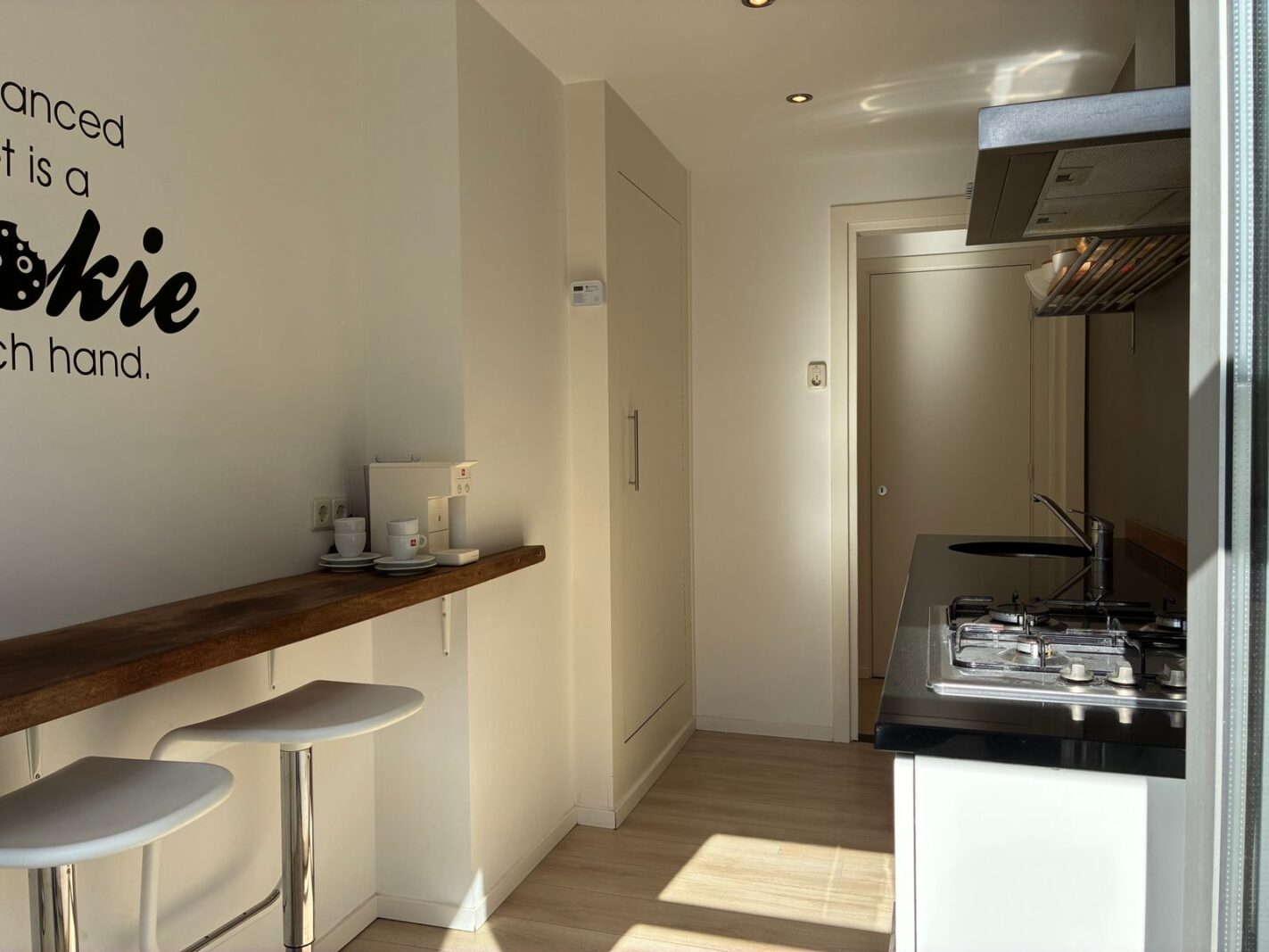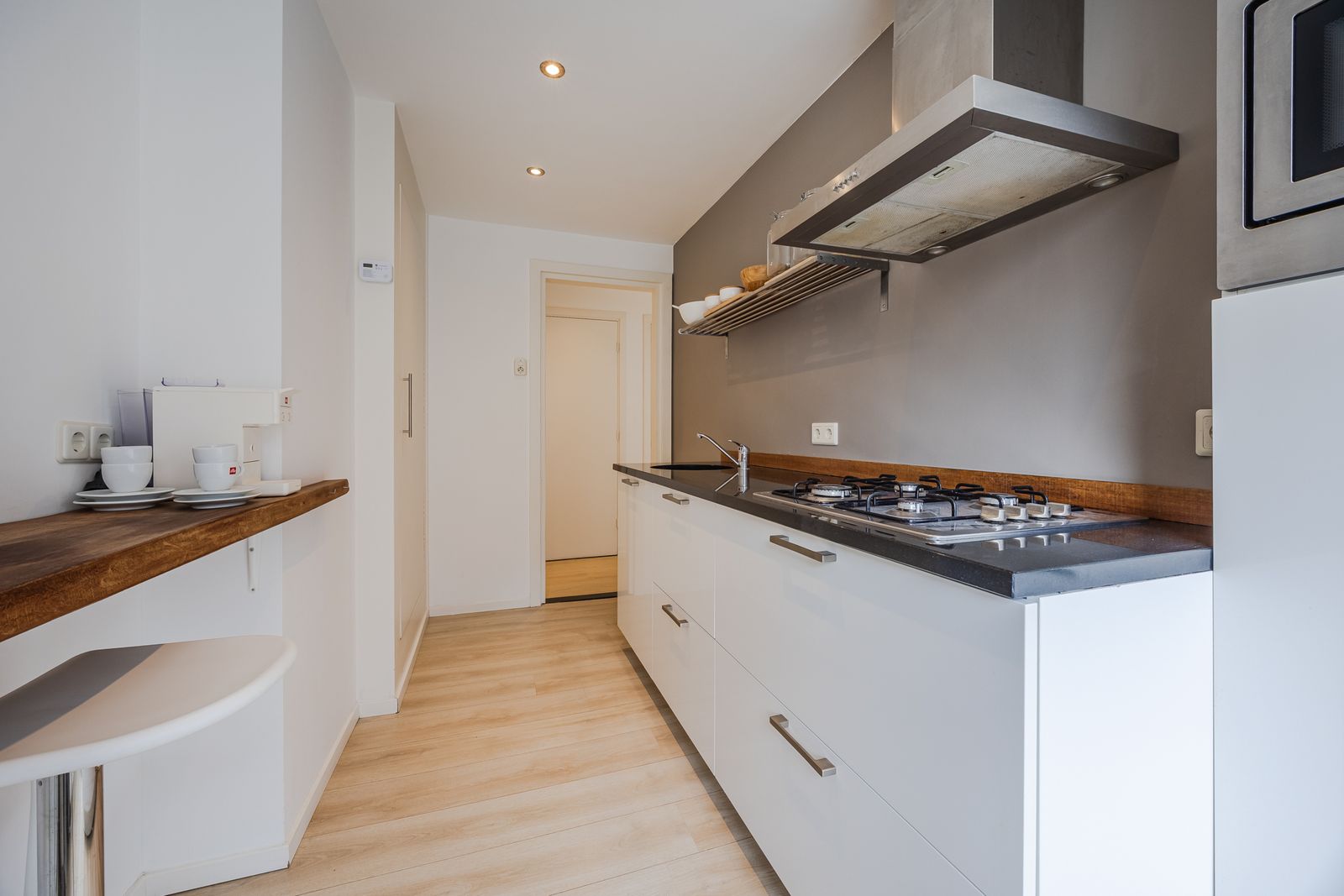 De kleine doorloop is multifunctioneel en kan uitstekend dienen als babykamer of thuiswerkplek. Daarnaast is er de mogelijkheid om een extra slaap- of werkkamer te creëren door de keuken te verplaatsen naar de woonkamer ensuite. De huidige keukenruimte kan dan worden ingericht als extra kamer.
