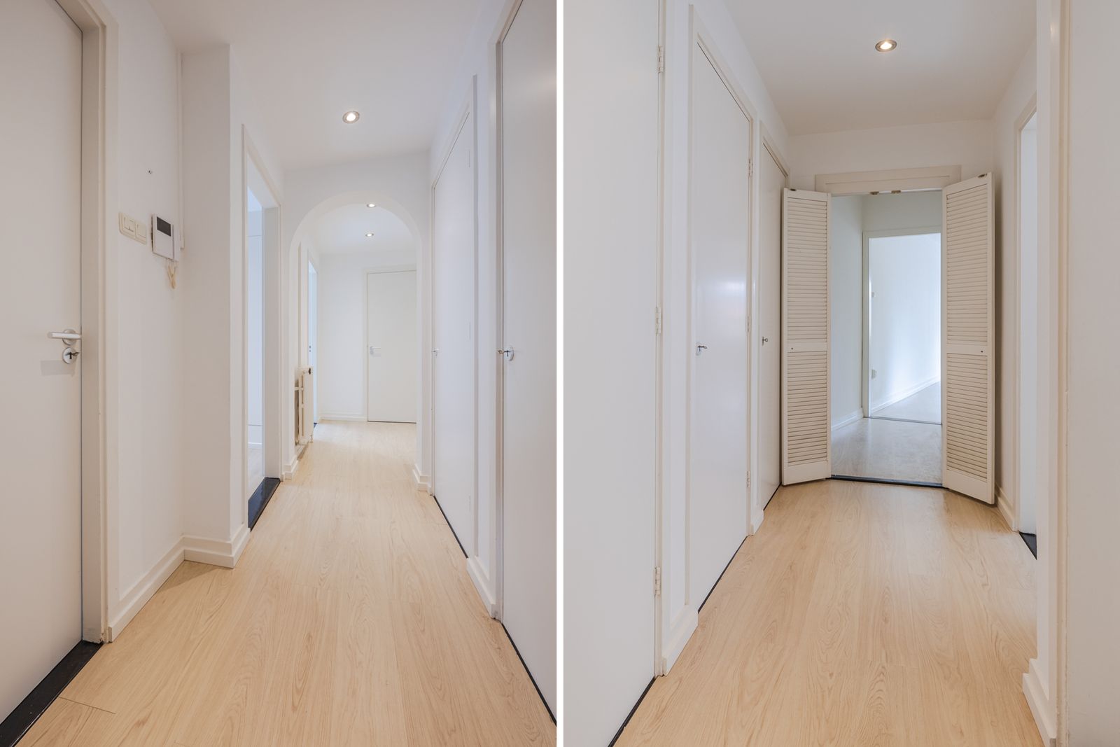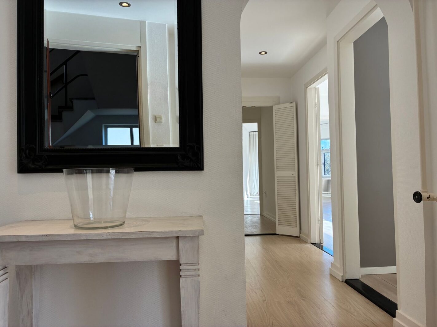 De tweede doorgang vanuit de gang leidt naar de keuken. Via de derde ingang kom je in de ruime woonkamer ensuite.