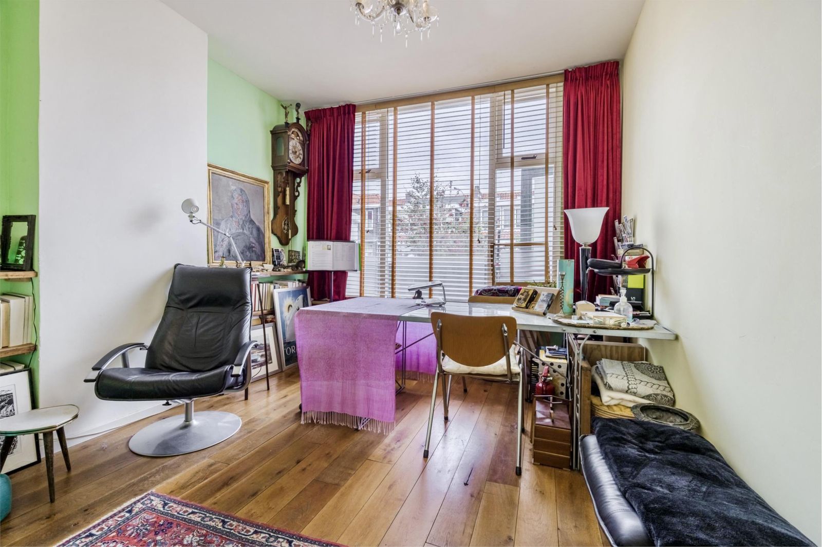 Aan de tuinzijde bevindt zich een sfeervolle werkkamer met eiken planken vloer, vensterbank en boekenplanken.