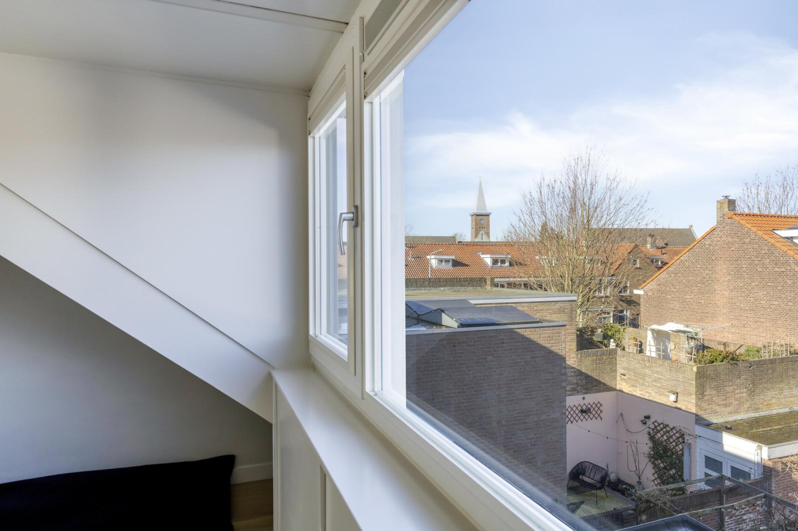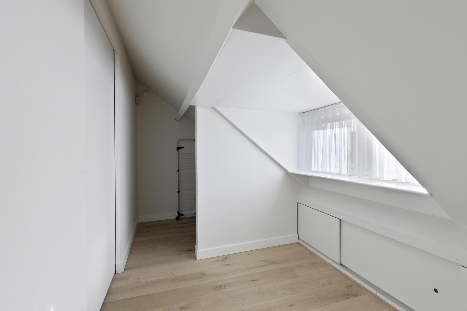 De tweede verdieping is een echte verrassing. Deze verdieping is in 2024 opnieuw ingedeeld en biedt daardoor een eigentijdse en slimme invulling van de beschikbare ruimte. Aan de voorzijde bevindt zich de voorzolder met praktische bergruimte, waarna je via een schuifdeur toegang krijgt tot een bijzonder royale derde slaapkamer. De dakkapel vergroot niet alleen het vloeroppervlak, maar brengt ook een prettige hoeveelheid daglicht binnen. Extra opbergruimte onder de dakkapel maakt het geheel nog functioneler. Ook hier is een airco-unit aanwezig, waardoor deze verdieping zich het hele jaar door comfortabel laat gebruiken. Of je hier nu een volwaardige slaapkamer, rustige thuiswerkplek of luxe logeerruimte van maakt, deze etage voegt zichtbaar waarde toe aan het woonplezier.
