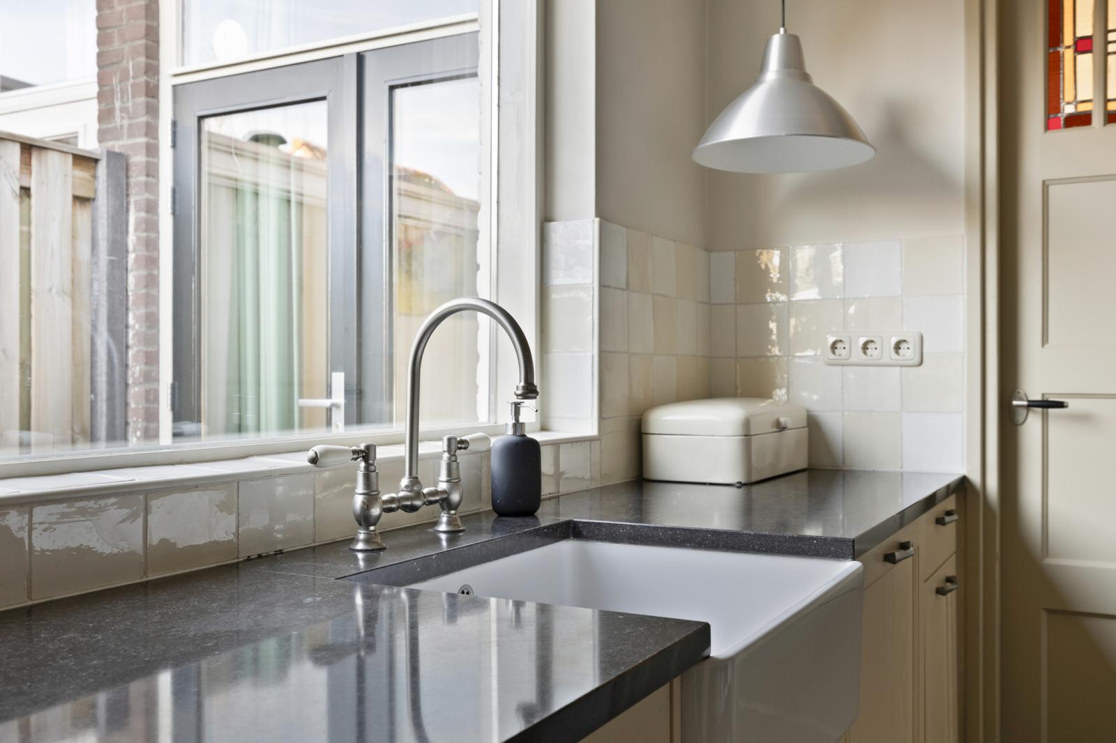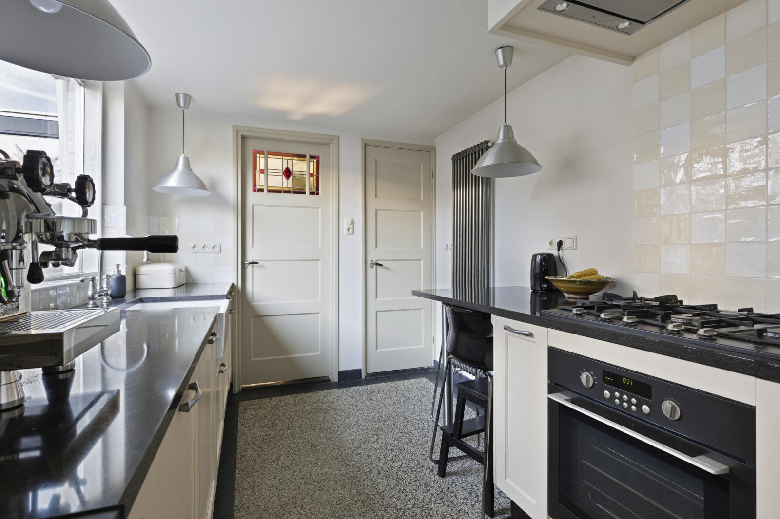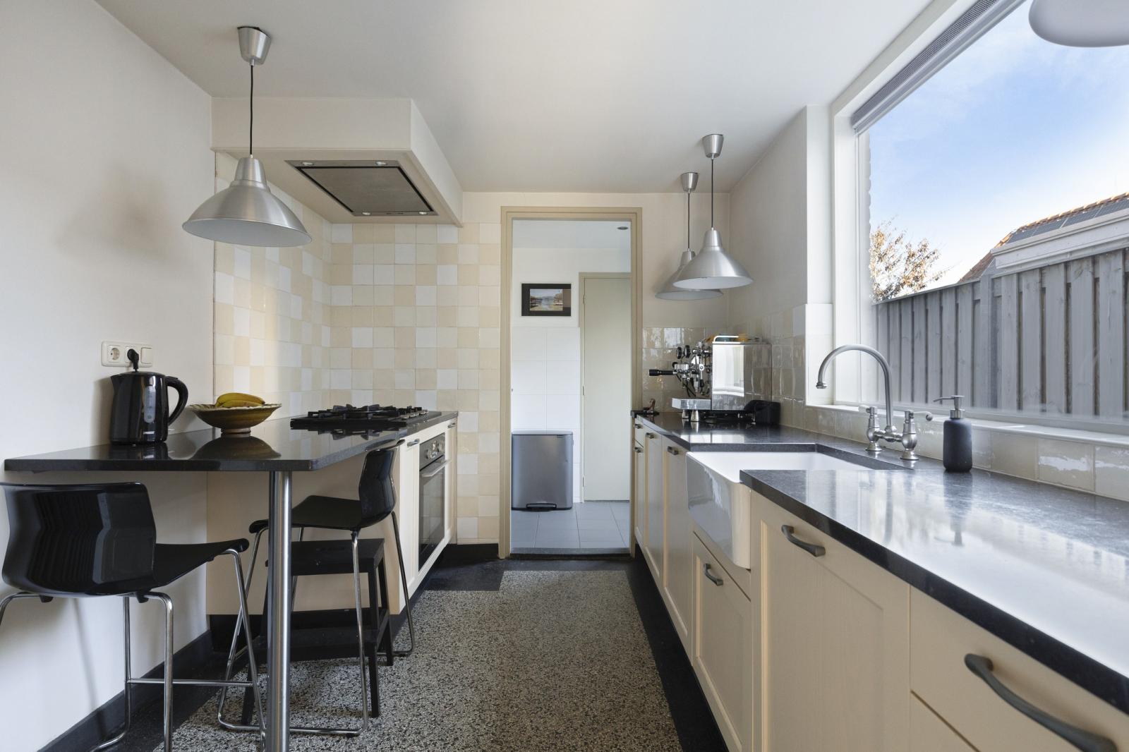 Aan de tuinzijde bevindt zich de keuken, modern van uitvoering en praktisch van opzet. Hier vind je de hedendaagse inbouwapparatuur en voldoende werk- en kastruimte om zowel doordeweeks als uitgebreid in het weekend prettig te kunnen koken. De opstelling is functioneel en compleet, met onder meer een ruime oven, afzuigkap, koelkast, vaatwasser en 5-pits gaskookplaat. Het informele zitje maakt dit bovendien een fijne plek om de dag rustig te beginnen met koffie en ontbijt. Vanuit de keuken is ook de kelder bereikbaar, ideaal als extra provisie- of bergruimte. Aansluitend bevinden zich de bijkeuken, het separate toilet en de badkamer met douchebad en wastafelmeubel, waardoor de begane grond verrassend compleet is ingericht.