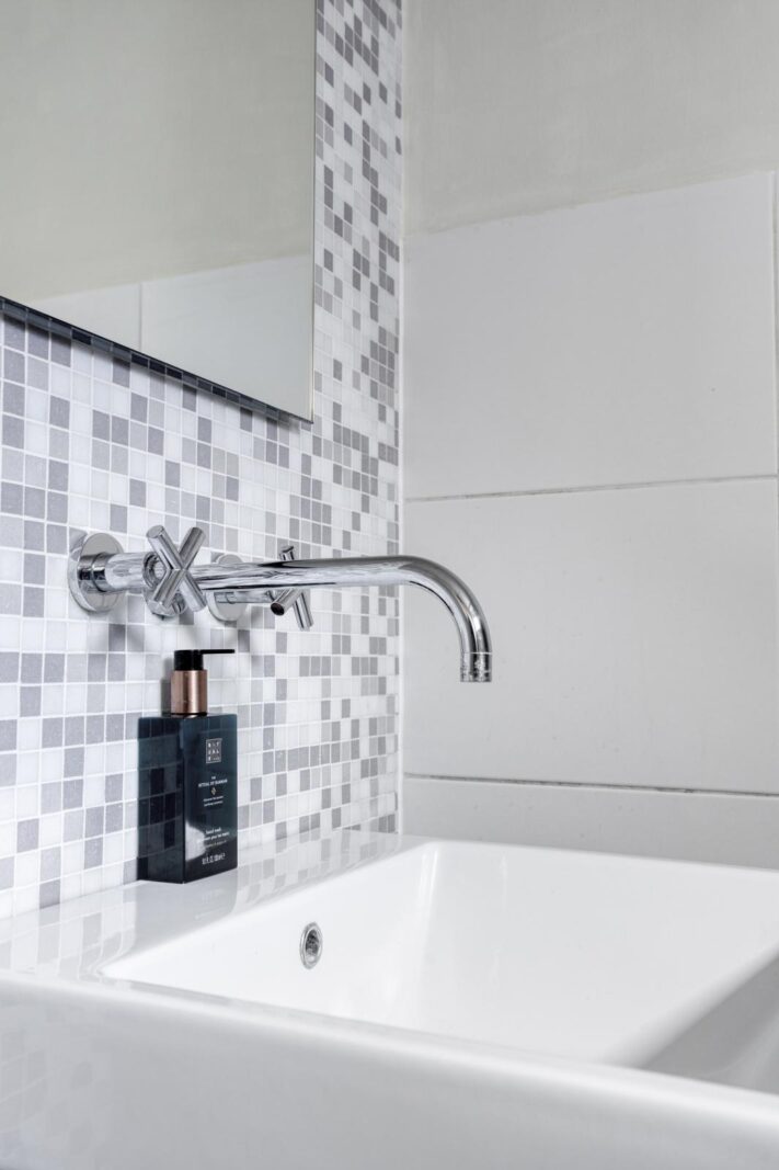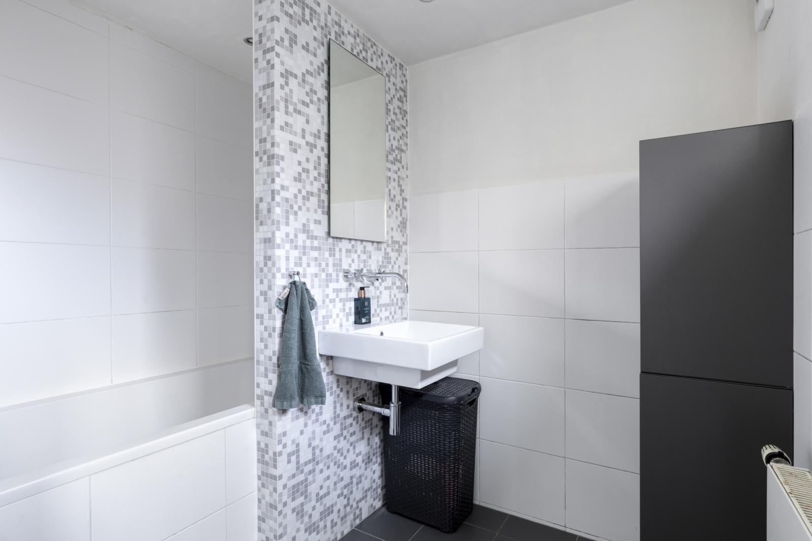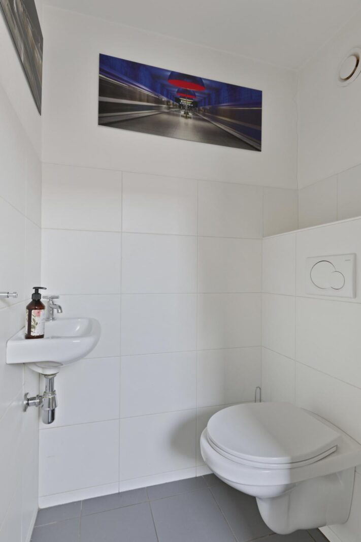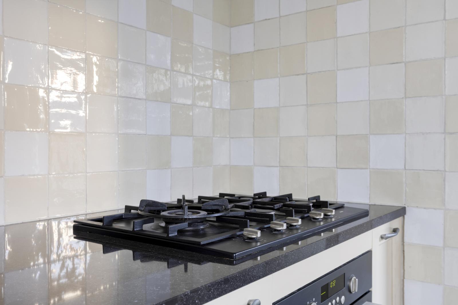Aan de tuinzijde bevindt zich de keuken, modern van uitvoering en praktisch van opzet. Hier vind je de hedendaagse inbouwapparatuur en voldoende werk- en kastruimte om zowel doordeweeks als uitgebreid in het weekend prettig te kunnen koken. De opstelling is functioneel en compleet, met onder meer een ruime oven, afzuigkap, koelkast, vaatwasser en 5-pits gaskookplaat. Het informele zitje maakt dit bovendien een fijne plek om de dag rustig te beginnen met koffie en ontbijt. Vanuit de keuken is ook de kelder bereikbaar, ideaal als extra provisie- of bergruimte. Aansluitend bevinden zich de bijkeuken, het separate toilet en de badkamer met douchebad en wastafelmeubel, waardoor de begane grond verrassend compleet is ingericht.