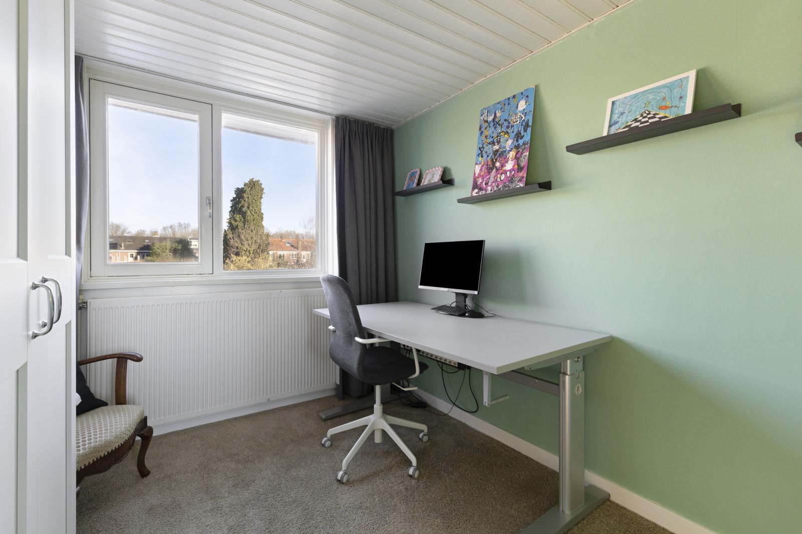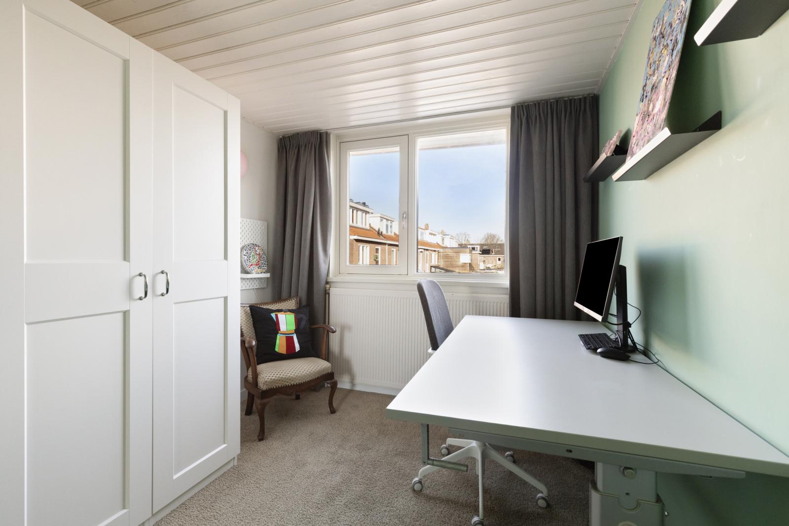 Op de eerste verdieping zet de prettige sfeer zich moeiteloos voort. De overloop geeft toegang tot twee volwaardige kamers en de vaste trap naar de zolderverdieping. Een airco-unit op deze etage zorgt voor extra comfort, zowel tijdens warme zomerdagen als in de koudere maanden. De slaapkamer aan de voorzijde is royaal van formaat en heeft een rustige, verzorgde uitstraling. Dankzij de lichtinval en de praktische indeling voelt deze ruimte ruim en ontspannen aan. De aanwezige bergkast en het wastafelmeubel maken deze kamer extra comfortabel in dagelijks gebruik. De tweede kamer, gelegen aan de achterzijde, is eveneens licht en netjes onderhouden. Dat maakt het een veelzijdige ruimte die zich gemakkelijk laat inrichten als kinder- of logeerkamer, werkkamer, hobbyruimte of kleedkamer.