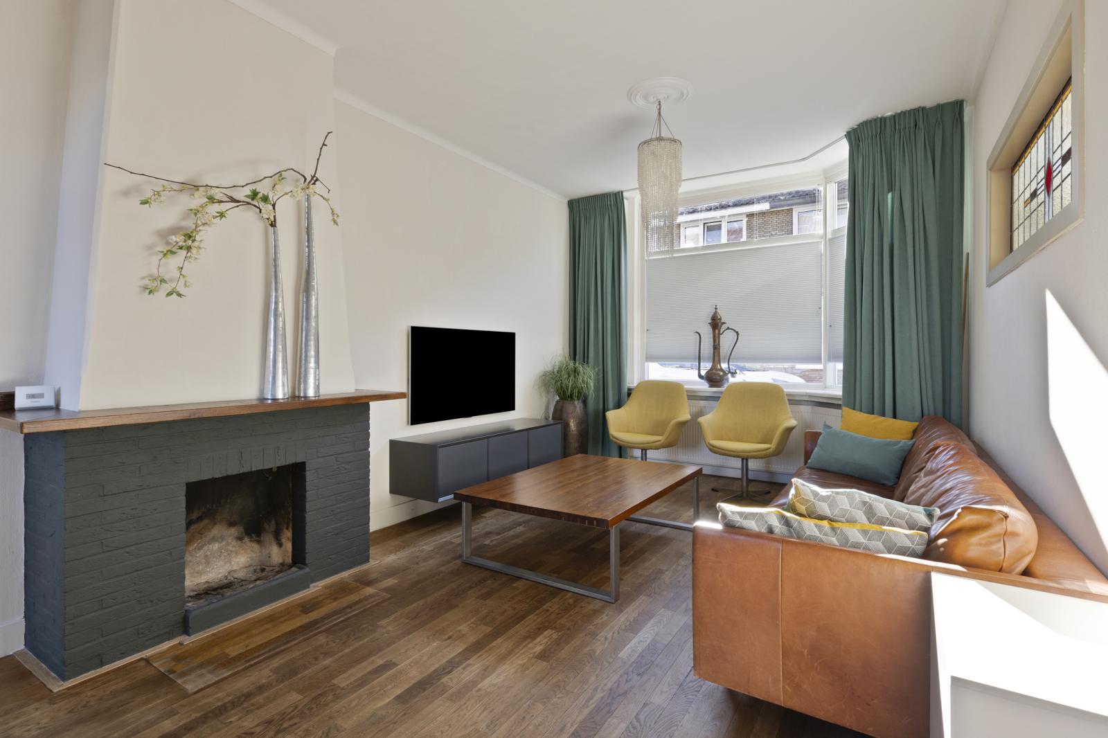-Royale woonkamer met veel lichtinval, houten parketvloer en open haard