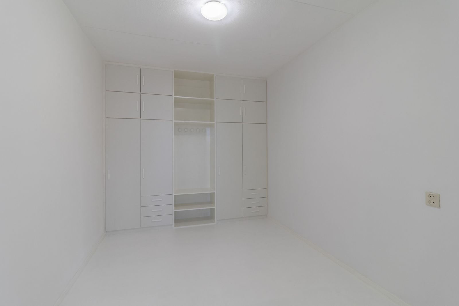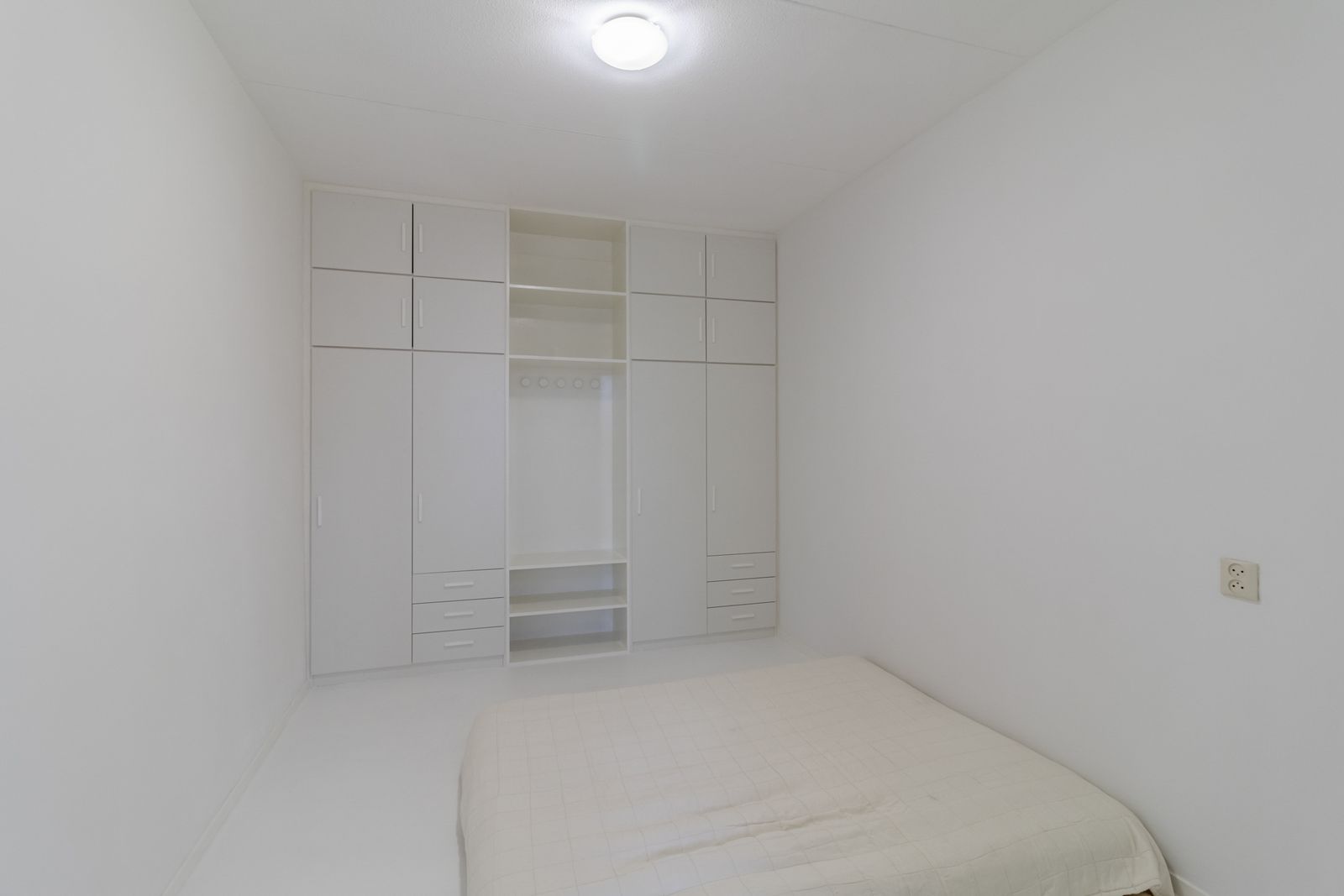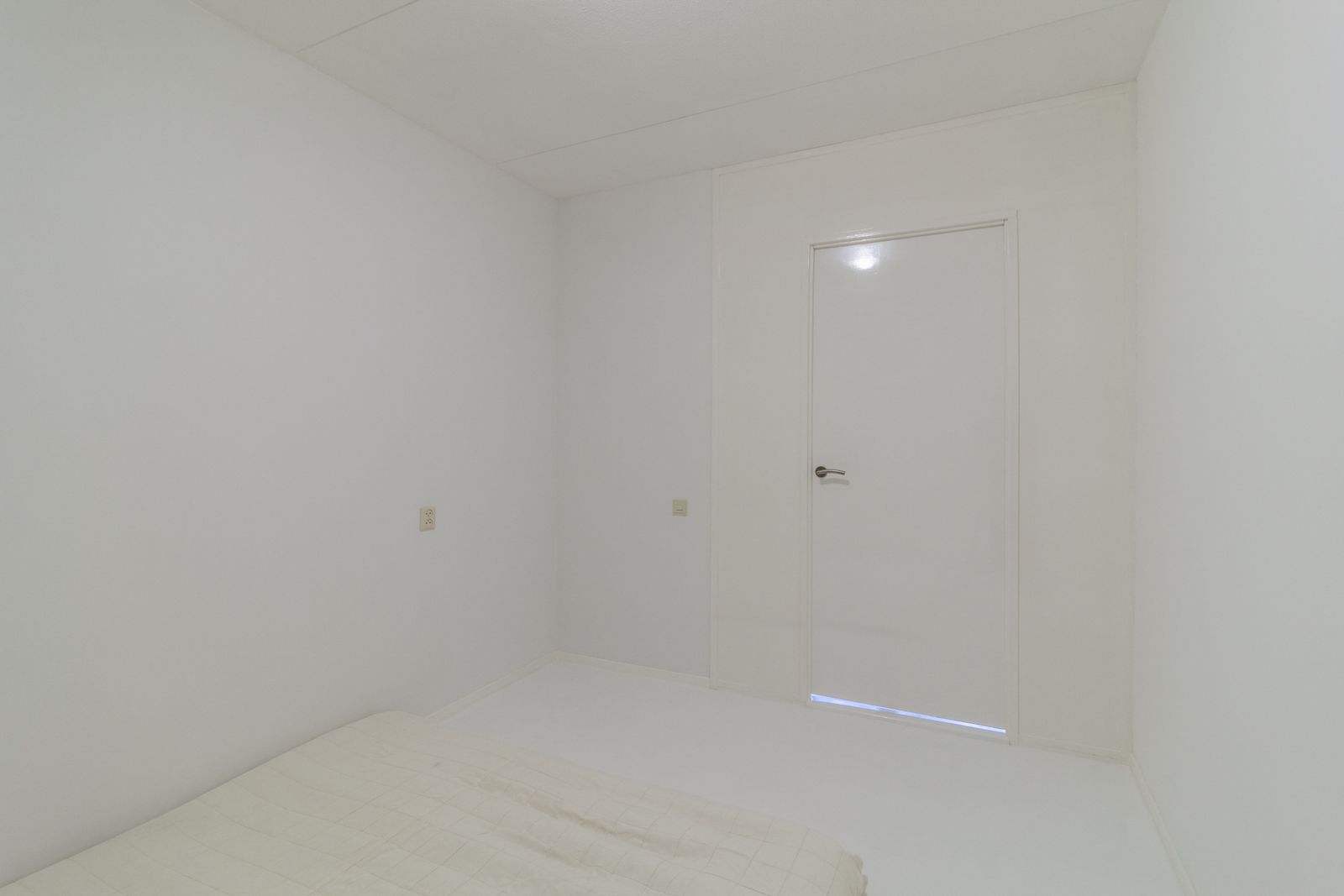 De slaapkamer heeft een ingebouwde, muur vullende kastenwand.