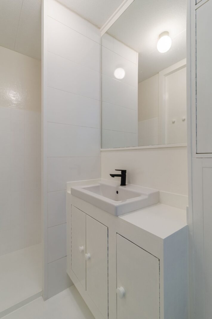 De hal van het appartement biedt toegang tot de handige berging, de lichte badkamer en de ruime, L-vormige woonkamer.