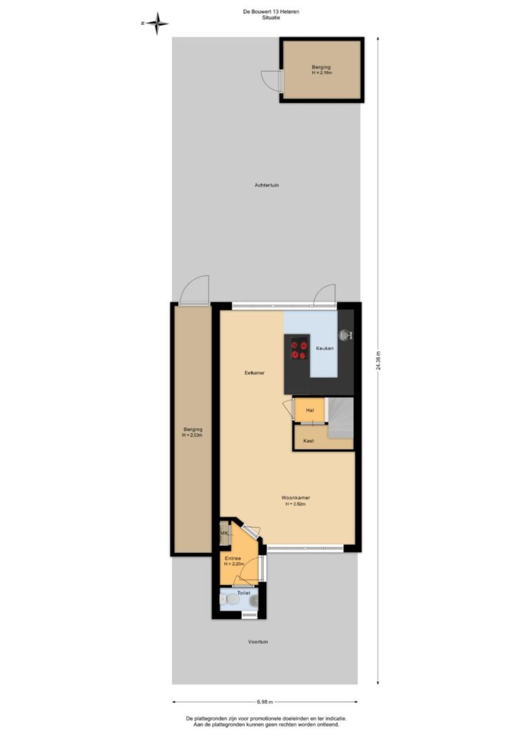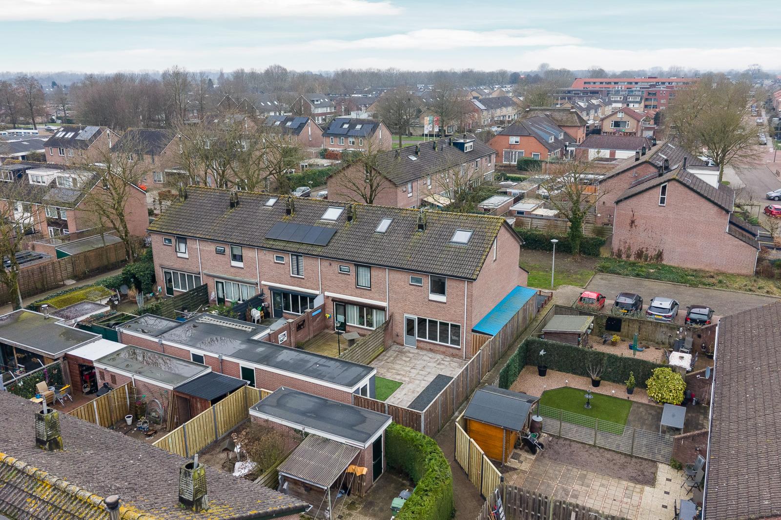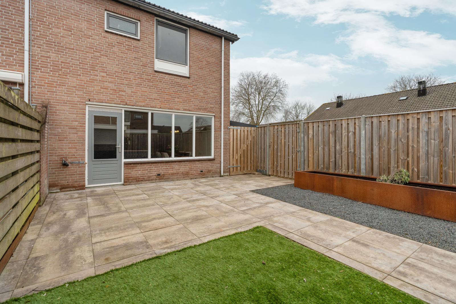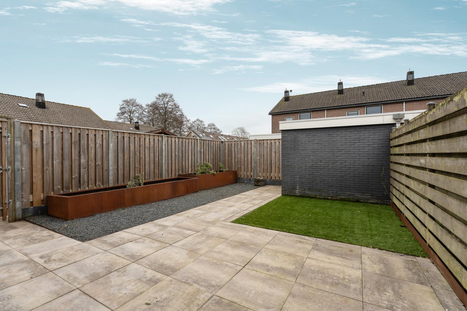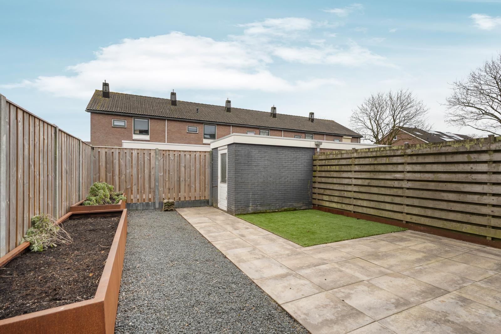 Vanuit de keuken heb je direct toegang tot de achtertuin op het oosten. Hierdoor kun je in de ochtend heerlijk genieten van een kop koffie in de zon. De tuin is onderhoudsvriendelijk ingericht en biedt ruimte voor een terras en zitgedeelte. Achterin de tuin staat een vrijstaande berging die gebruikt kan worden voor fietsen en tuinspullen. Daarnaast beschikt de woning over een aangebouwde berging, bereikbaar vanuit de achtertuin, die ideaal is voor het opbergen van overige spullen.