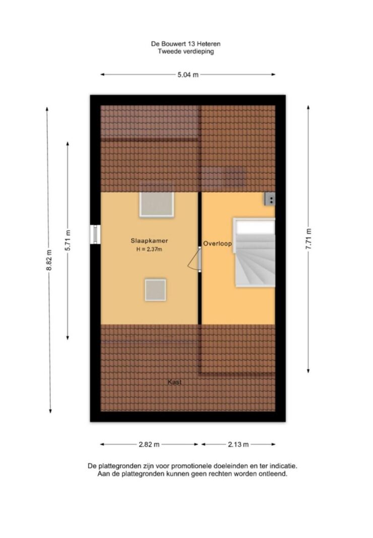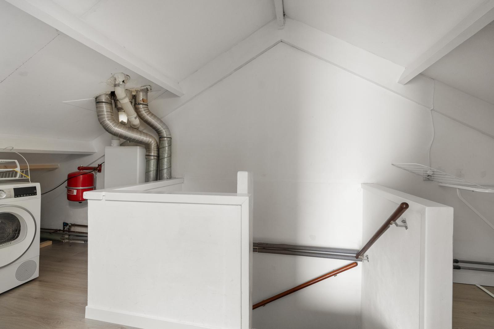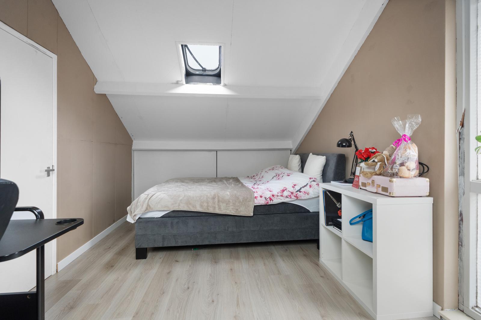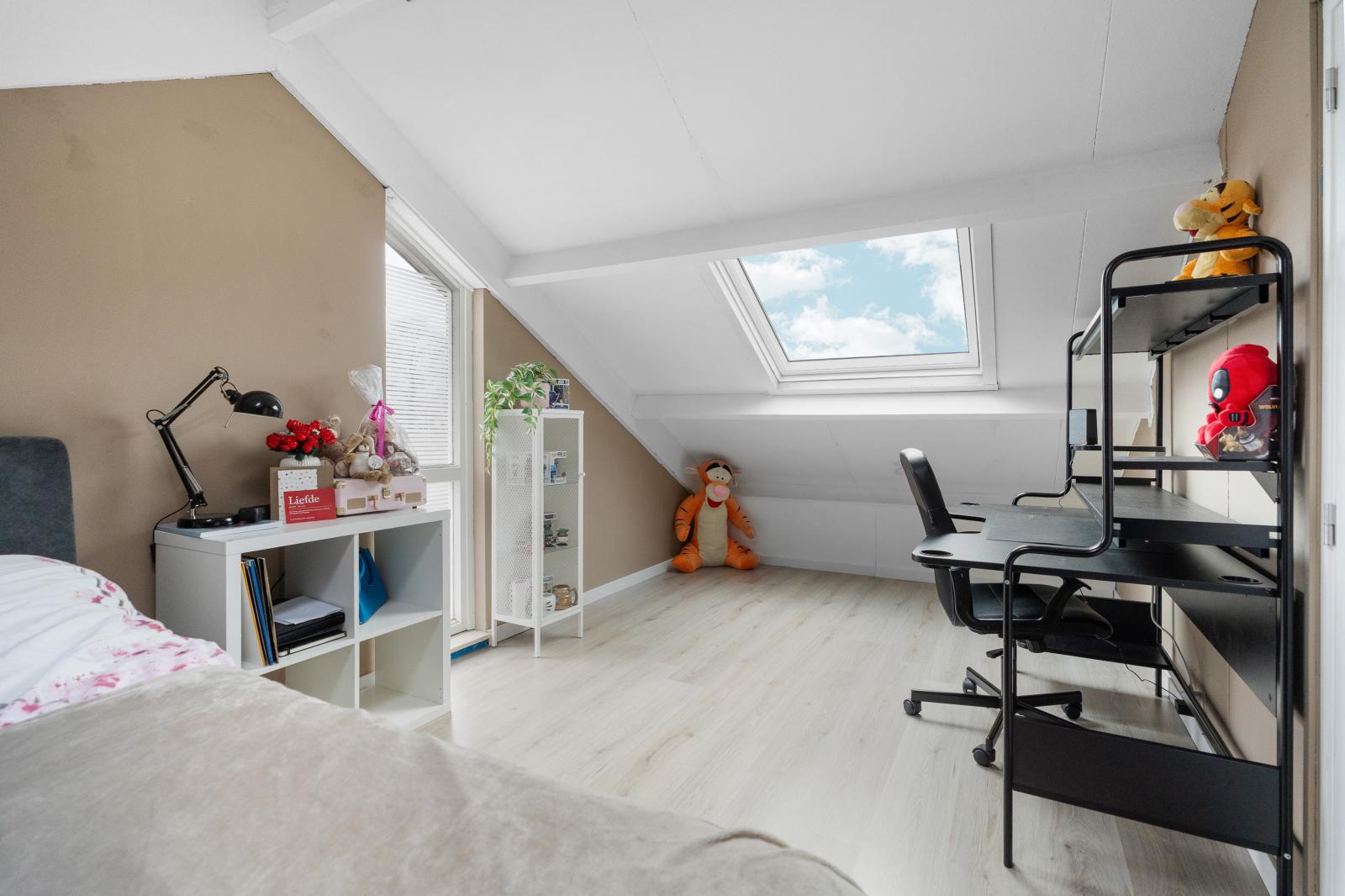 Via een vaste trap bereik je de tweede verdieping. Op de voorzolder bevindt zich de aansluiting voor de wasmachine. Vanuit hier heb je toegang tot de ruime zolderkamer met dakraam, die uitstekend gebruikt kan worden als vierde slaapkamer, werkkamer of hobbyruimte. Daarnaast is er extra bergruimte aanwezig onder het schuine dak, ideaal voor de opbergspullen. Dankzij het dakraam valt er prettig licht de ruimte binnen.