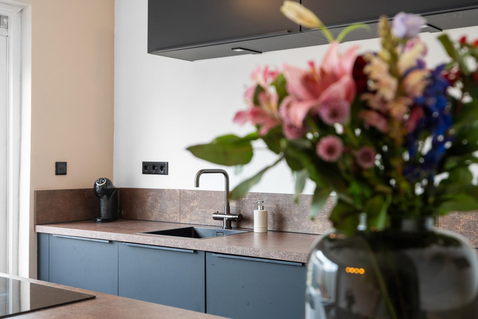 De open indeling loopt praktisch door naar de eettafel en moderne keuken. Deze indeling zorgt voor een fijne leefruimte waarin koken, eten en samenzijn samenkomen. De moderne keuken uit 2022 heeft een strak design en een praktische opstelling met volop werkblad- en kastruimte. Daarnaast is de keuken van alle gemakken voorzien en uitgerust met onder andere een Quooker, combi-oven en een inductiekookplaat met geïntegreerde afzuiging. Hier kook je met plezier terwijl je contact houdt met familie of gasten aan de eettafel.