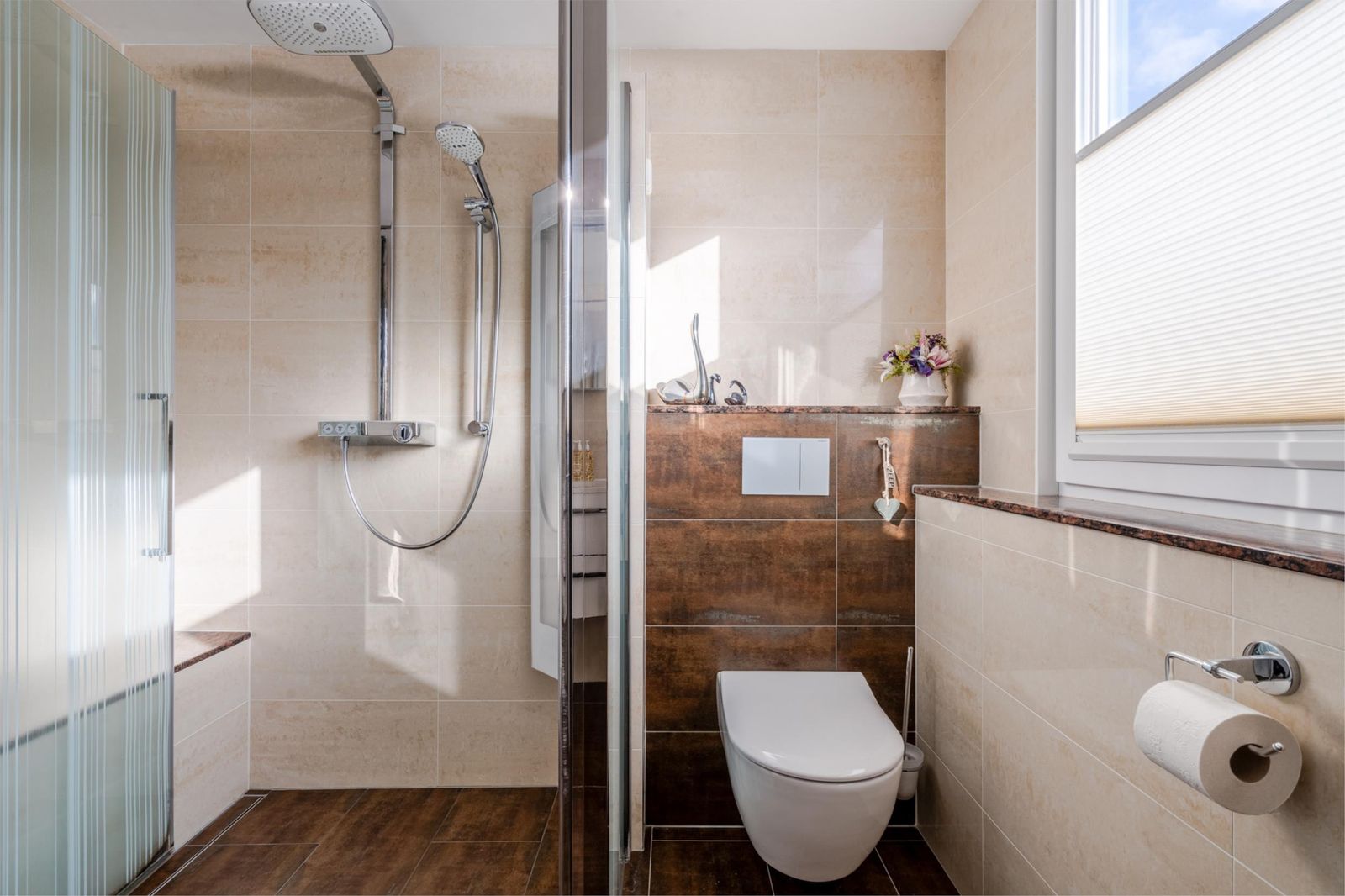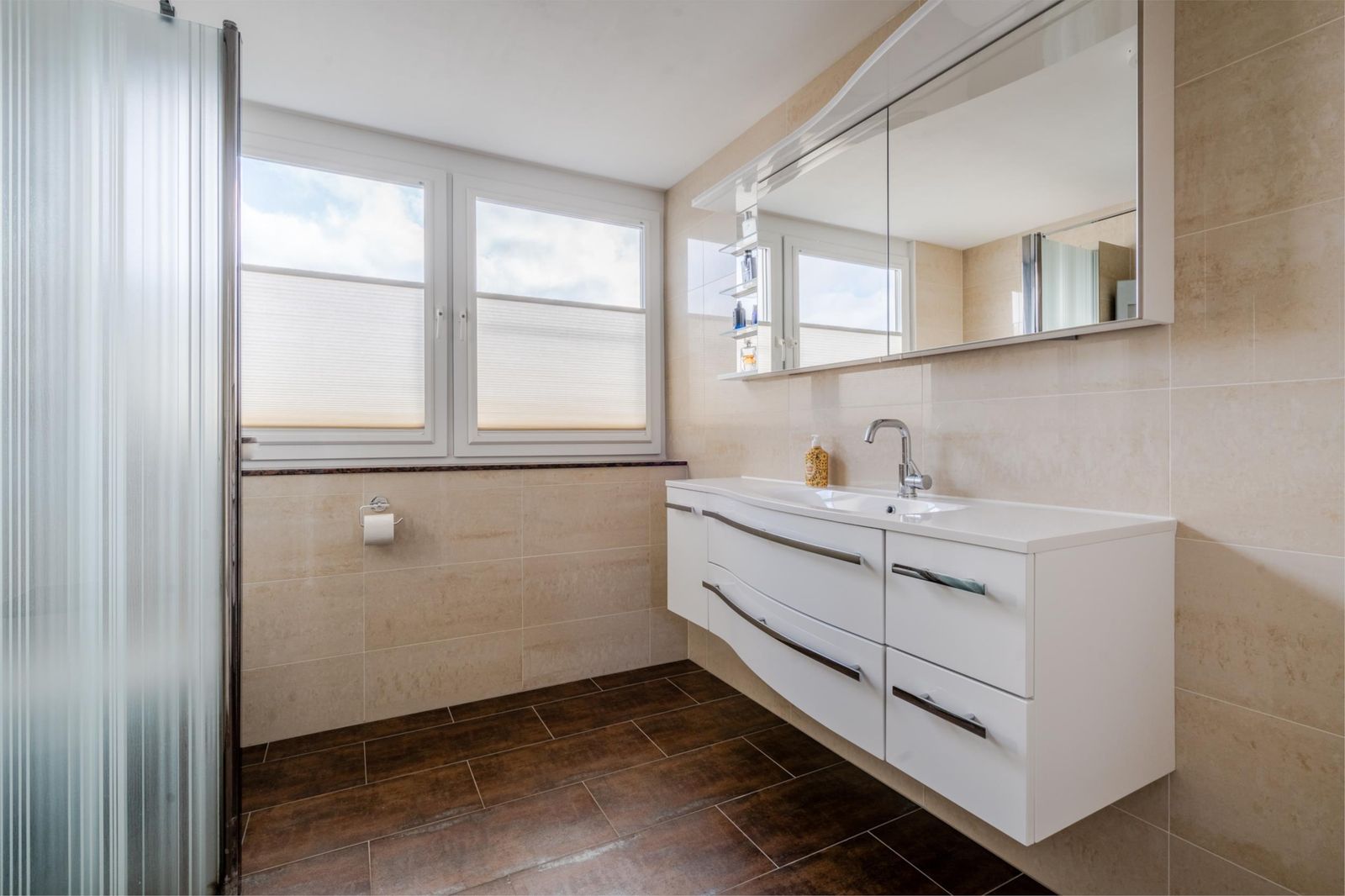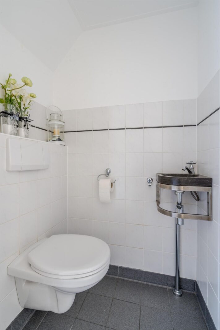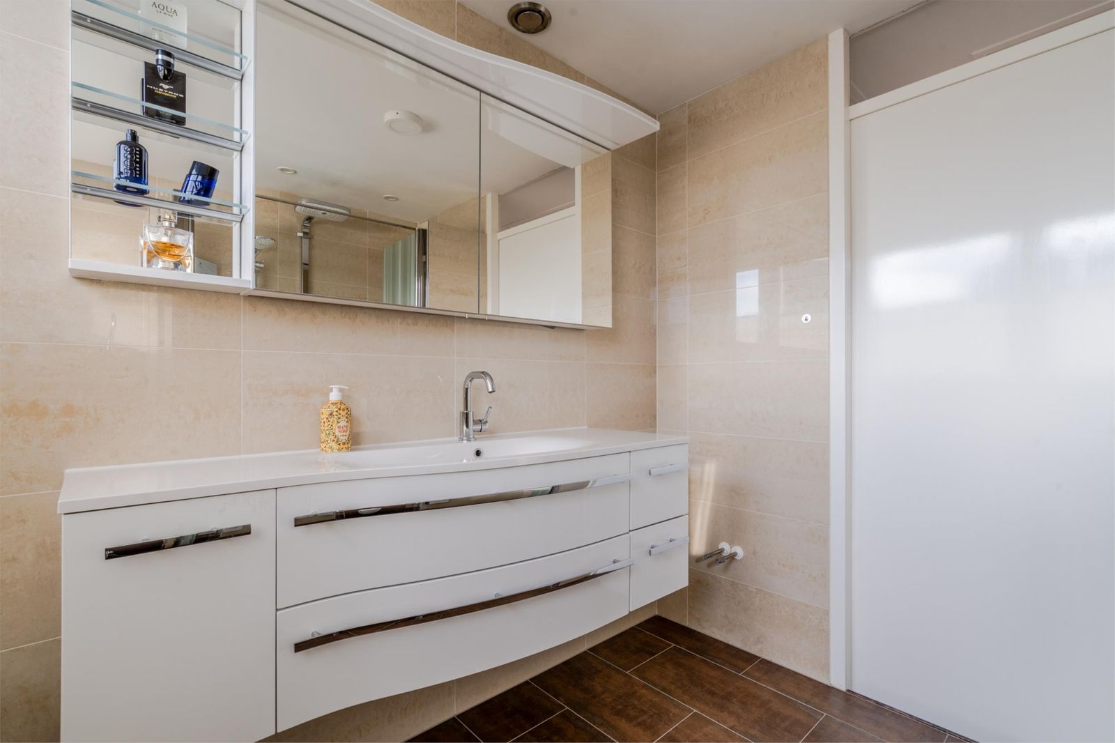 De badkamer is voorzien van een luxe douchehoek met sunshower, hangcloset, riant wastafelmeubel en vloerverwarming.