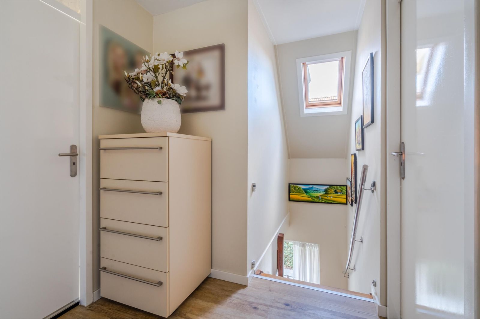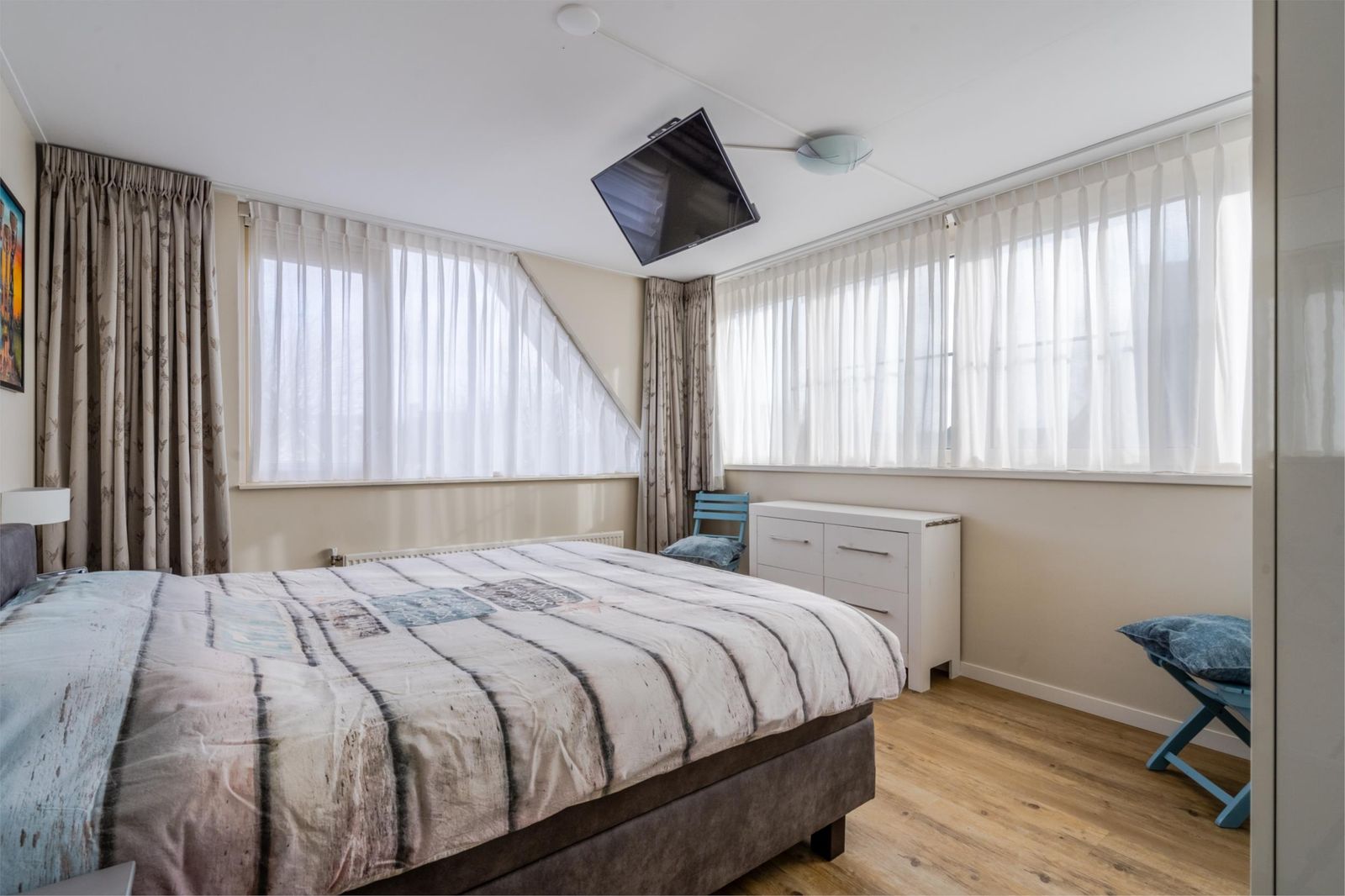 Ruime overloop met 3 riante slaapkamers, allen voorzien van een PVC-vloer. De grootste slaapkamer aan de achterzijde heeft een prachtig uitzicht over de Groote Vliet. Als u zou willen is het mogelijk om deze slaapkamer te splitsen en hier een 4e slaapkamer te creëren.