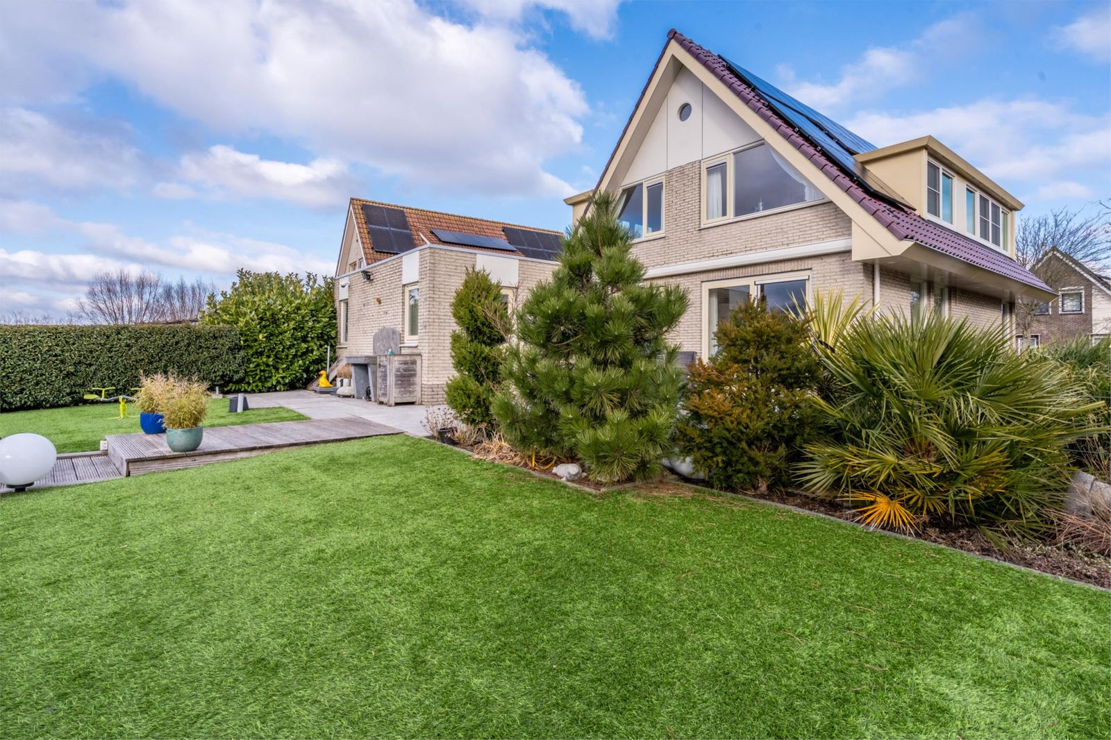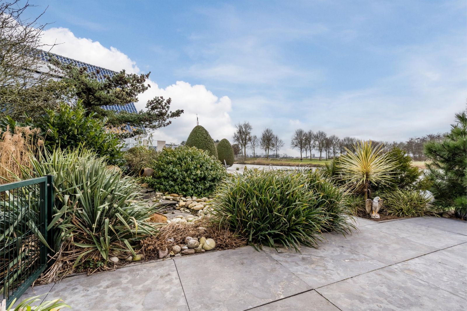 De achtertuin is gelegen op het zonnige zuidwesten. Is voorzien van een speels watervalletje, mooi kunstgras en heerlijk terras. U heeft een prachtig uitzicht op de Groote Vliet en er is een eigen haventje en steiger aanwezig waar u heerlijk een hengeltje kunt uitgooien of kunt genieten van de prachtige zonsondergang onder het genot van een kopje koffie!