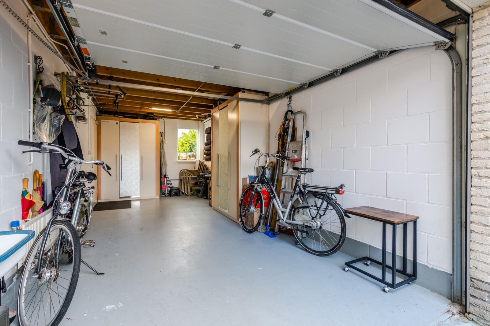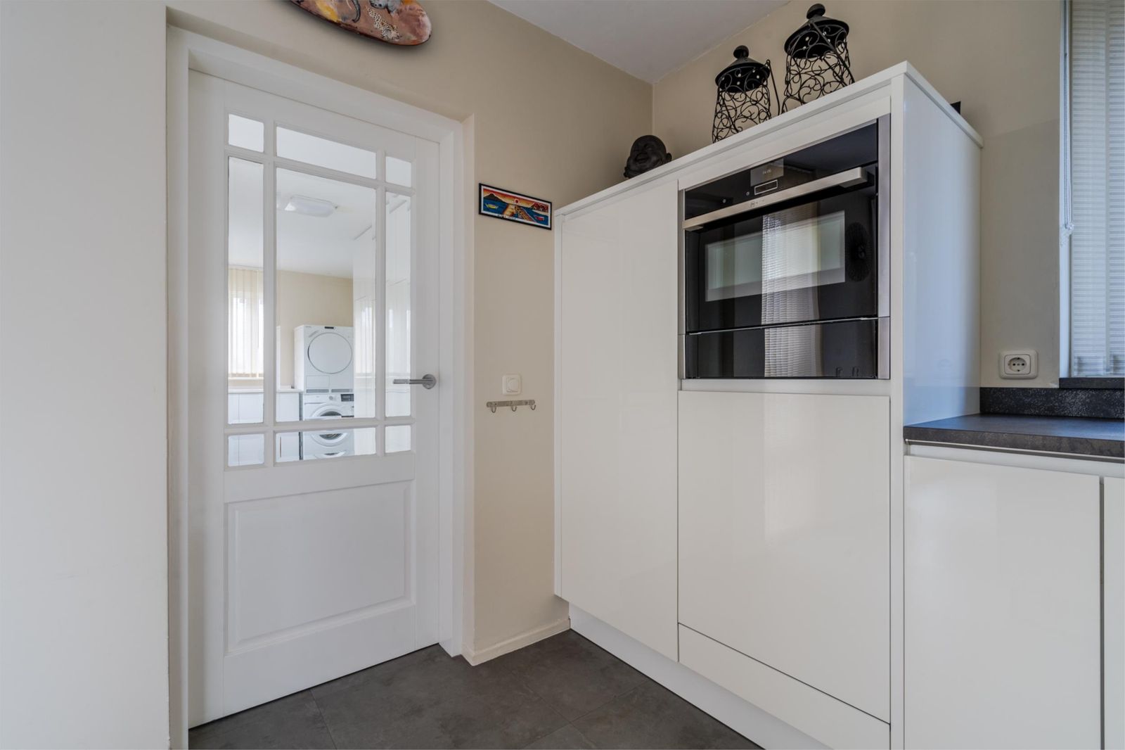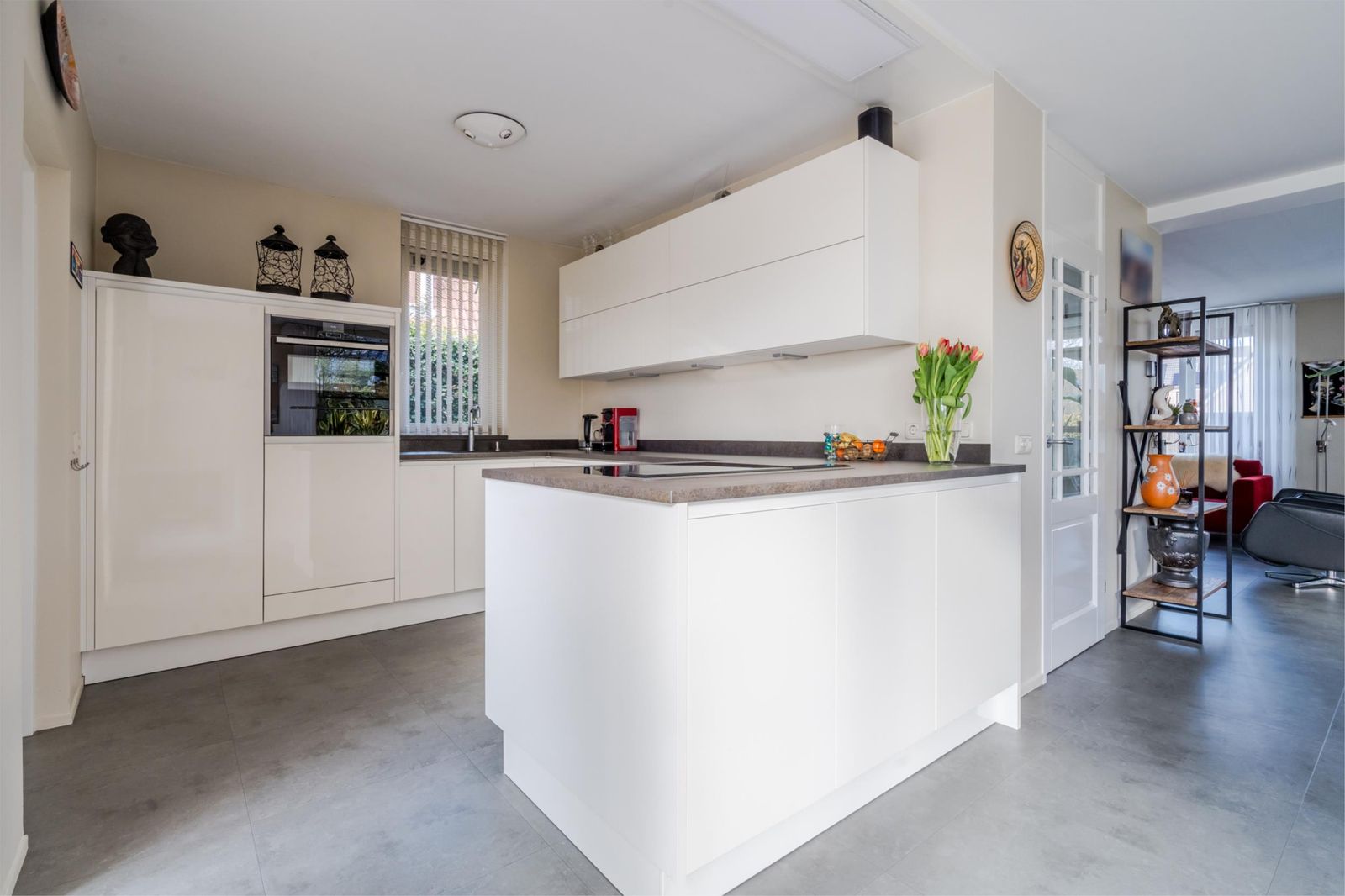 Aan de achterzijde treft u de moderne open keuken aan met een stijlvol werkblad en veel kastruimte. De keuken is voorzien van een kookschiereiland met een 5-pits inductiekookplaat, verzonken afzuigkap, fraaie verlichting, combimagnetron, vaatwasser en koelkast. Aansluitend komen we in de ruime bijkeuken met een vaste kastenwand, witgoedaansluitingen en loopdeur naar de achtertuin. Via de bijkeuken is de garage inpandig te bereiken. De garage beschikt over een elektrisch bedienbare deur.
