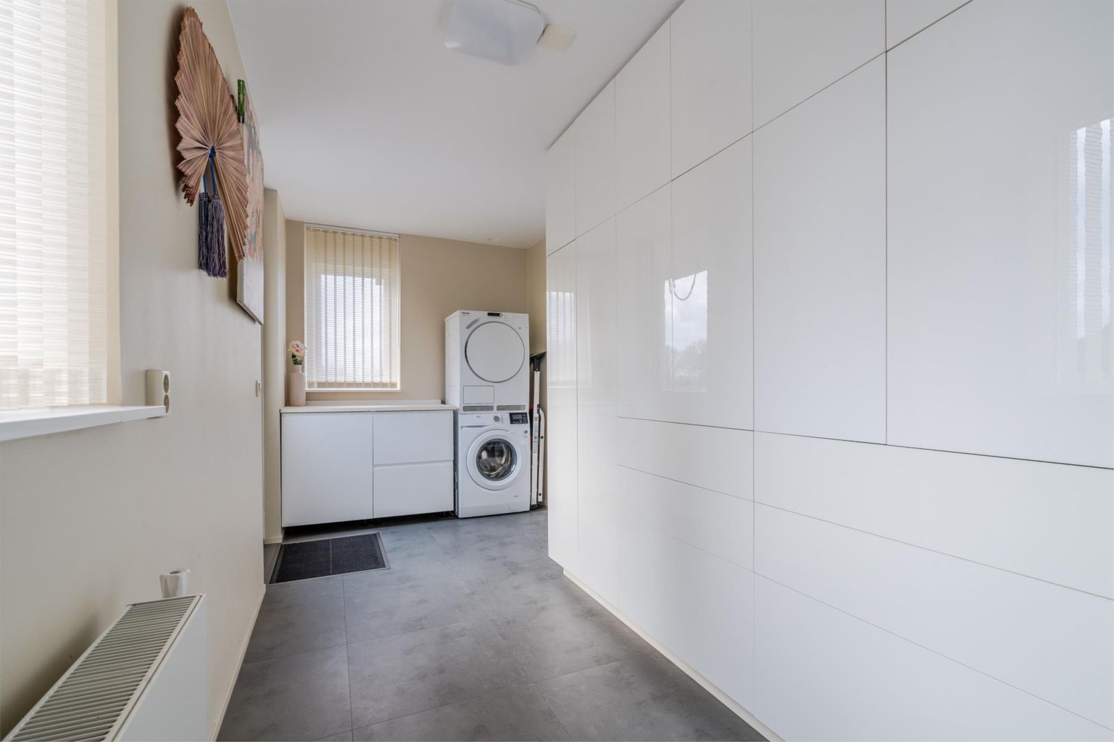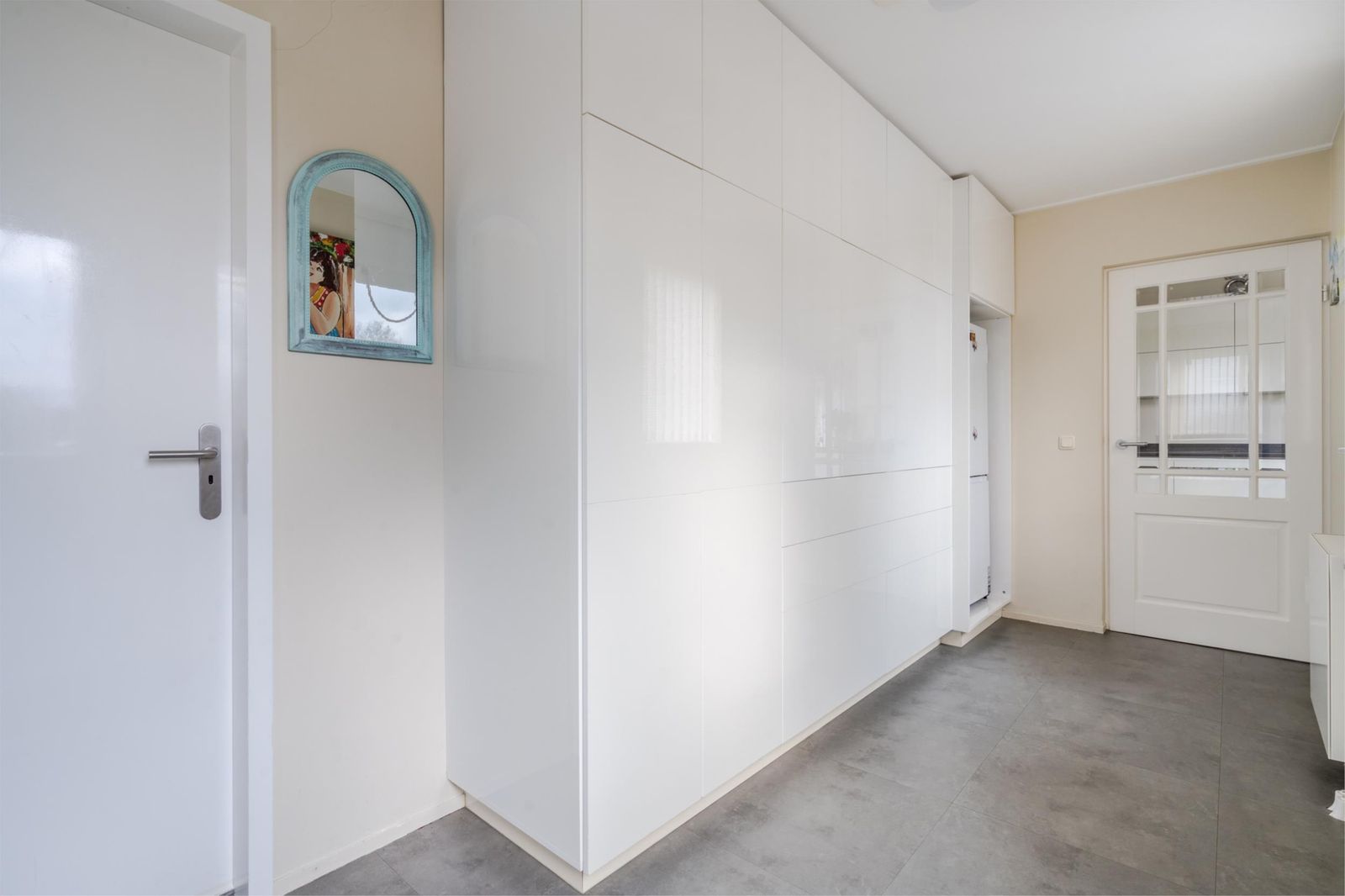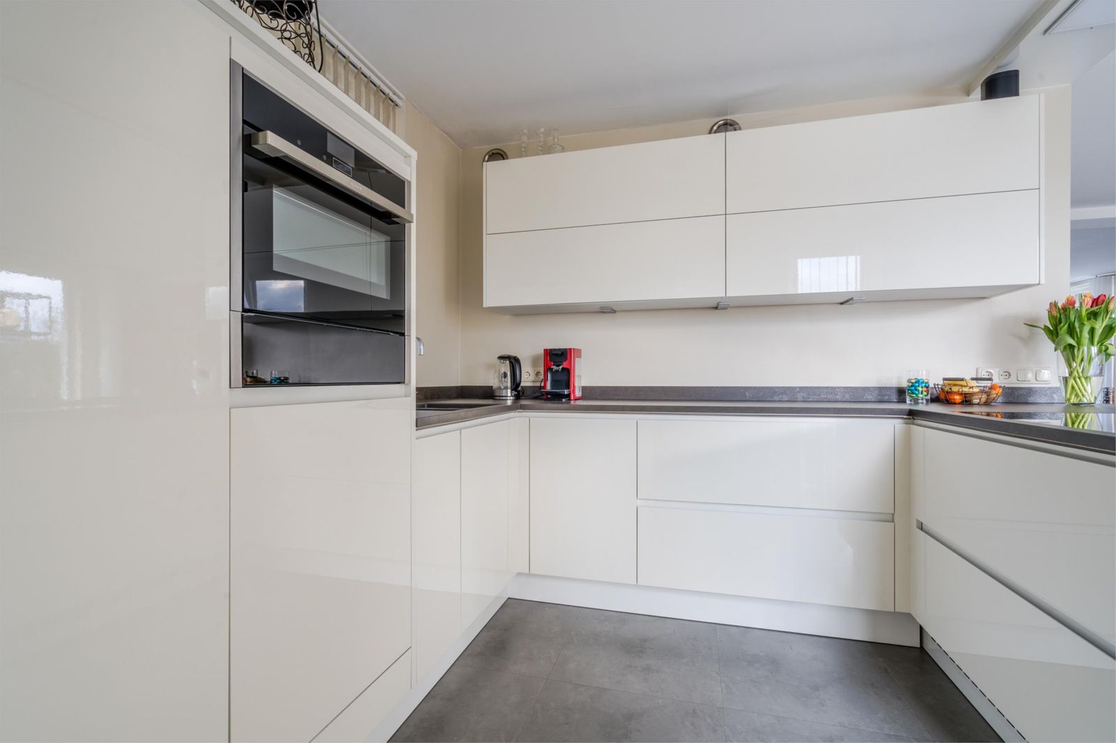 Aan de achterzijde treft u de moderne open keuken aan met een stijlvol werkblad en veel kastruimte. De keuken is voorzien van een kookschiereiland met een 5-pits inductiekookplaat, verzonken afzuigkap, fraaie verlichting, combimagnetron, vaatwasser en koelkast. Aansluitend komen we in de ruime bijkeuken met een vaste kastenwand, witgoedaansluitingen en loopdeur naar de achtertuin. Via de bijkeuken is de garage inpandig te bereiken. De garage beschikt over een elektrisch bedienbare deur.