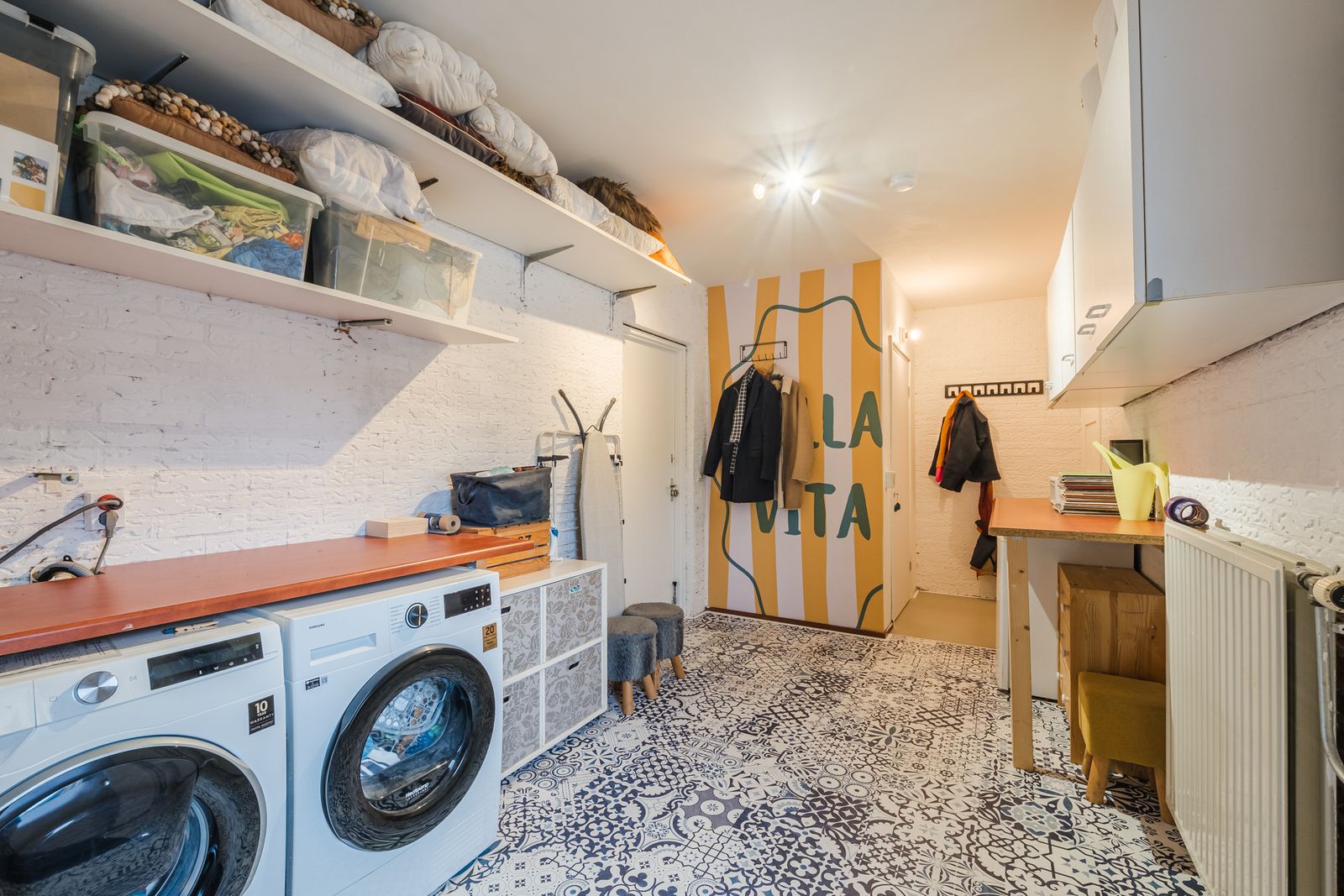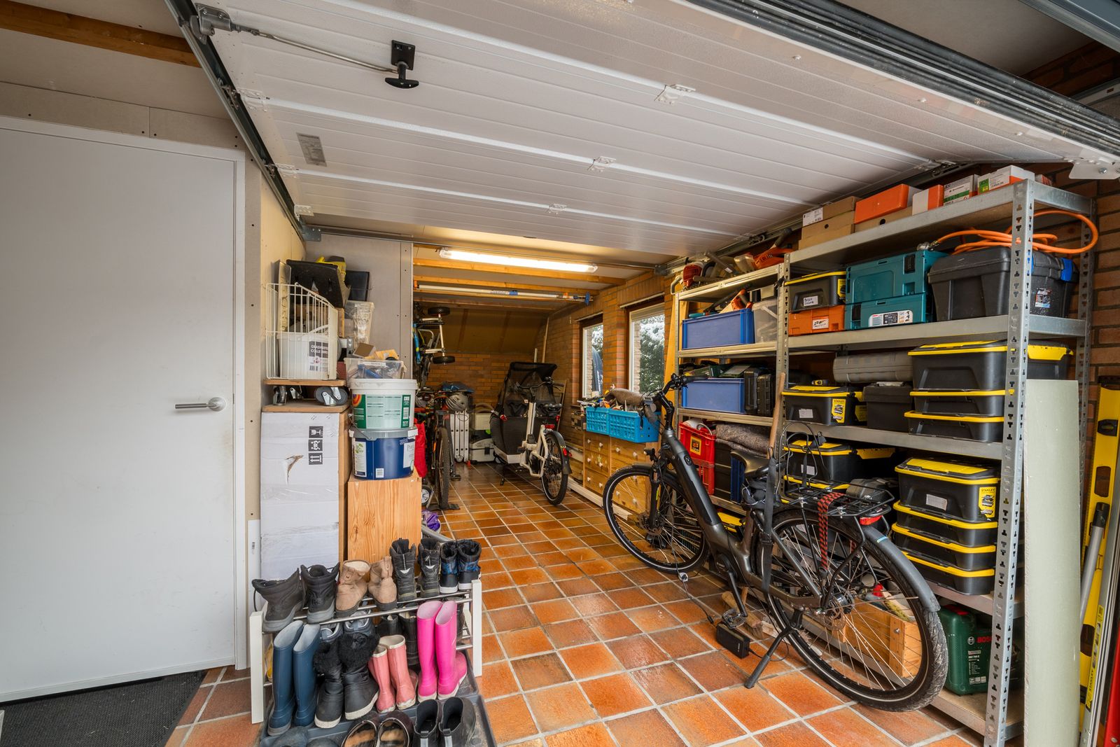 Op de begane grond is er grenzend aan de keuken een bijkeuken van 16m2, deze heeft een dubbele aansluiting voor wasmachines. Ook vindt u hier een afgesloten ruimte met CV-ketel en voorraadkast, een deur naar de tuin en een extra wasbak. Via een hal grenzend aan de bijkeuken loopt u naar een extra kamer die op dit moment als werkkamer wordt gebruikt. Ook bereikt u via deze hal de geïsoleerde garage (18m2). Met een vaste trap is de ruimte (9m2) boven de garage te bereiken, hier is een slaapkamer en extra bergruimte te vinden.