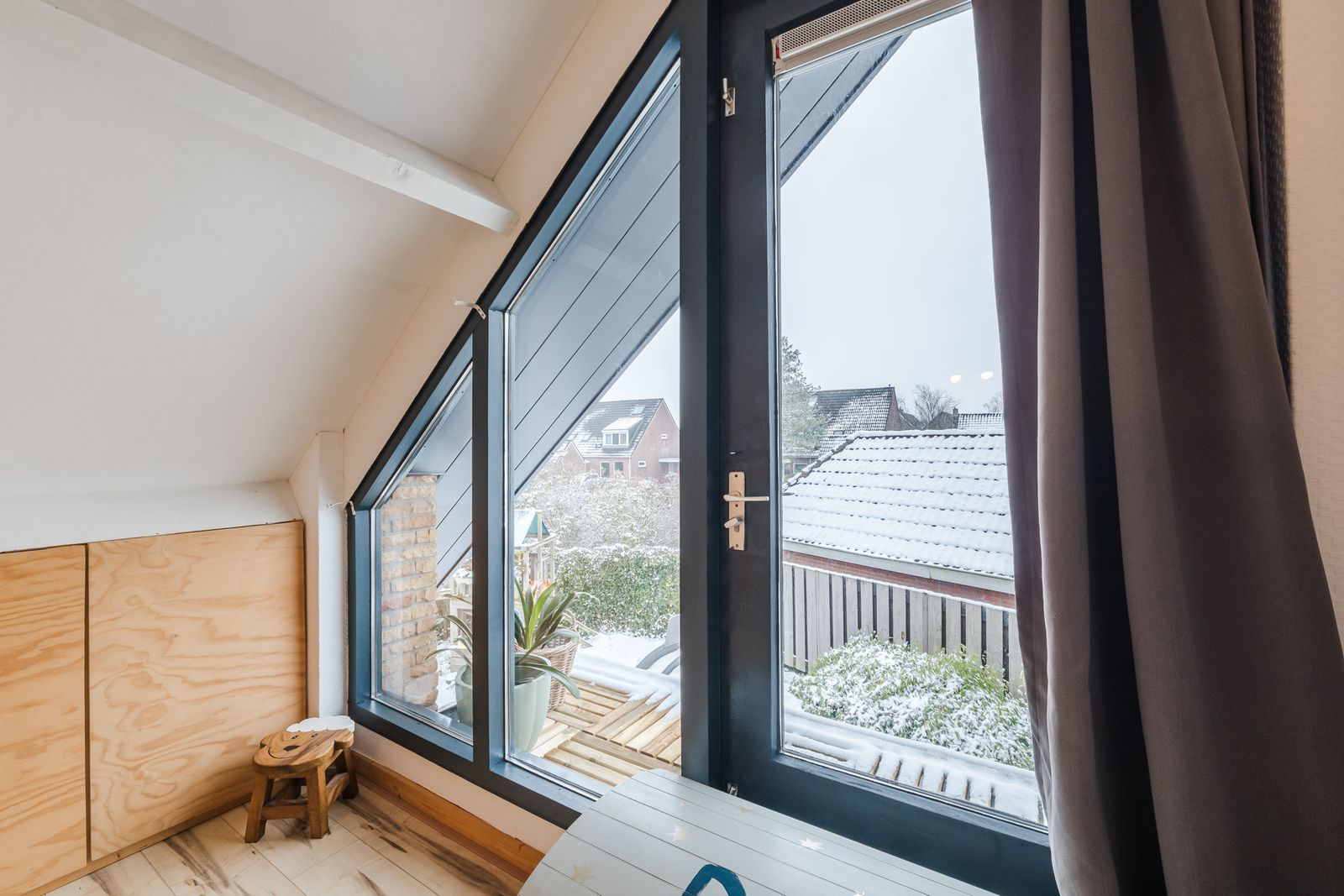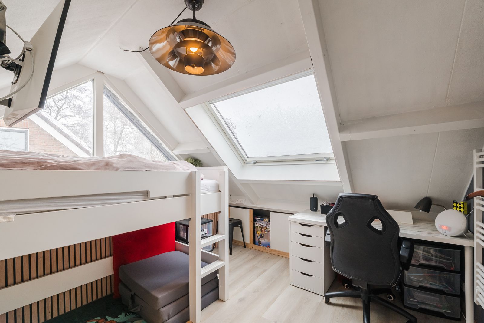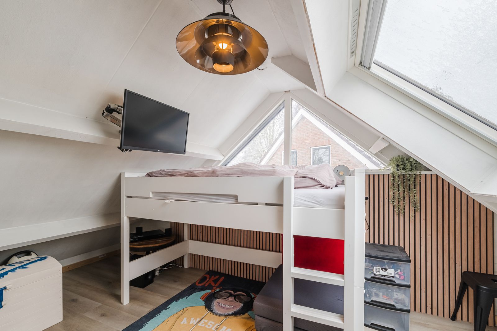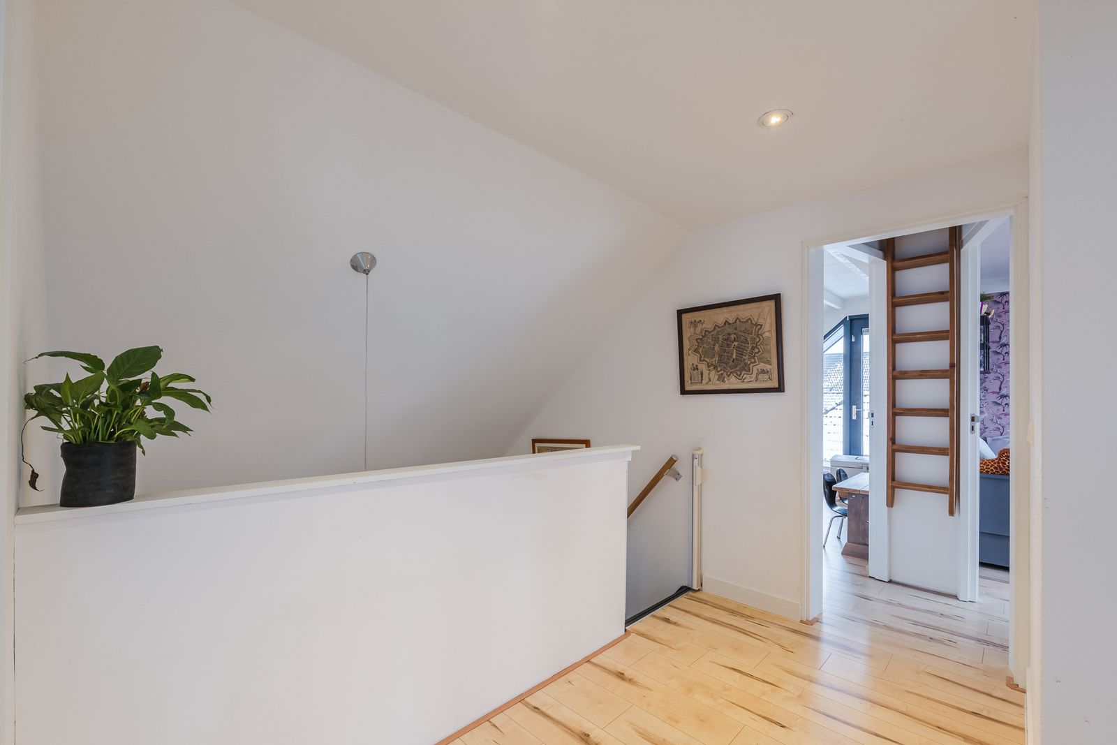 Boven zijn 4 grote lichte slaapkamers (17, 16, 14 en 12m2) en een badkamer (8m2) gesitueerd om een vide. Deze vide zorgt voor een ruimtelijke ervaring. De volledig gerenoveerde badkamer is voorzien van een hangtoilet, ligbad, regendouche, dubbele wastafel en extra infraroodverwarming. 3 van de 4 slaapkamers hebben knieschotten en 1 slaapkamer heeft ingebouwd meubilair (bureau, kast en bed) ook heeft deze slaapkamer een balkon.