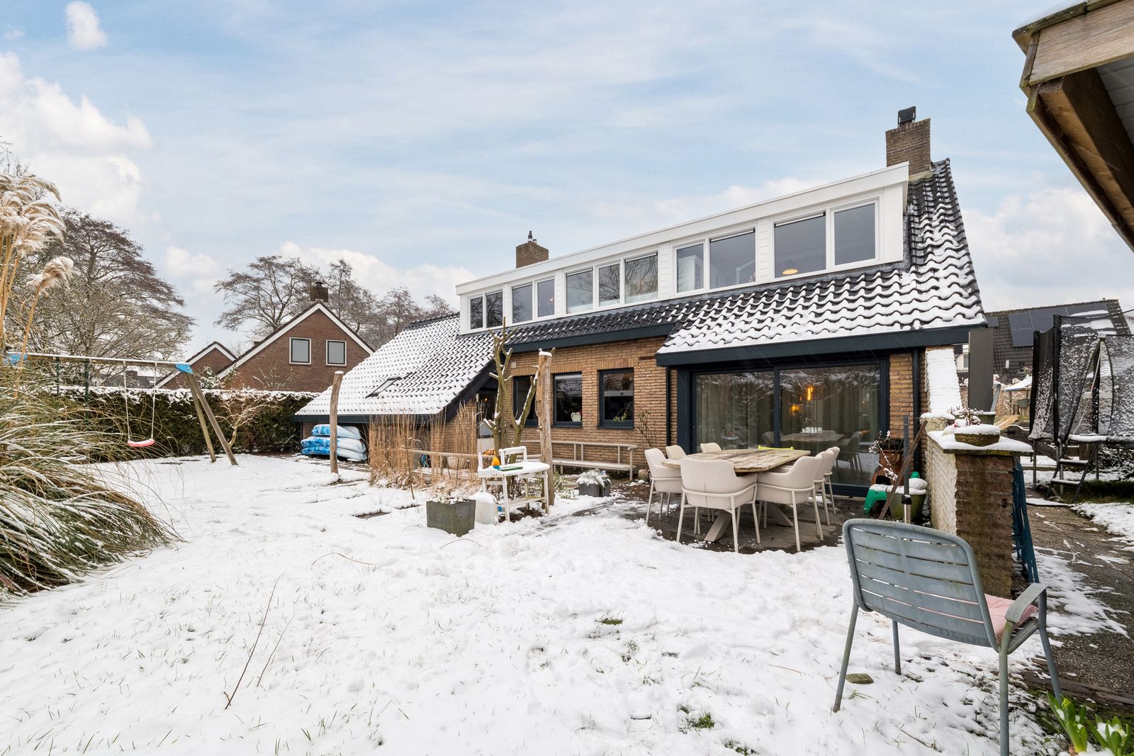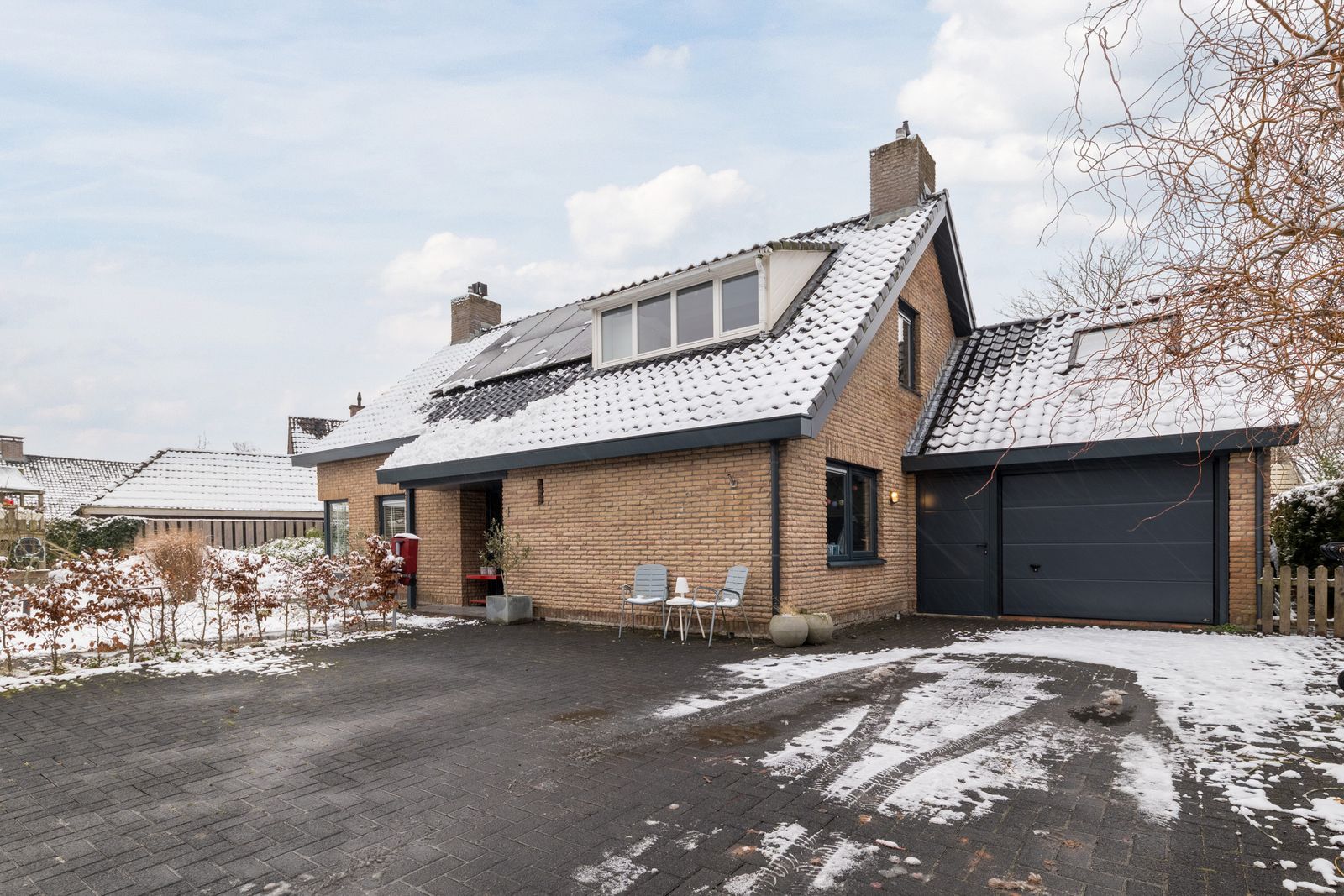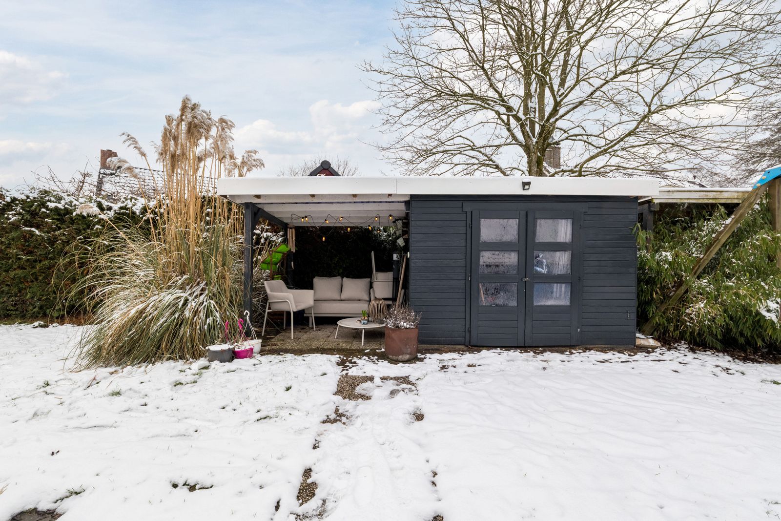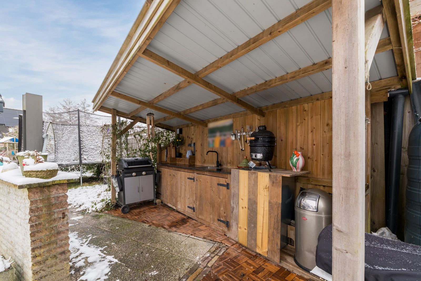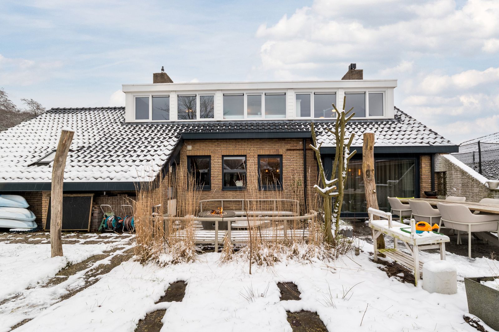 Naast het schilderwerk is er buitenshuis nog veel meer gedaan, zo is er een schuur met overkapping geplaatst. Ook is er een buitenkeuken gebouwd, deze is voorzien van elektriciteit en water. Alle houten dakgoten, windveren en andere bekleding zijn in 2025 vervangen door antraciet polyester en keralit. Het balkon is volledig gerenoveerd en wordt nog voorzien van een nieuw stalen hekwerk. De schoorstenen zijn opnieuw gevoegd en geïmpregneerd, het zadeldak is gecoat en waar nodig is het lood vernieuwd. Uiteraard is de woning voorzien van zonnepanelen en tot slot is de pui van de garage vervangen door een geïsoleerde antraciete aluminium deur met thermisch onderbroken kozijnen.