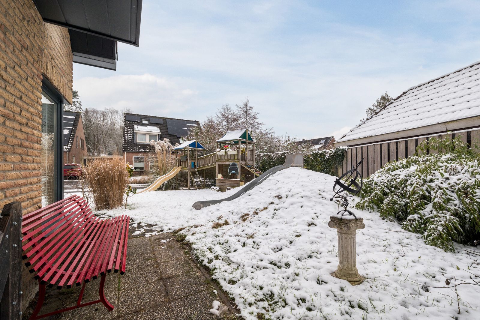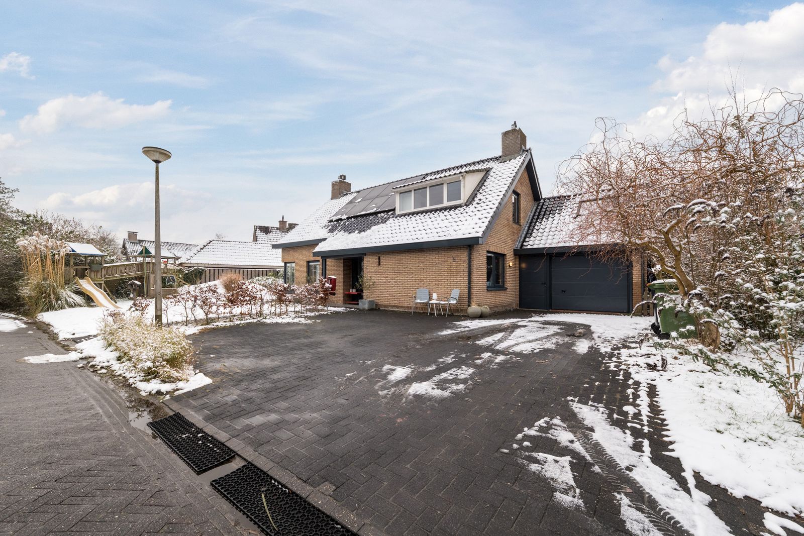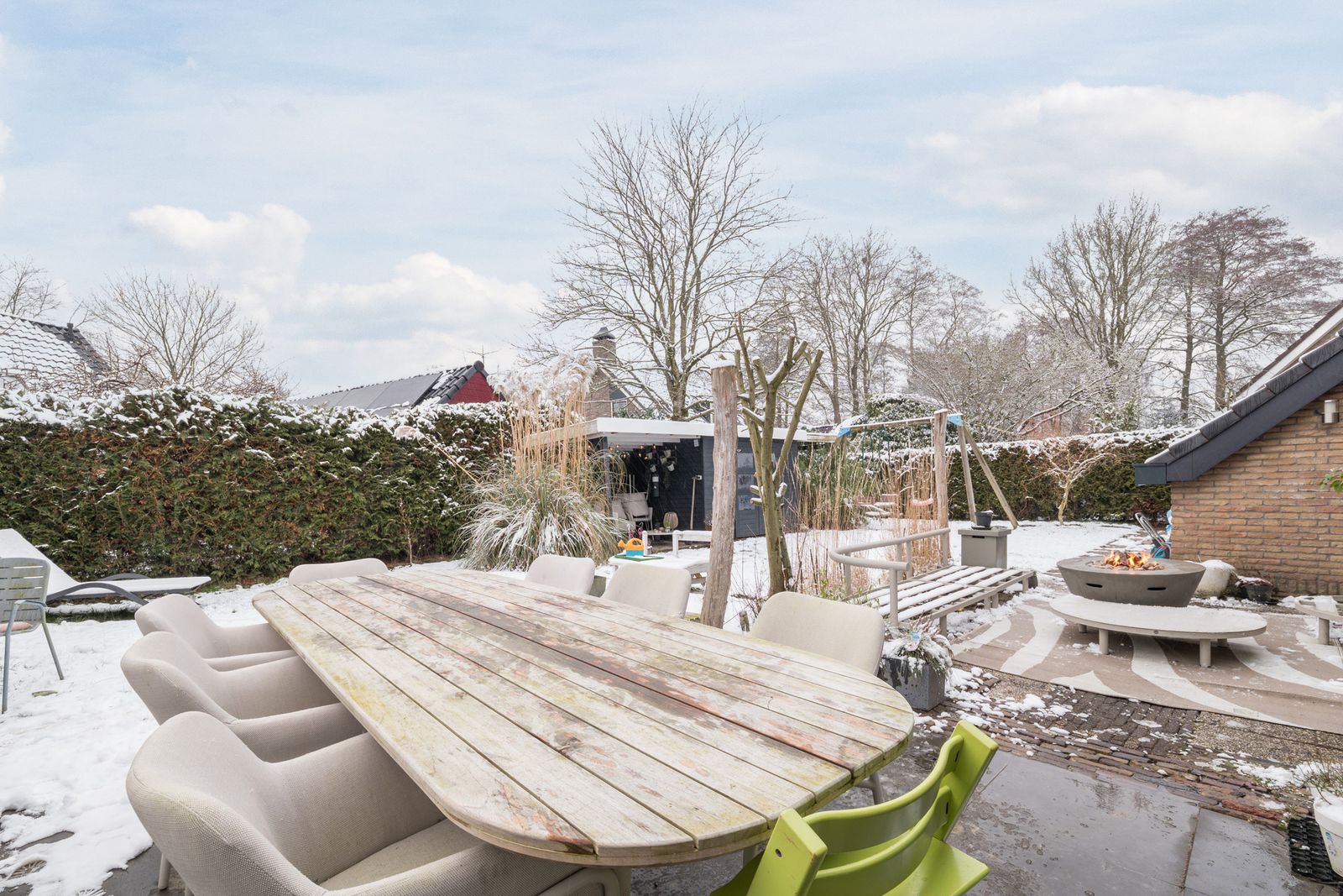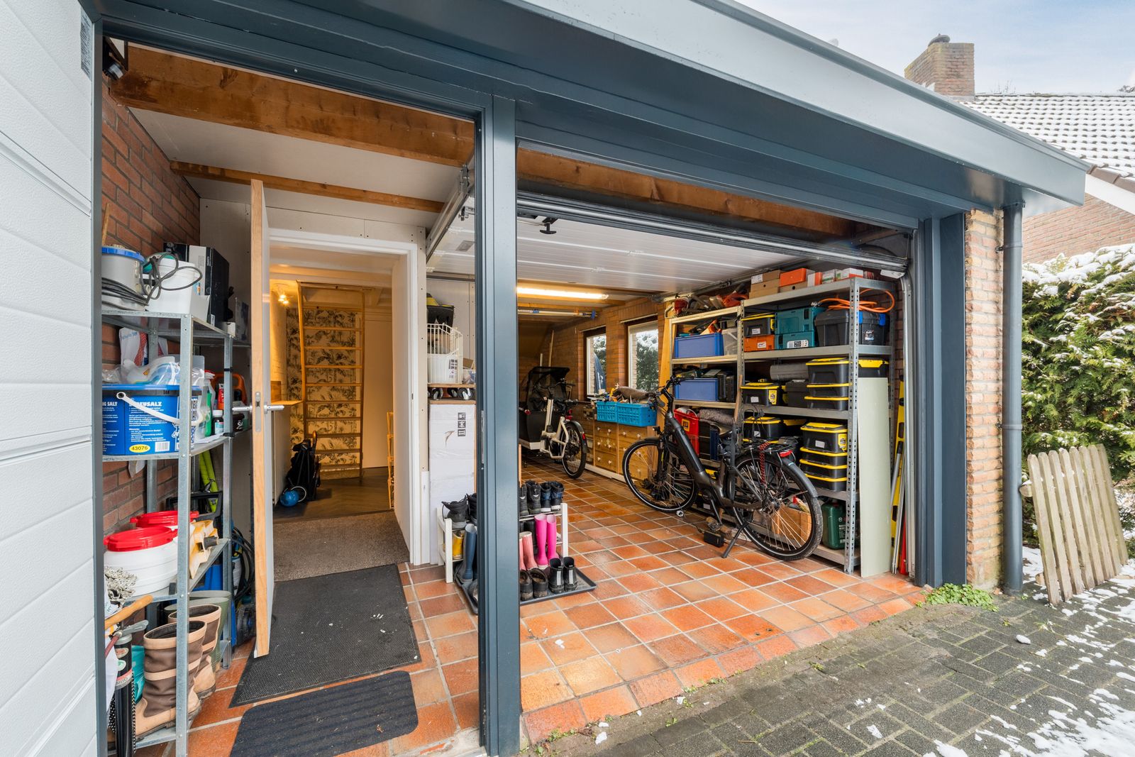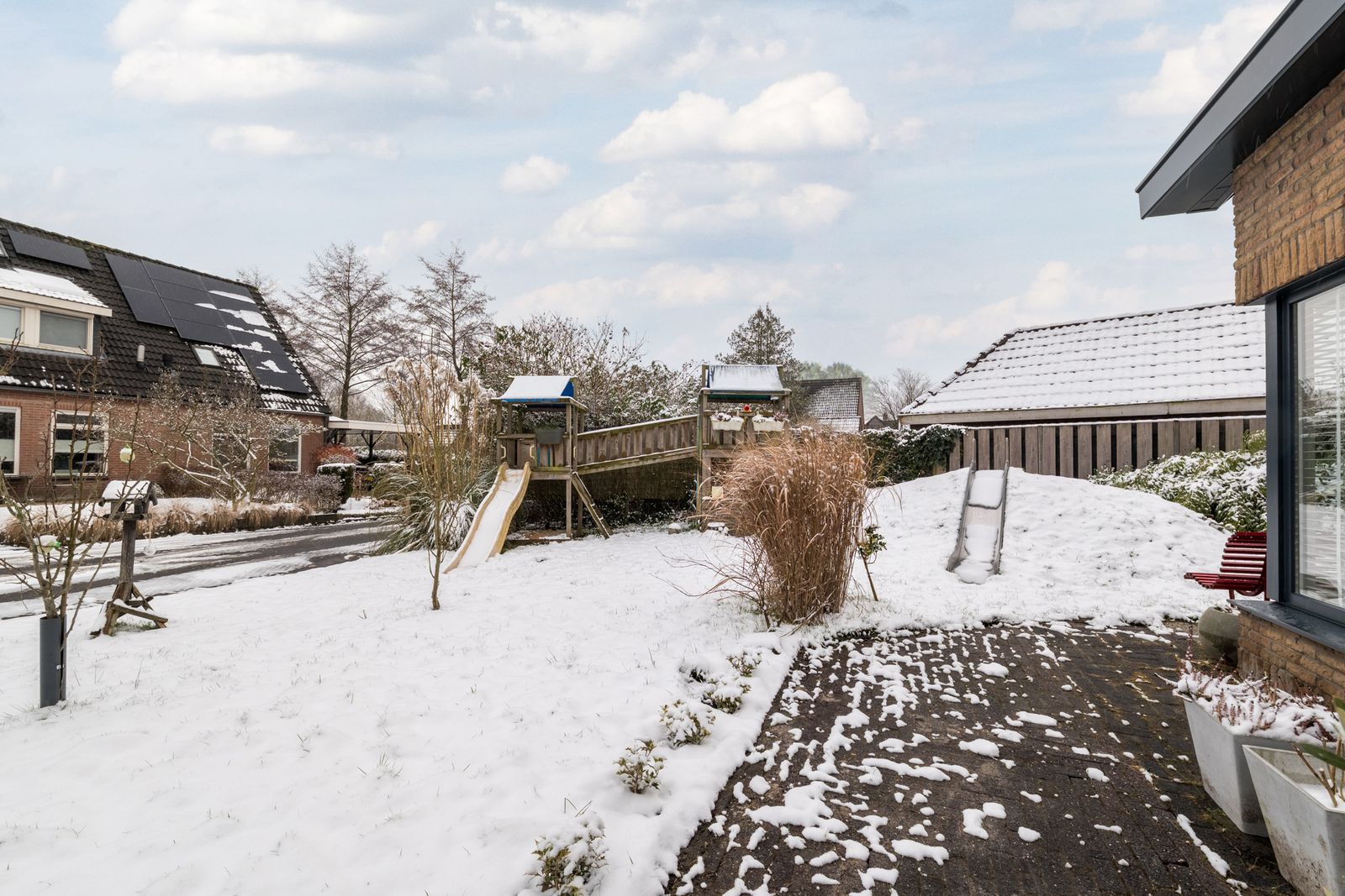 Naast het schilderwerk is er buitenshuis nog veel meer gedaan, zo is er een schuur met overkapping geplaatst. Ook is er een buitenkeuken gebouwd, deze is voorzien van elektriciteit en water. Alle houten dakgoten, windveren en andere bekleding zijn in 2025 vervangen door antraciet polyester en keralit. Het balkon is volledig gerenoveerd en wordt nog voorzien van een nieuw stalen hekwerk. De schoorstenen zijn opnieuw gevoegd en geïmpregneerd, het zadeldak is gecoat en waar nodig is het lood vernieuwd. Uiteraard is de woning voorzien van zonnepanelen en tot slot is de pui van de garage vervangen door een geïsoleerde antraciete aluminium deur met thermisch onderbroken kozijnen.