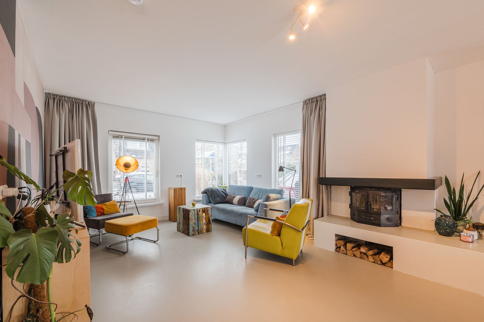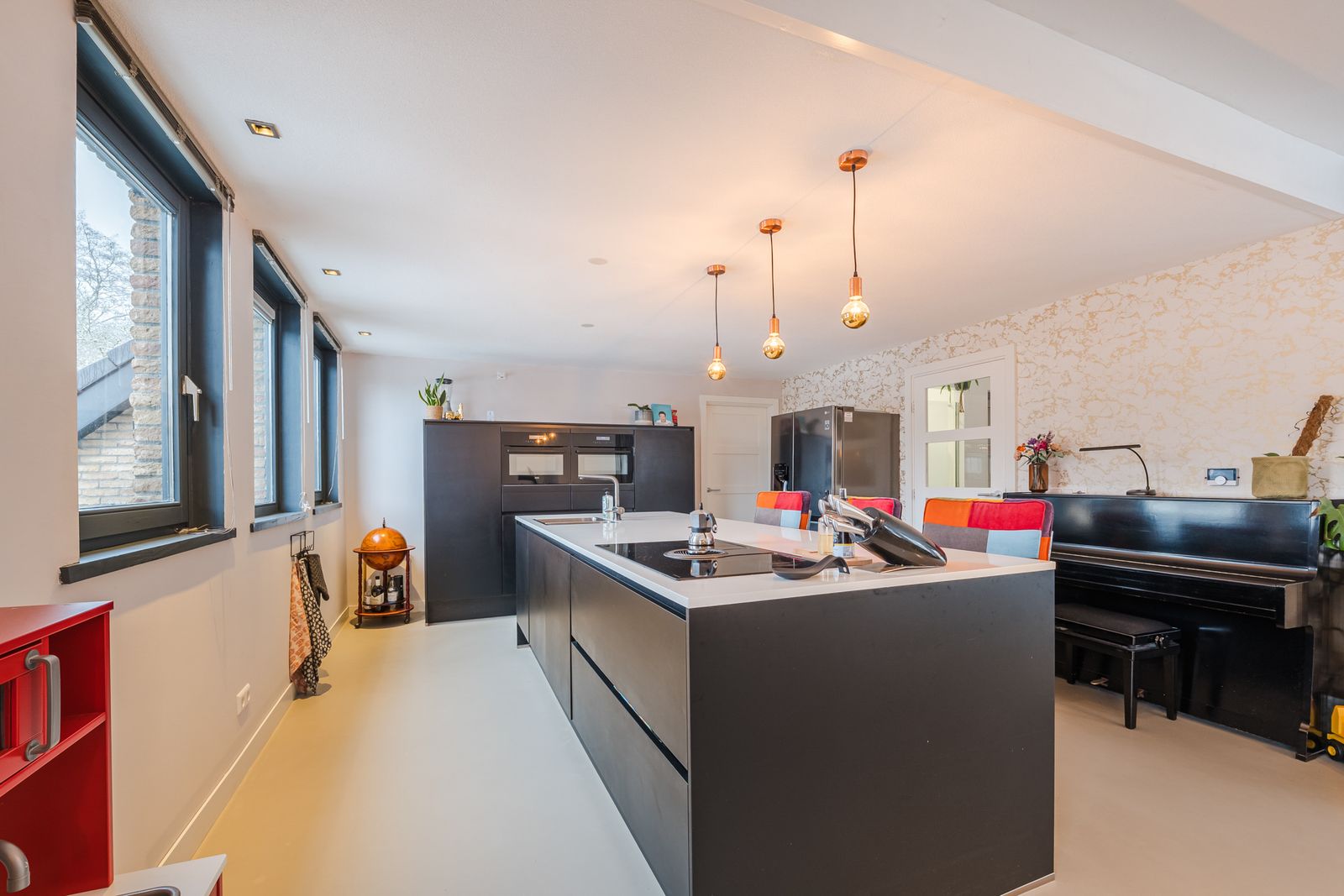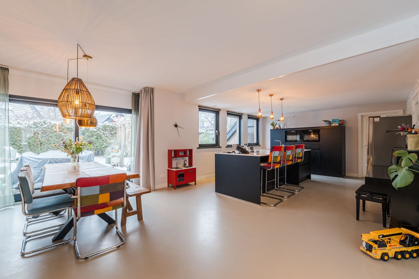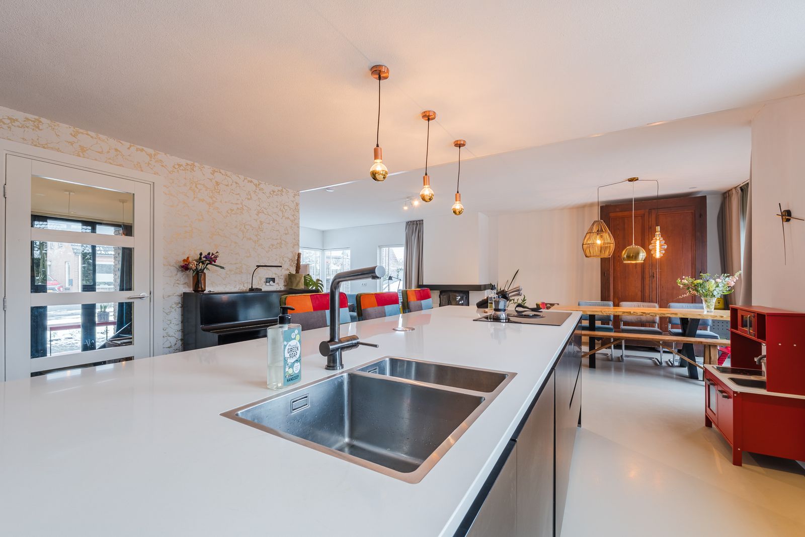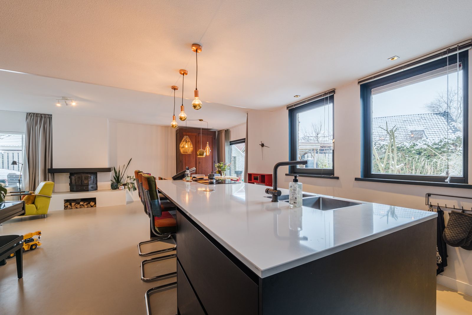 U komt binnen in een ruime hal die hoogte biedt door de vide. Vanuit de hal loopt u naar de ruime woonkamer met open keuken (56m2). De vernieuwde keuken bestaat uit een kookeiland van 3 meter breed, deze is voorzien van de nodige inbouw apparatuur. Aansluitend aan de open keuken is ruimte voor een grote eettafel. Vanaf de eettafel heeft u uitzicht op de groene tuin. Deze loopt u in door de schuifdeur in de pui te openen. In dezelfde ruimte is de lichte living waar ook een sfeervolle open haard aanwezig is. Deze gehele ruimte is voorzien van een professionele pu gietvloer en nieuwe vloerverwarming en is daarom zeer comfortabel.
