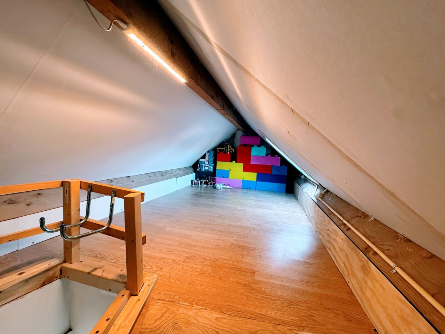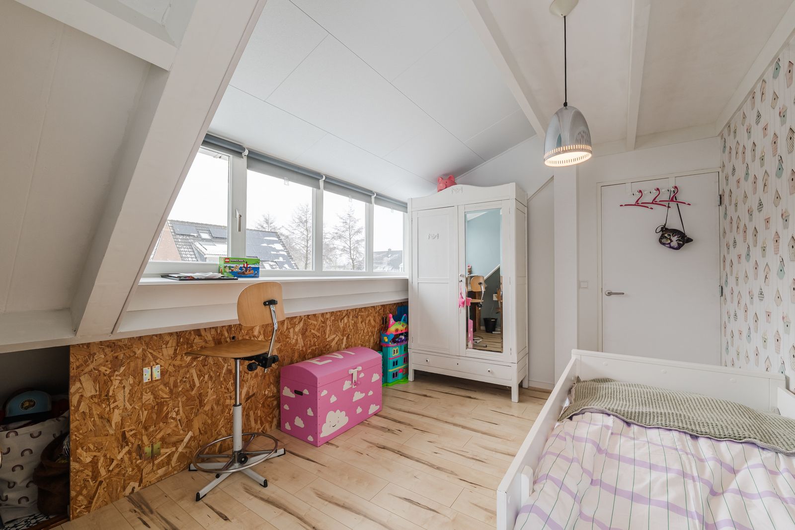 Over de gehele breedte van het huis ligt een vliering. De huidige bewoners hebben deze ruimte opgedeeld. Het grootste deel van de ruimte wordt gebruikt als berging. Met een trap is het andere deel van de vliering te bereiken. Deze is als extraatje voorzien van een dakraam en ingericht als speelzolder.