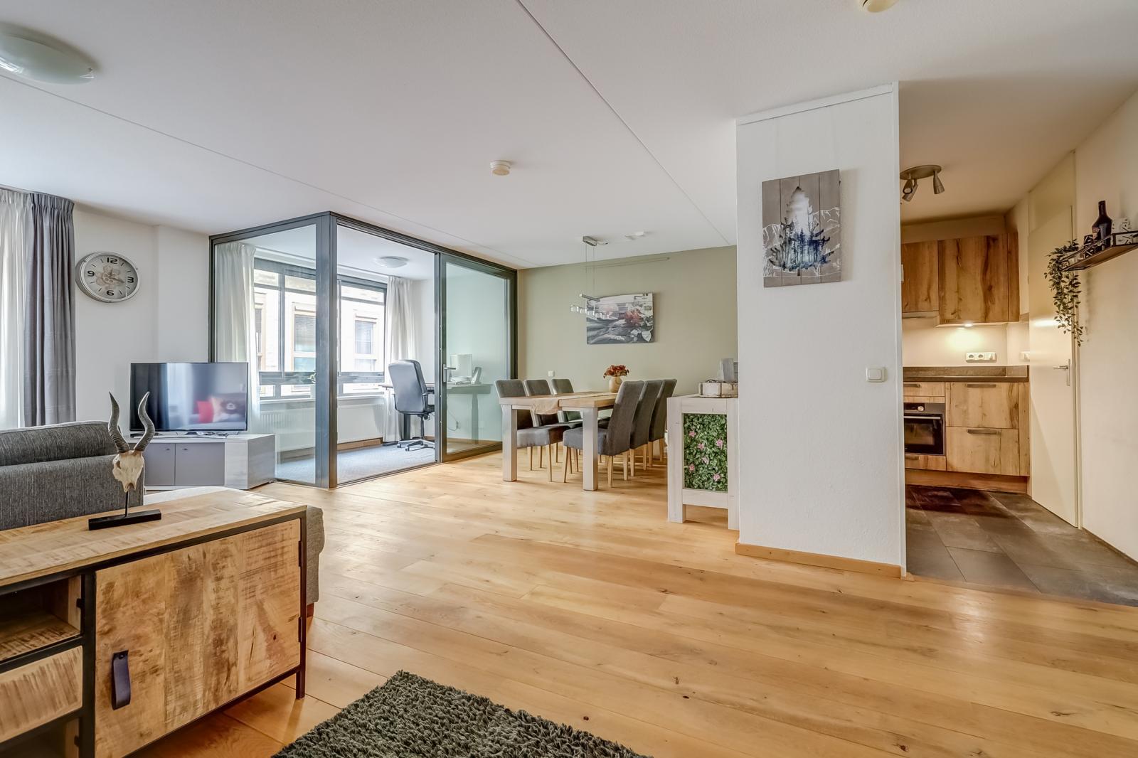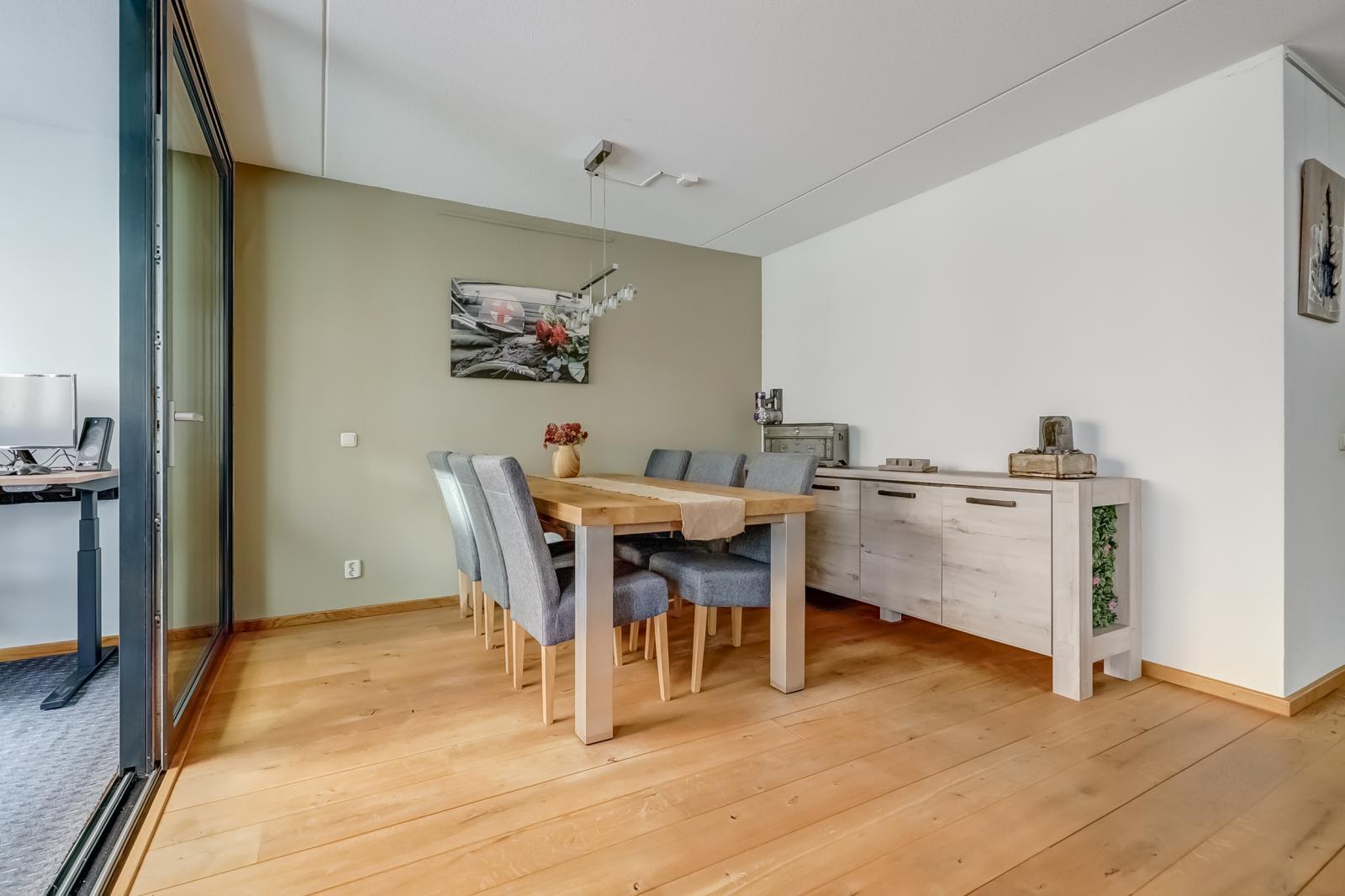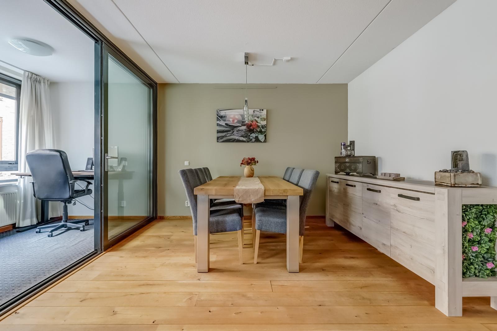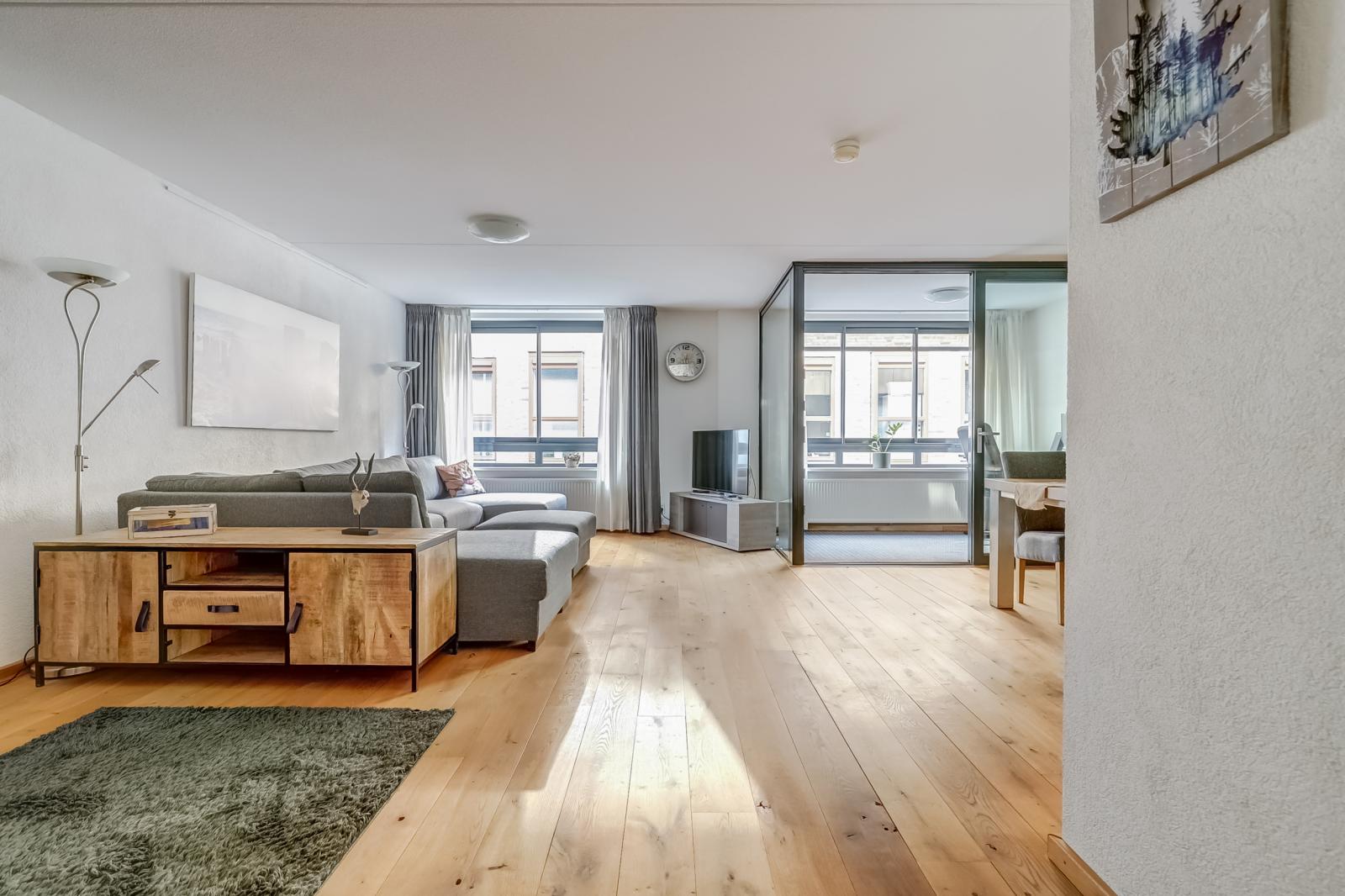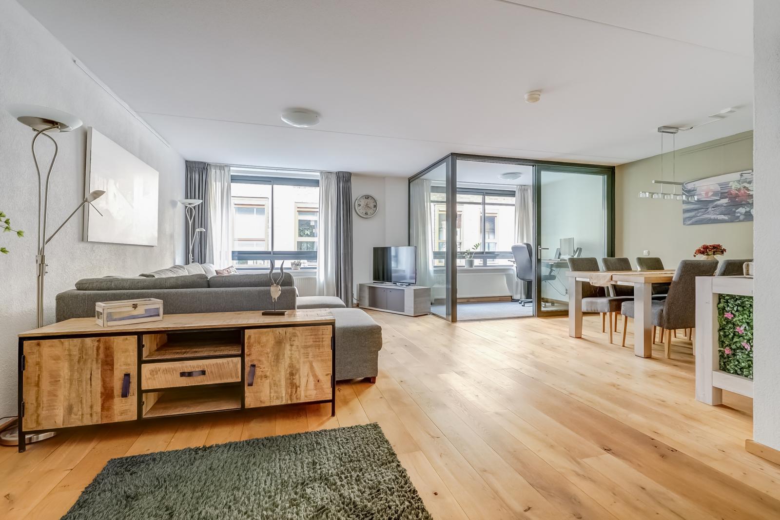 De woonkamer valt direct op door de prachtige massief houten vloer en biedt via een schuifdeur toegang tot de inpandige loggia _ een heerlijke, veelzijdige plek waar u naar hartenlust kunt ontspannen of werken.