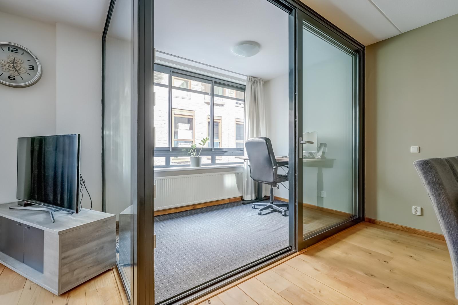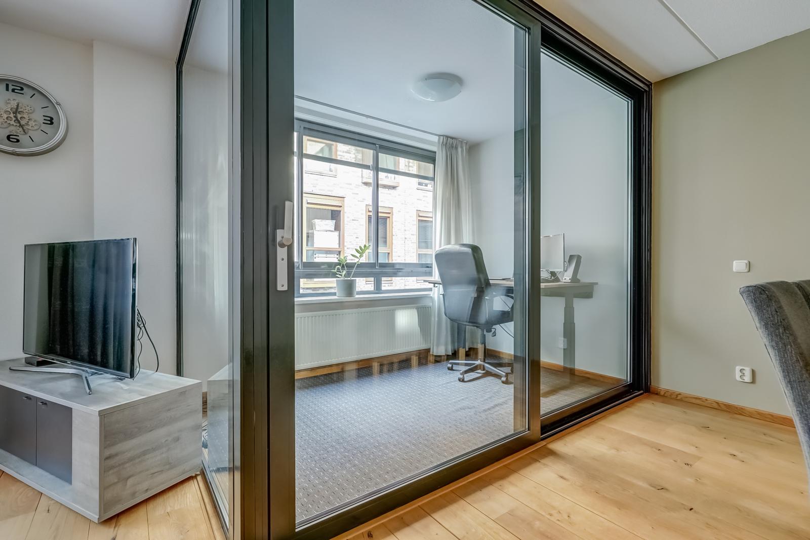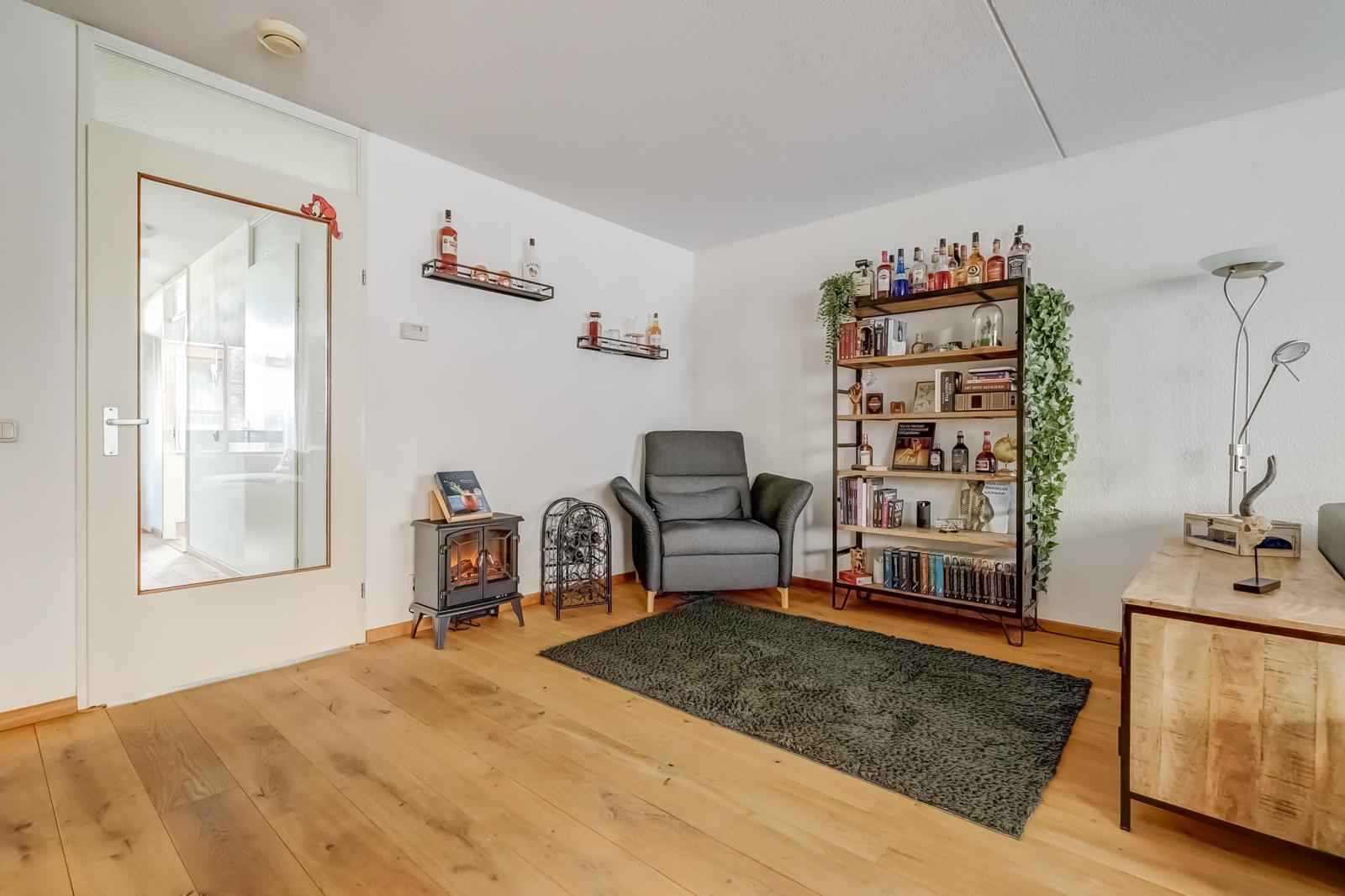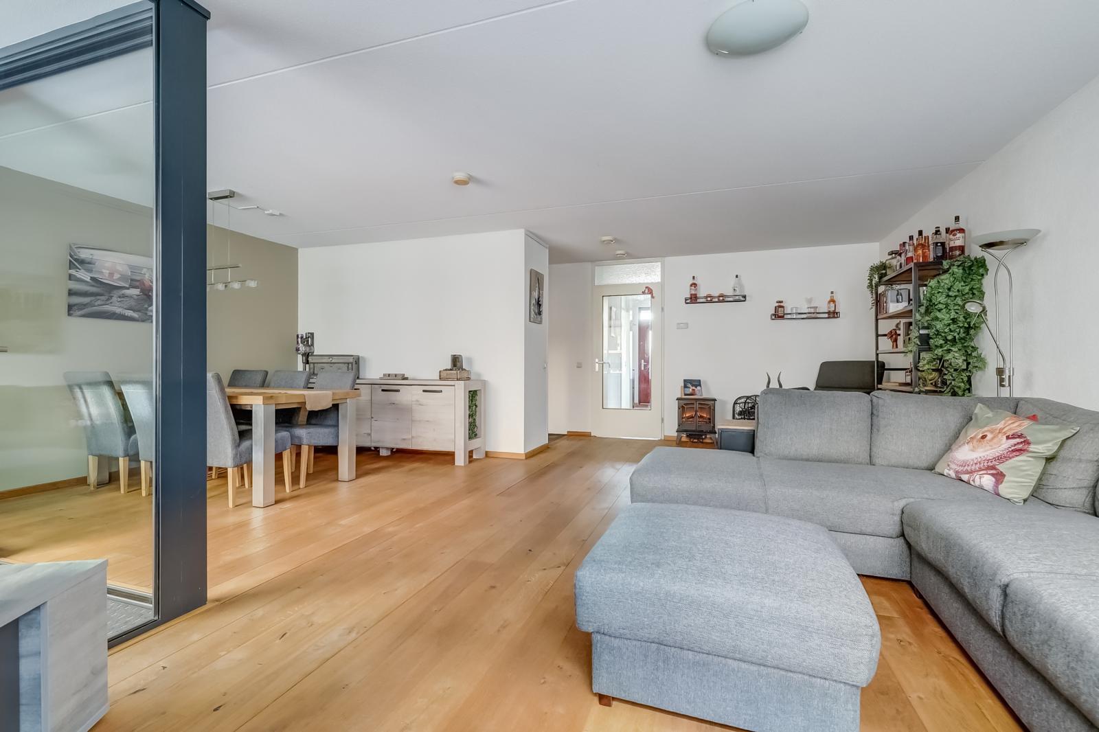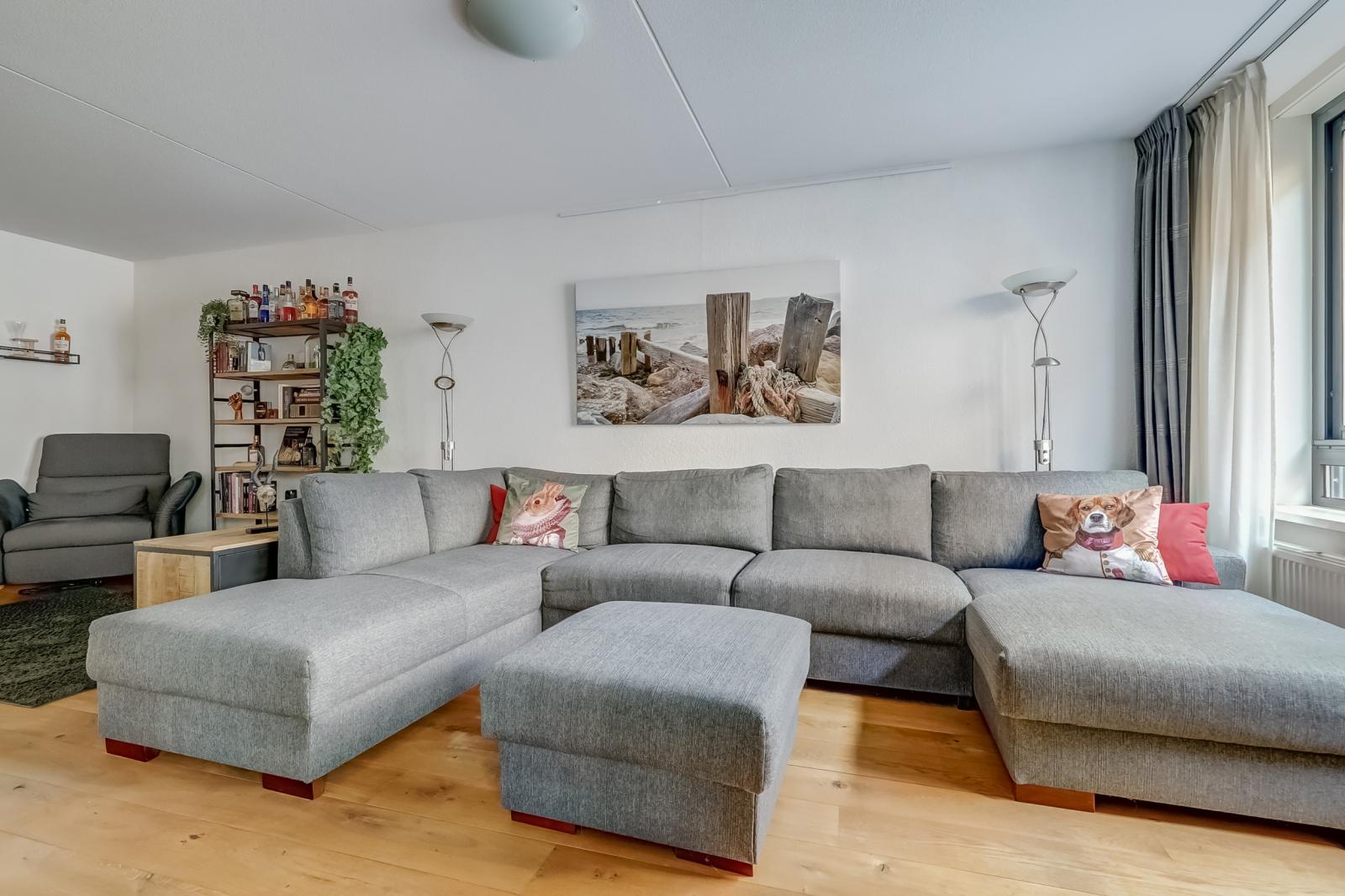 De woonkamer valt direct op door de prachtige massief houten vloer en biedt via een schuifdeur toegang tot de inpandige loggia _ een heerlijke, veelzijdige plek waar u naar hartenlust kunt ontspannen of werken.