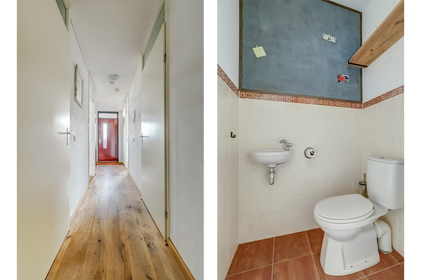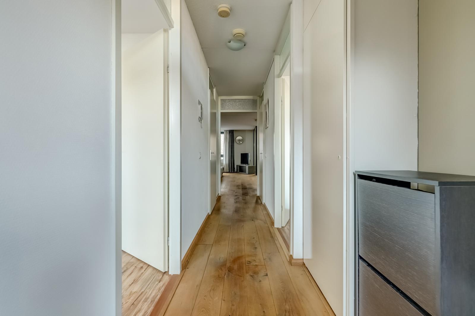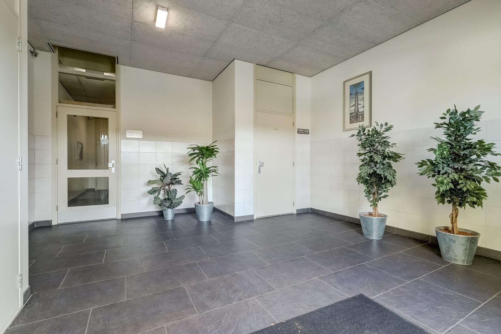 U betreedt het complex via een afgesloten hoofdentree met lift, waarmee u eenvoudig de eerste verdieping bereikt. De ruime hal in het appartement geeft toegang tot alle vertrekken: de meterkast, twee slaapkamers, het toilet, de badkamer en de woonkamer. Voor extra veiligheid en gemak is er een videofooninstallatie aanwezig.