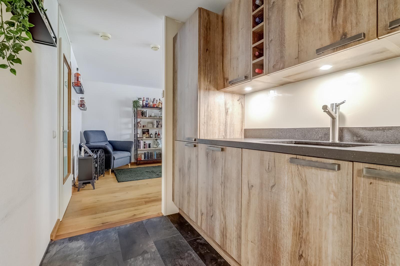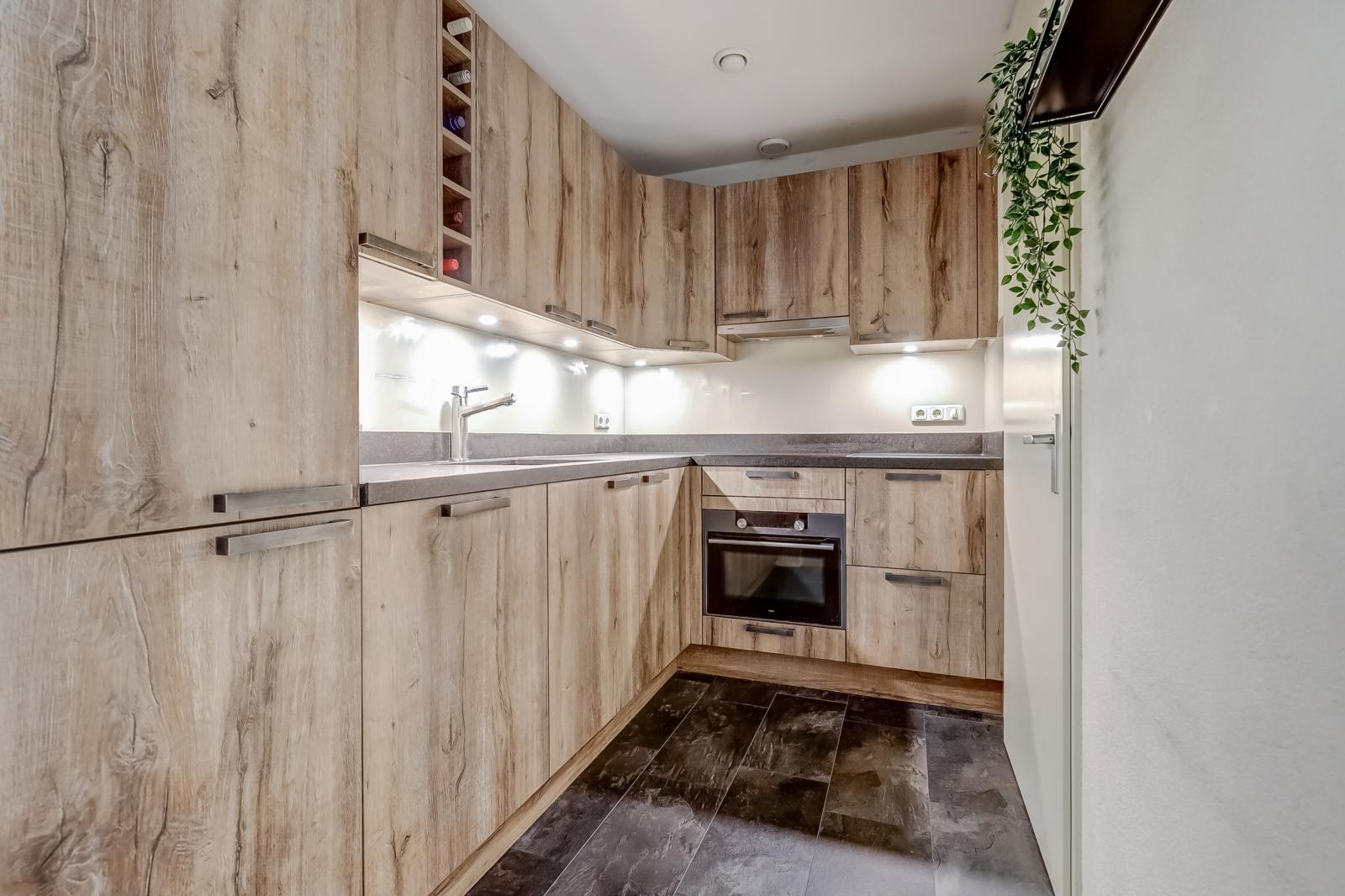 De stijlvolle halfopen keuken is uitgevoerd in een fraaie houtstructuur met een zwart aanrechtblad. Hier beschikt u over diverse inbouwapparatuur, waaronder een koelkast, vriezer, combimagnetron, afwasmachine, 4-pits inductiekookplaat en een circulatie-afzuigkap. Vanuit de keuken bereikt u tevens een praktische stook-/wasruimte, ideaal als extra bergruimte en voor uw wasmachine en droger.