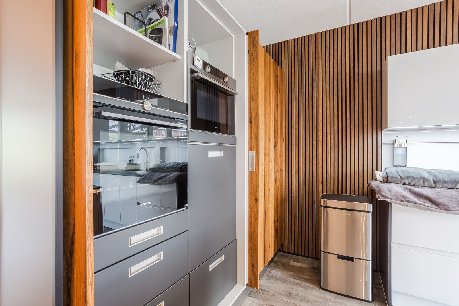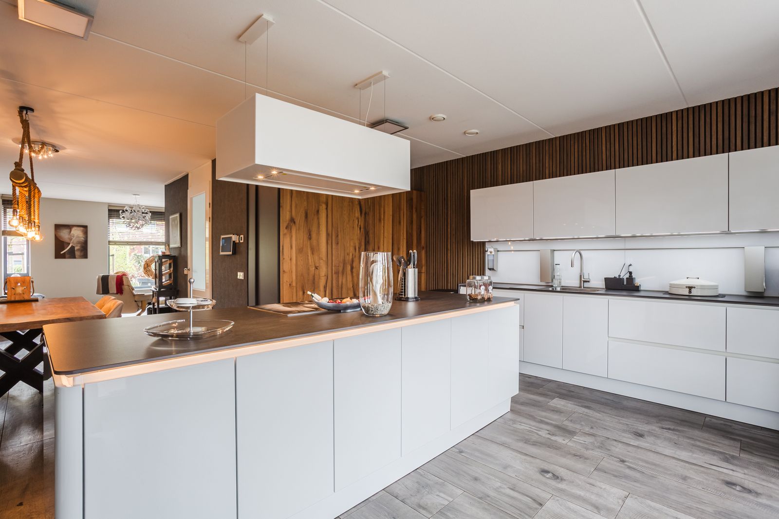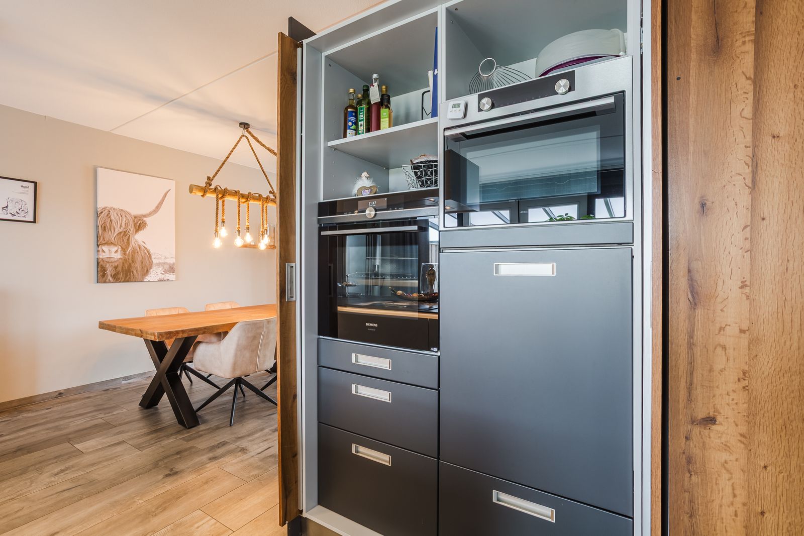 De stijlvolle keuken vormt het absolute middelpunt van de woning en is uitgerust met luxe inbouwapparatuur, waaronder een Quooker, een Siemens oven met stoomfunctie, een Atag combimagnetron, een grote Siemens inductiekookplaat en een design afzuigkap met geïntegreerde lichtinstallatie. Deze keuken is een droom voor iedere kookliefhebber. De begane grond is voorzien van vloerverwarming, wat zorgt voor een aangenaam en gelijkmatig woonklimaat.