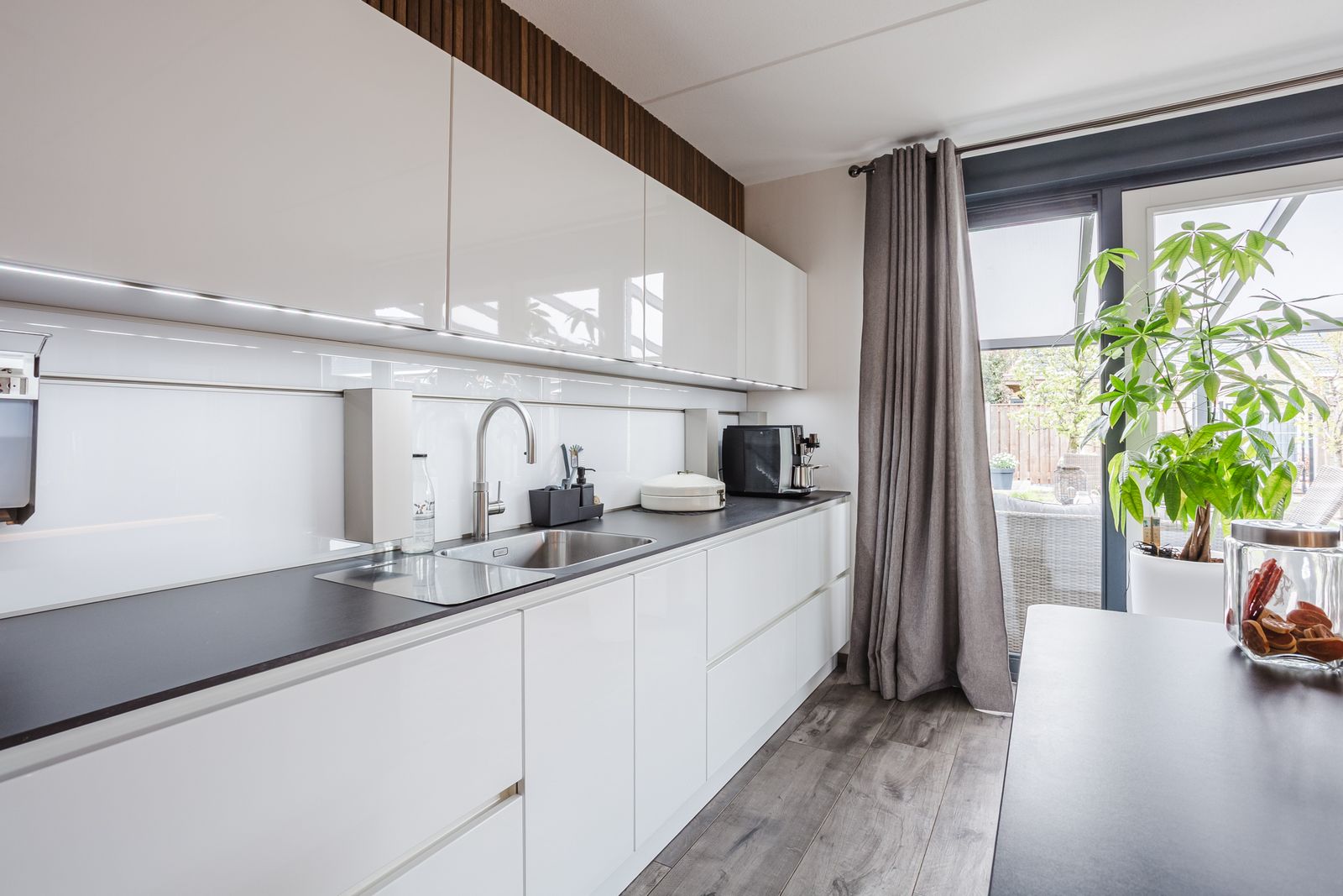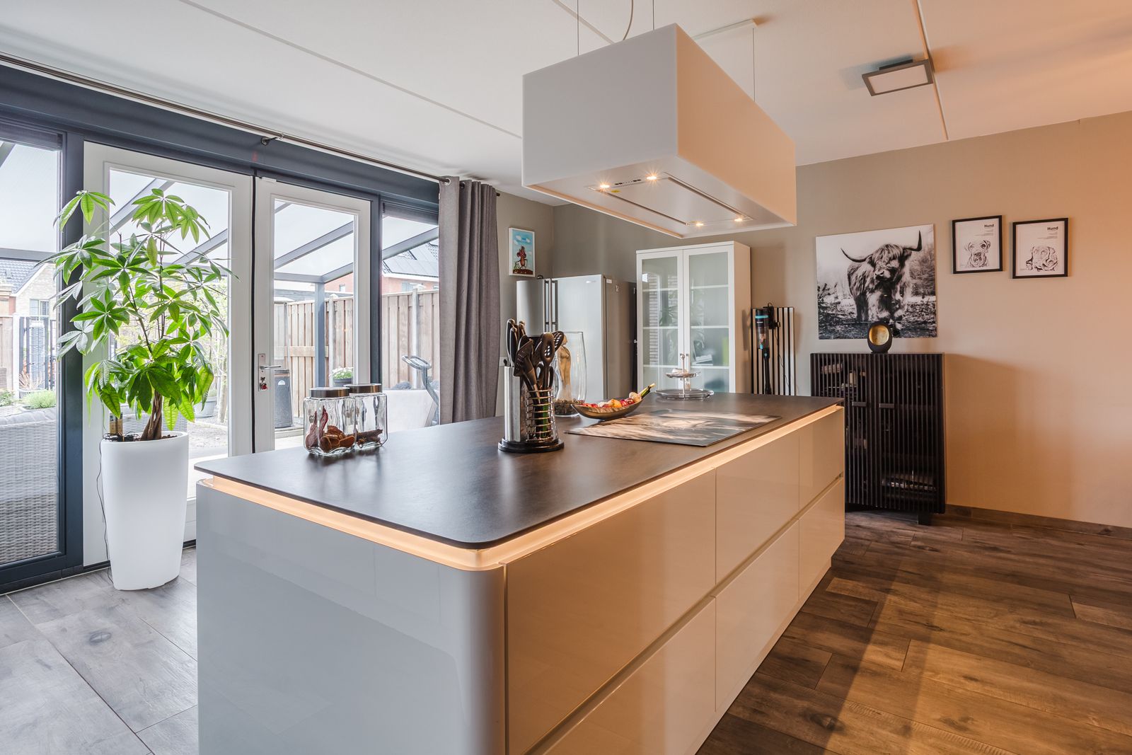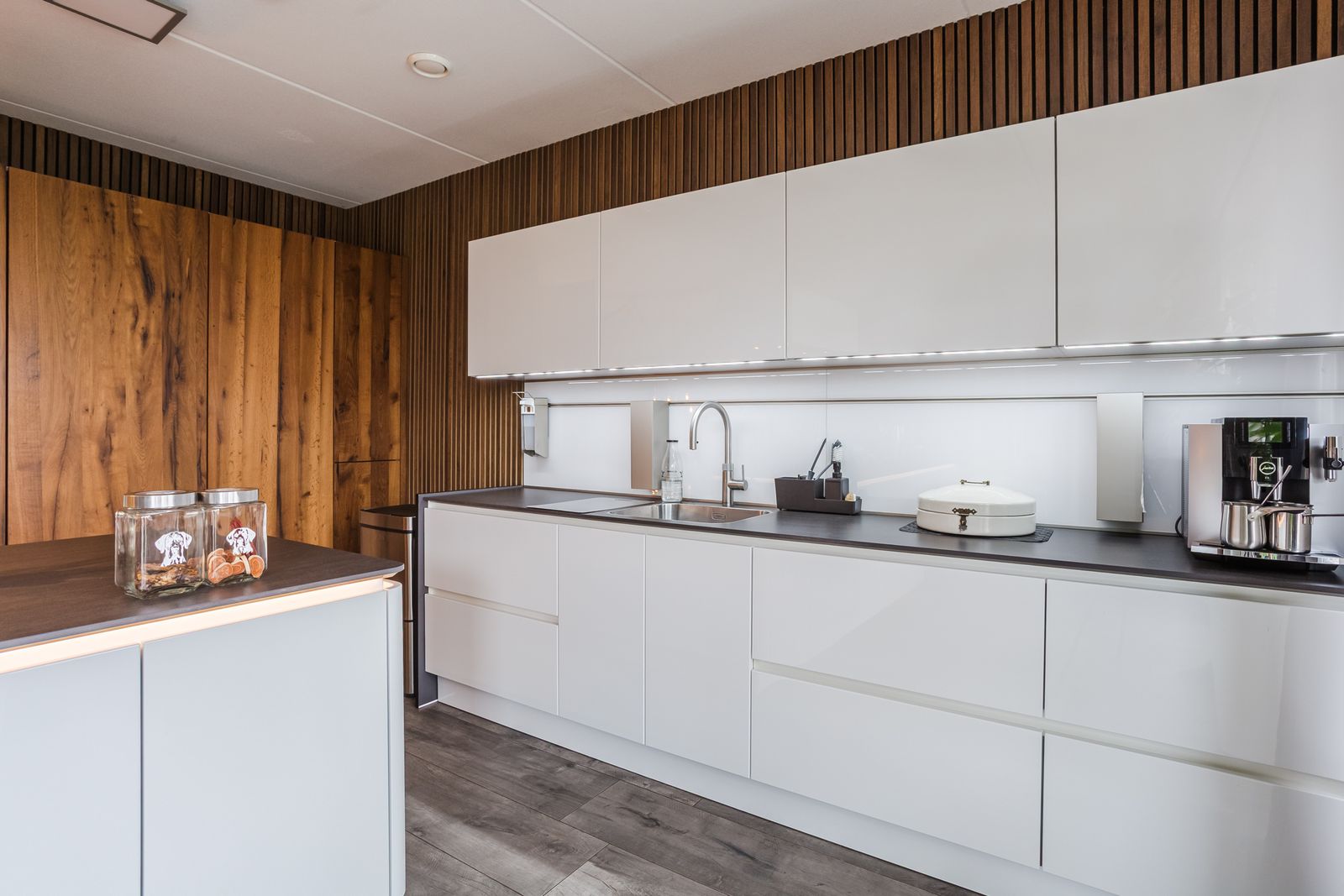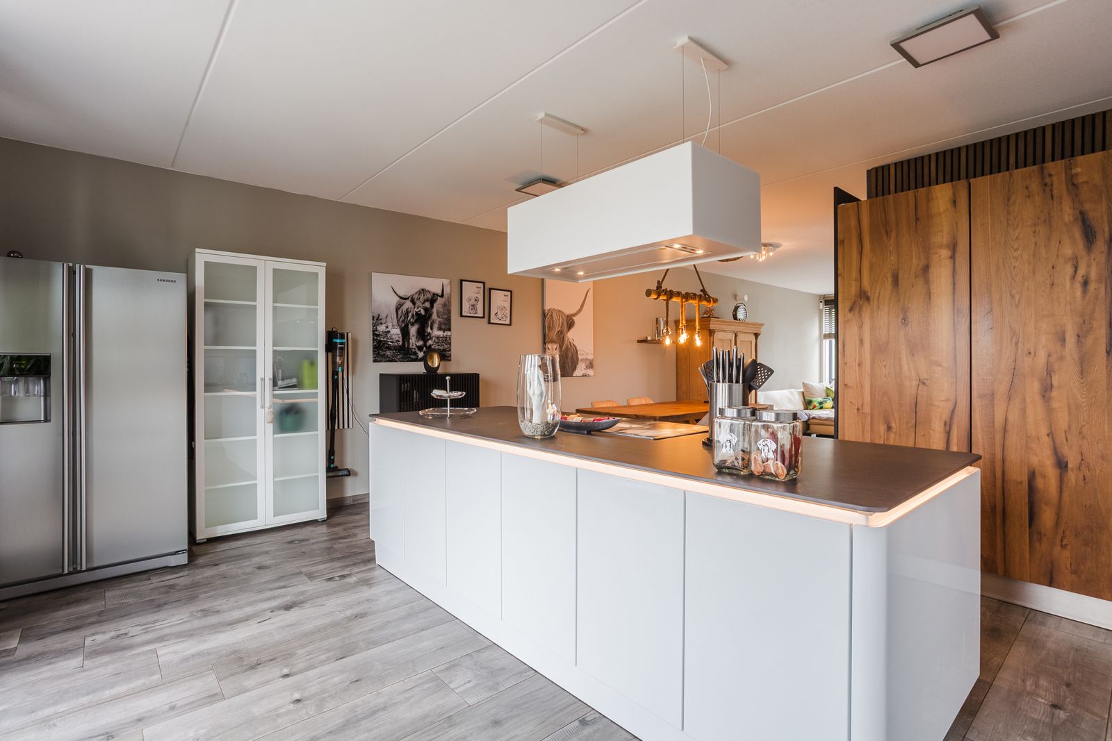 De stijlvolle keuken vormt het absolute middelpunt van de woning en is uitgerust met luxe inbouwapparatuur, waaronder een Quooker, een Siemens oven met stoomfunctie, een Atag combimagnetron, een grote Siemens inductiekookplaat en een design afzuigkap met geïntegreerde lichtinstallatie. Deze keuken is een droom voor iedere kookliefhebber. De begane grond is voorzien van vloerverwarming, wat zorgt voor een aangenaam en gelijkmatig woonklimaat.