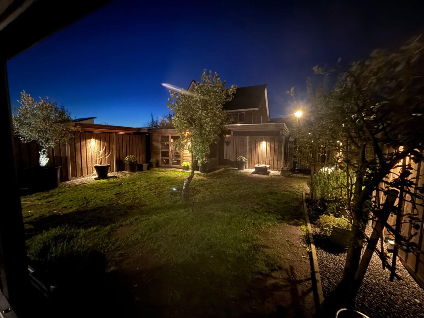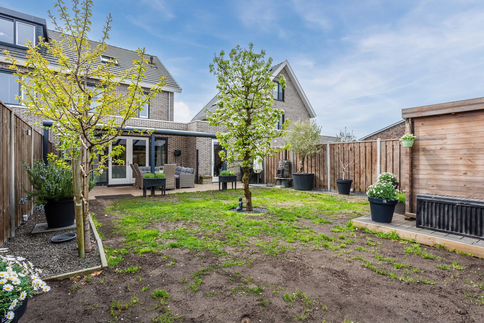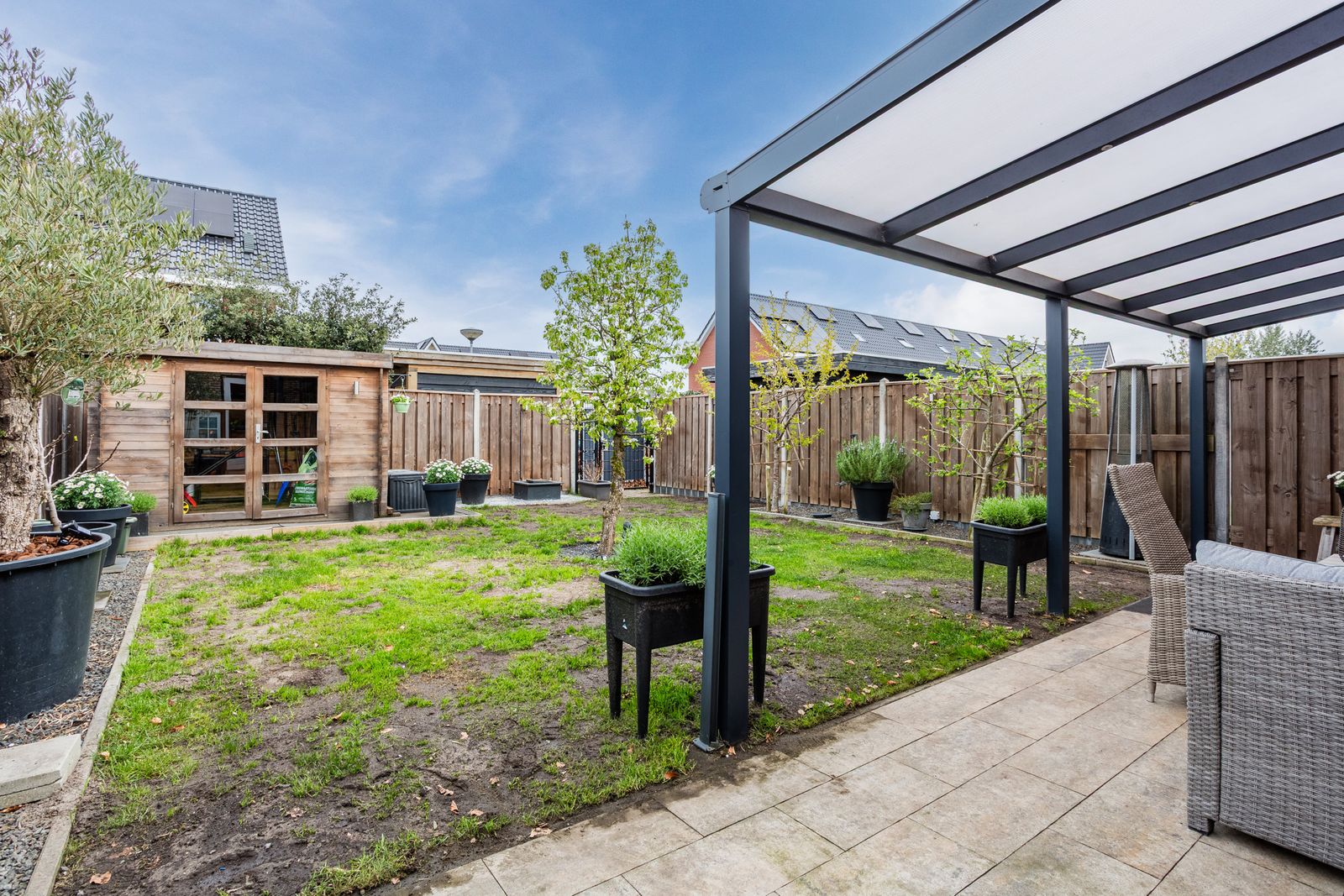De tuin vormt een oase van rust. Onder de sfeervolle overkapping met LED-verlichting geniet u van lange avonden buiten, terwijl het zachte geluid van een waterfontein en het gezang van vogels zorgen voor een ontspannen sfeer. De tuin beschikt over een grote tuindeur en een praktische achterom.