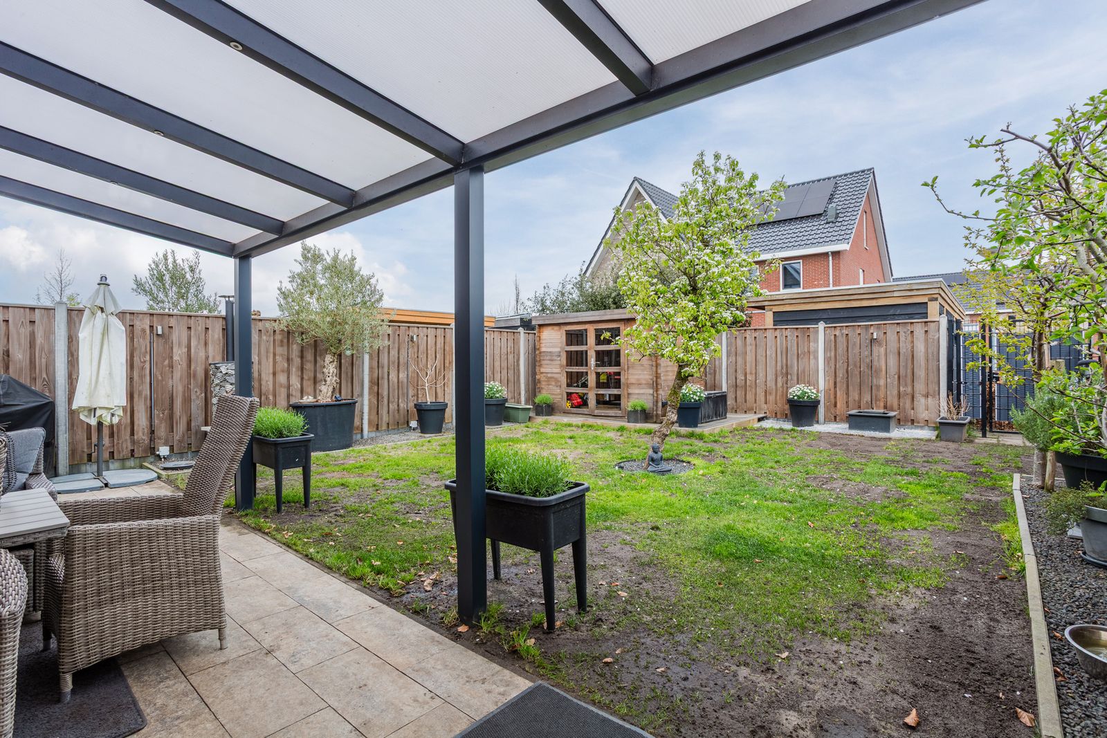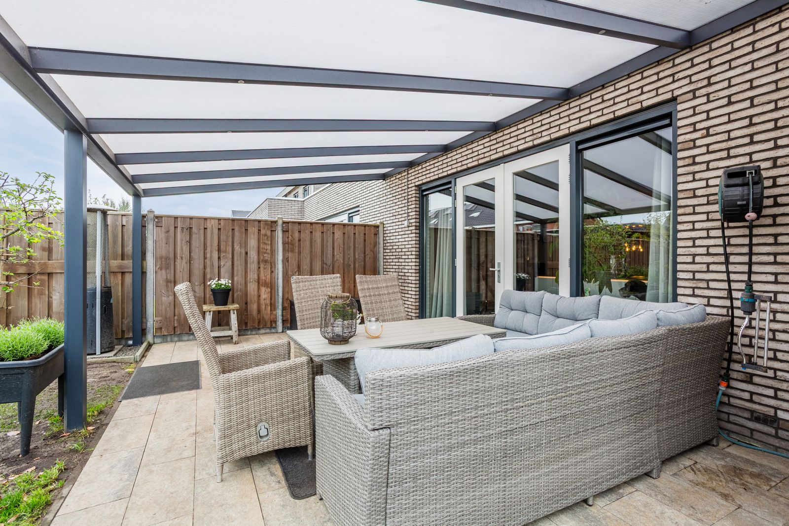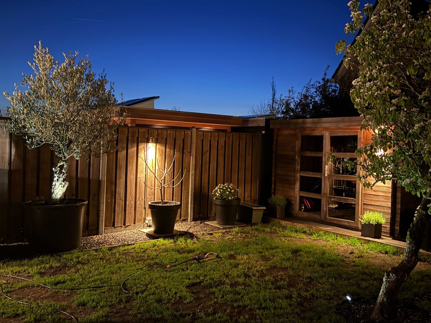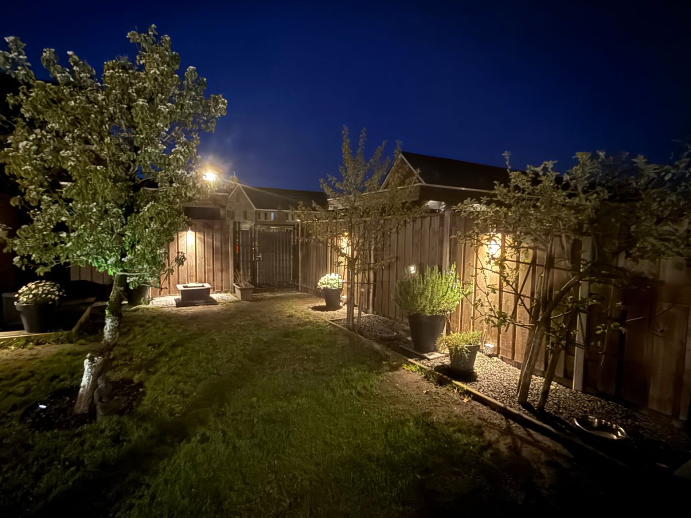 De tuin vormt een oase van rust. Onder de sfeervolle overkapping met LED-verlichting geniet u van lange avonden buiten, terwijl het zachte geluid van een waterfontein en het gezang van vogels zorgen voor een ontspannen sfeer. De tuin beschikt over een grote tuindeur en een praktische achterom.