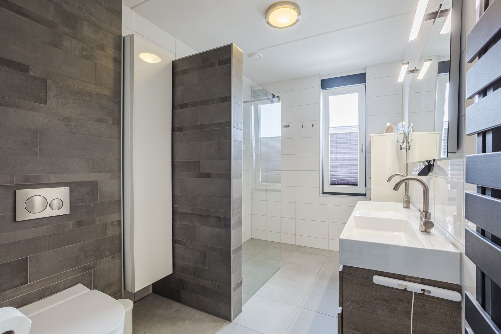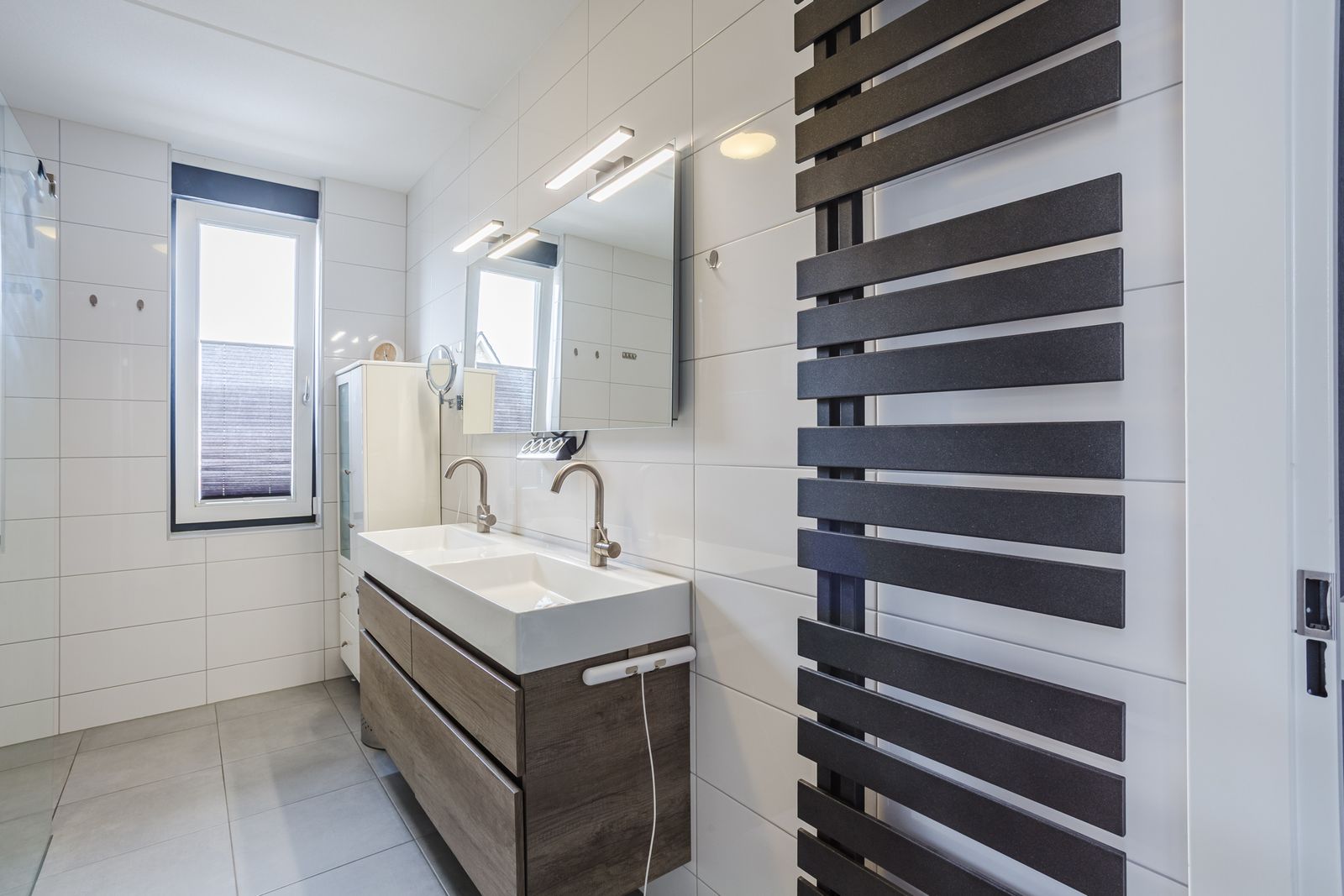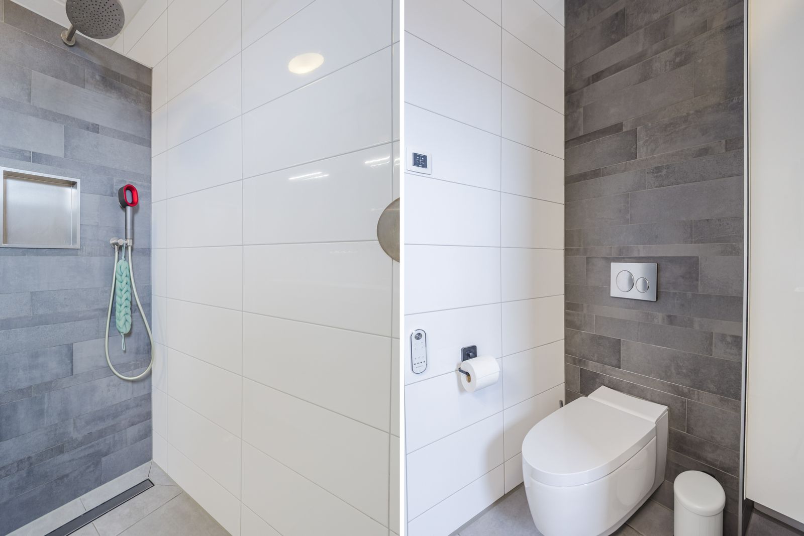 Op de eerste verdieping bevinden zich drie volwaardige slaapkamers. De ruime hoofdslaapkamer met inbouwkast en de derde slaapkamer, eveneens voorzien van een inbouwkast, bieden optimaal gebruiksgemak en praktische bergruimte. De moderne badkamer straalt luxe uit en beschikt over een inloopdouche, een toilet met bidet, dubbele wastafel met meubel en een verwarmde spiegel. Een plek waar elke dag ontspannen begint.