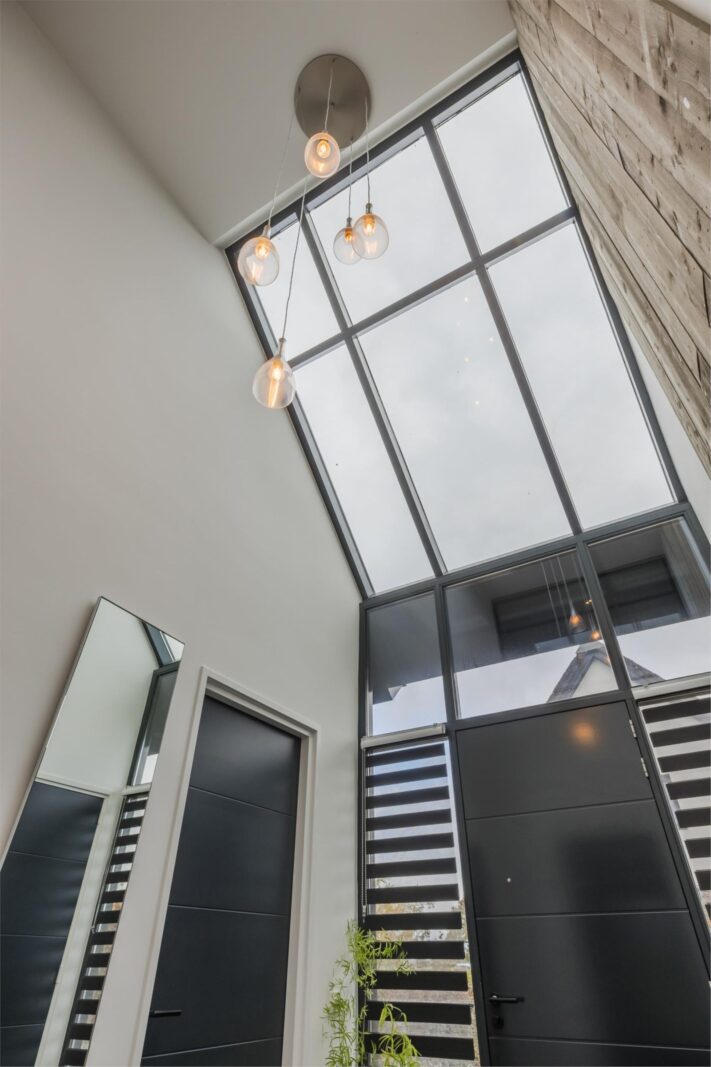 Bij binnenkomst valt direct de indrukwekkende hal op met hoge vide en veel glas, wat zorgt voor een lichte en royale entree. De zeer ruime leefkeuken van ca. 80 m² is het hart van de woning. De keuken beschikt over een groot kookeiland, moderne apparatuur en een sfeervolle pelletkachel. De hoge vide geeft een uniek ruimtelijk gevoel.