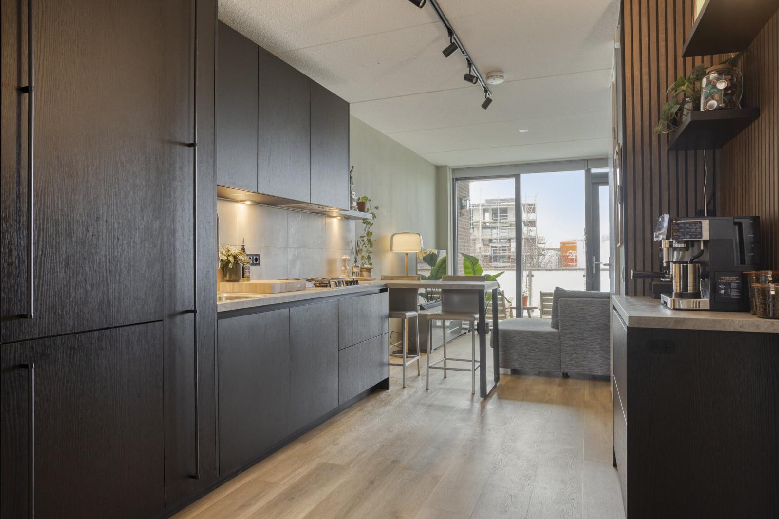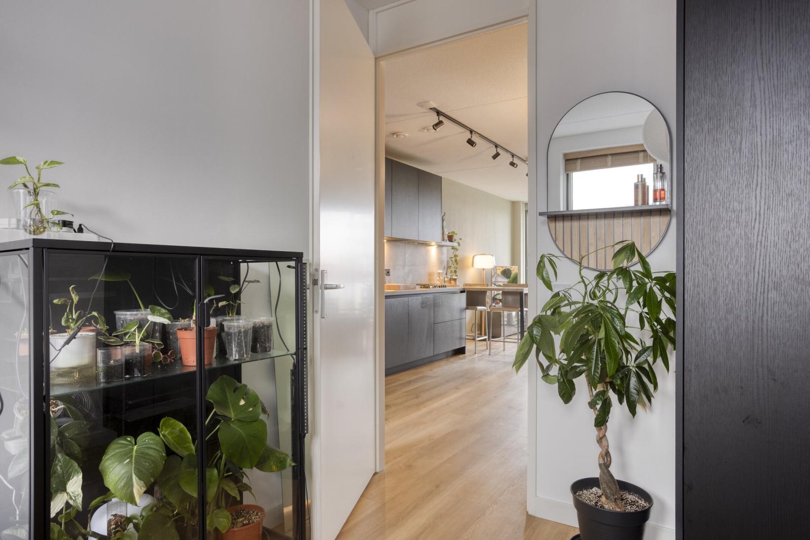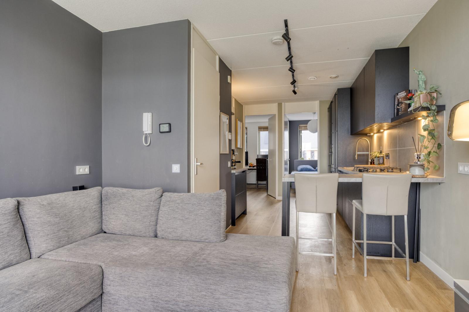Entree, garderobe, doorgang naar de woonkamer met balkon op het westen. Luxe keuken (2023) voorzien van vaatwasser, gaskookplaat, afzuigkap (recirculerend), koel/vries combinatie, combi magnetron/oven, twee apothekerskasten en bar met twee barkrukken. 2 slaapkamers, badkamer met toilet, douche, wastafelmeubel en wasmachine en drogeraansluiting. Intergas Kombi Kompakt cv installatie (2018) bevindt zich in een aparte berging in de badkamer.