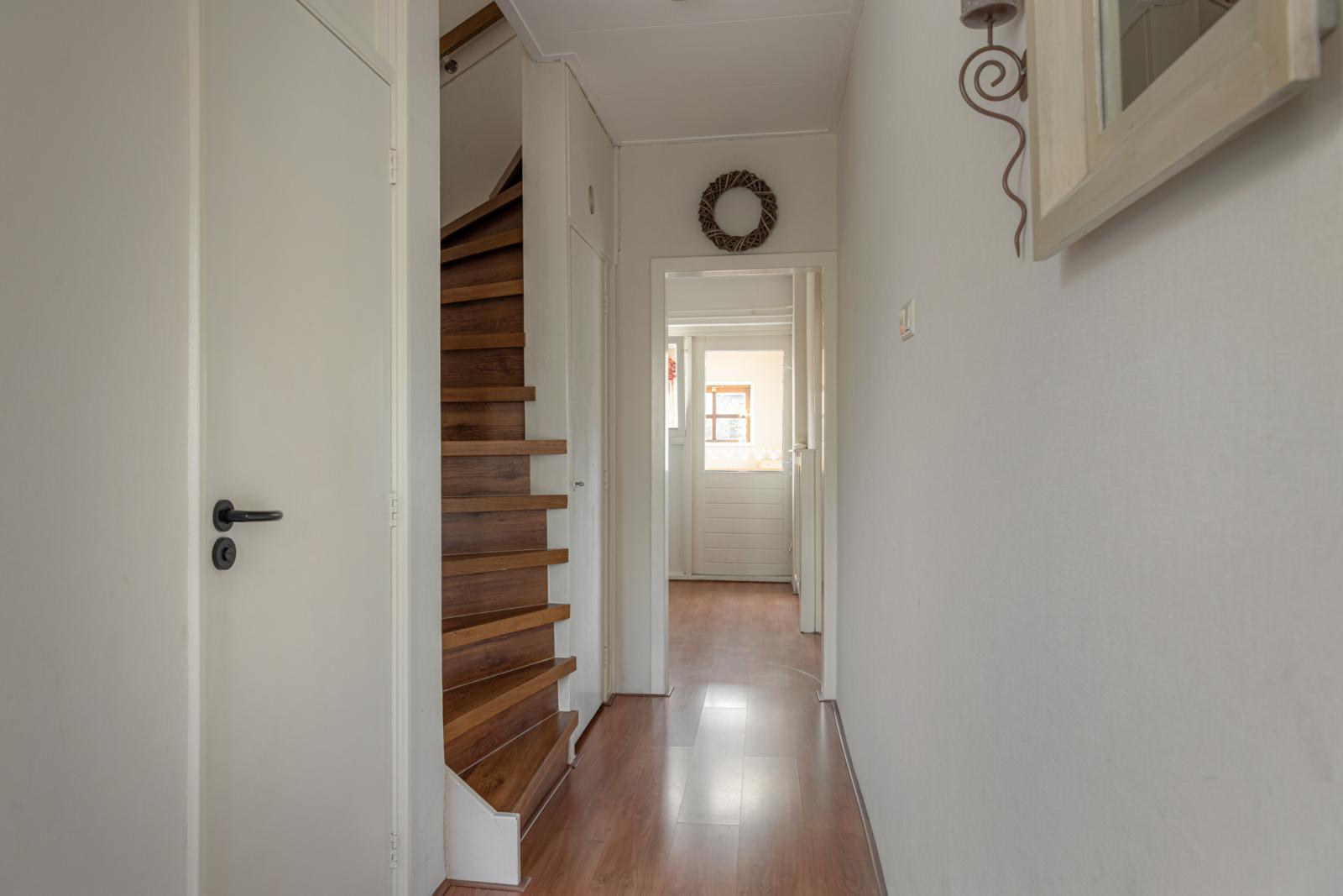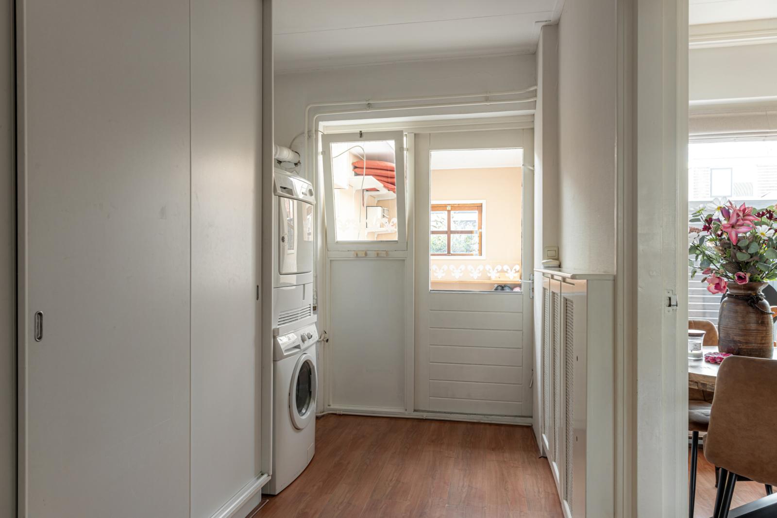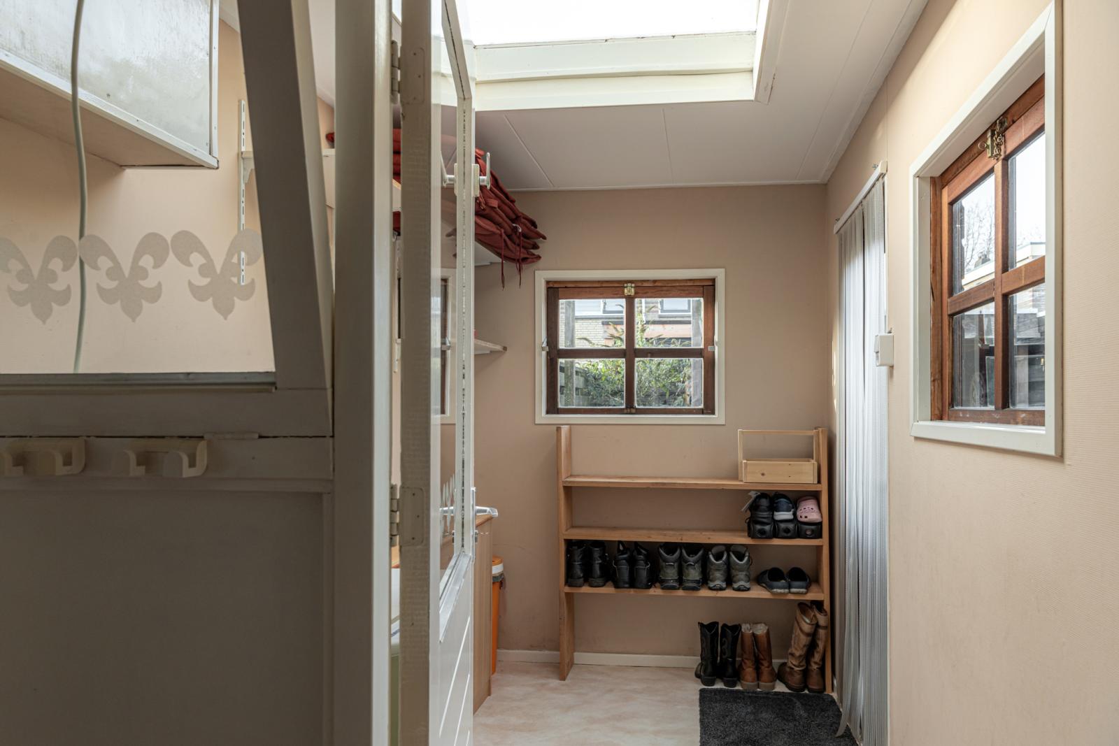 De indeling is als volgt: via de voordeur in de hal met meterkast, trapopgang en modern toilet. Dan kom je in de bijkeuken met veel bergruimte en de aansluitingen voor wasmachine en droger. Ook hangt hier de cv-ketel. Rechtsaf in de bijkeuken naar de keuken.