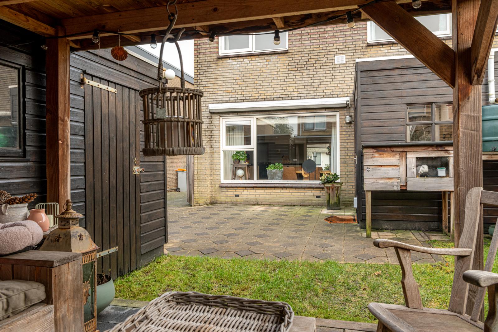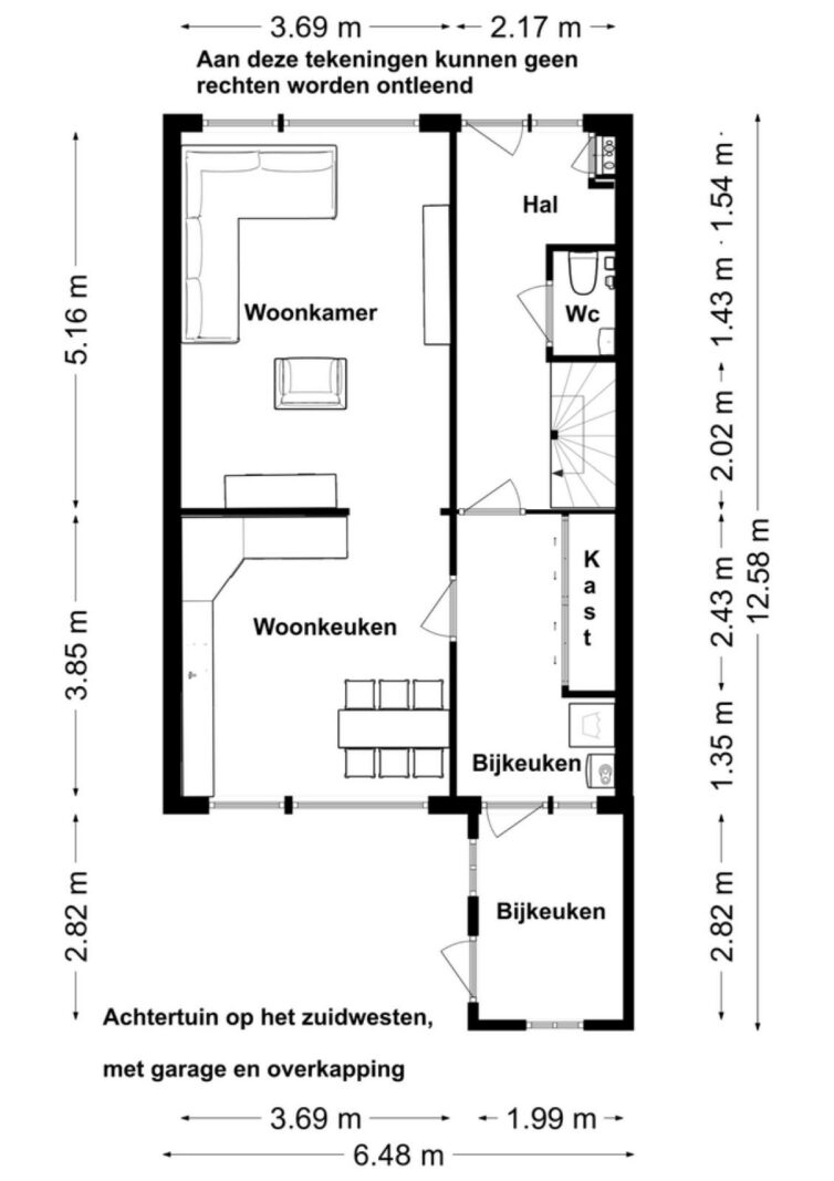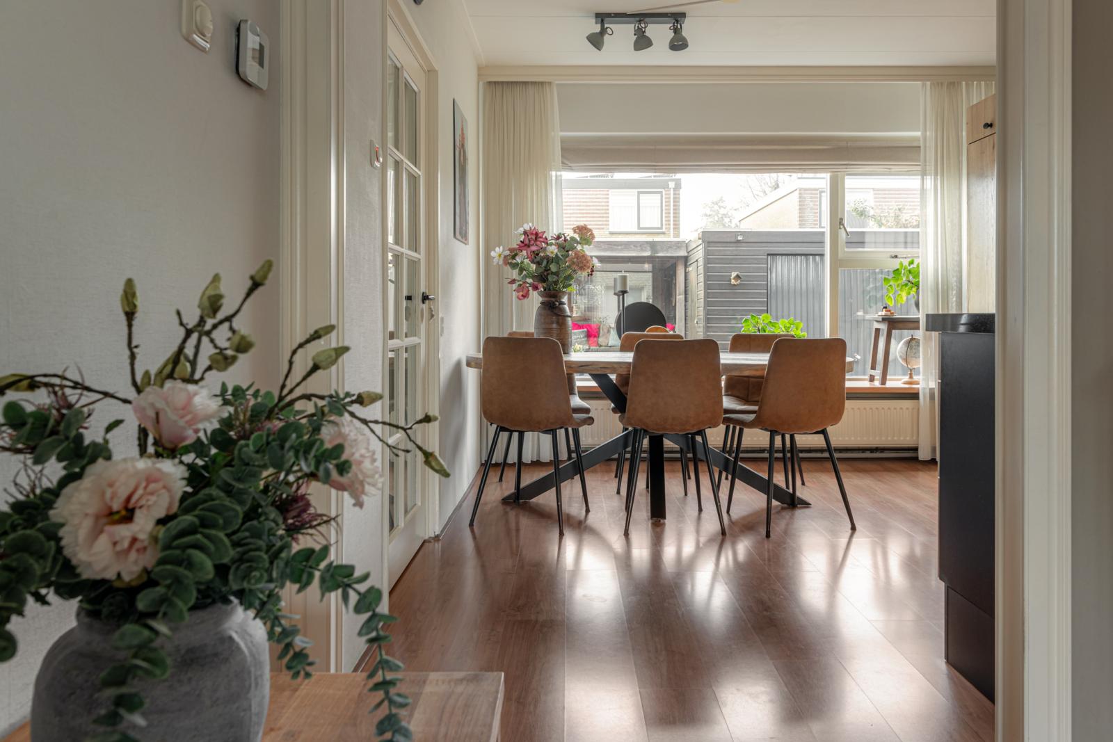 De indeling is als volgt: via de voordeur in de hal met meterkast, trapopgang en modern toilet. Dan kom je in de bijkeuken met veel bergruimte en de aansluitingen voor wasmachine en droger. Ook hangt hier de cv-ketel. Rechtsaf in de bijkeuken naar de keuken.
