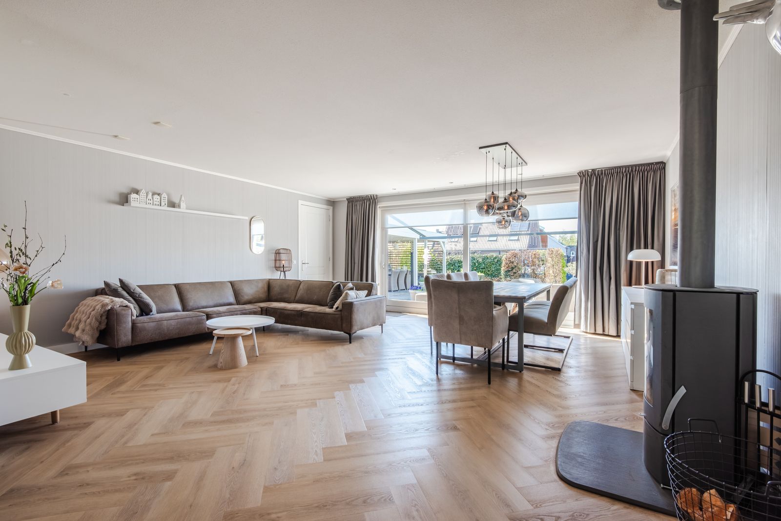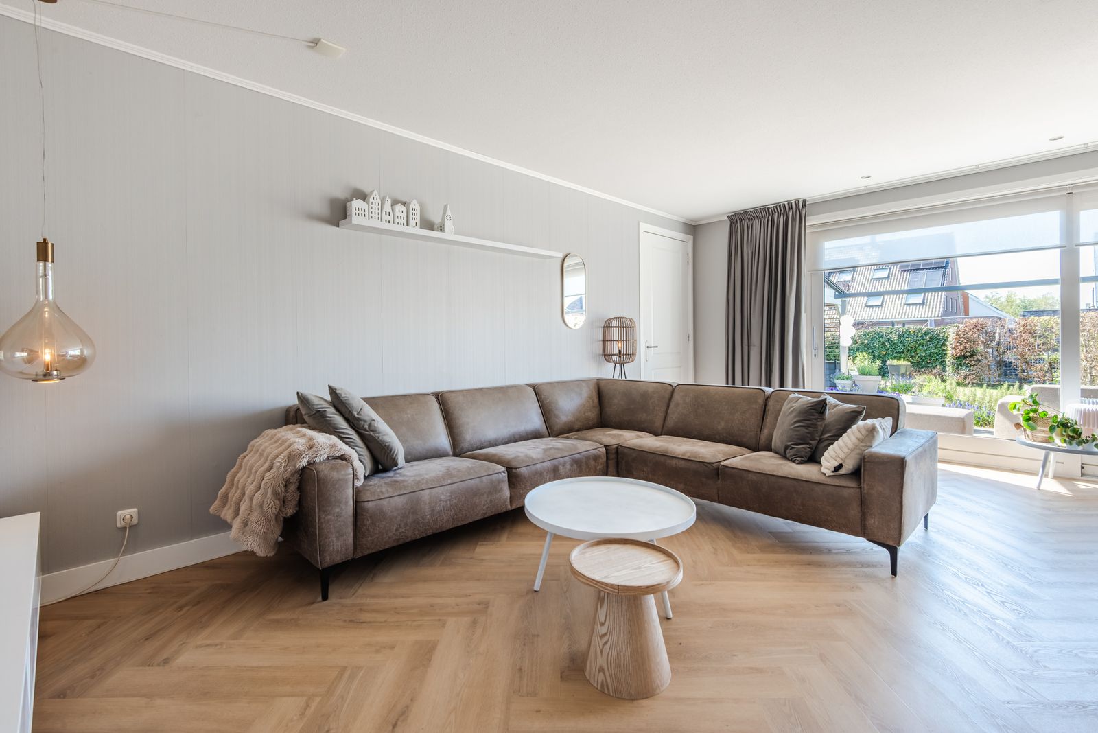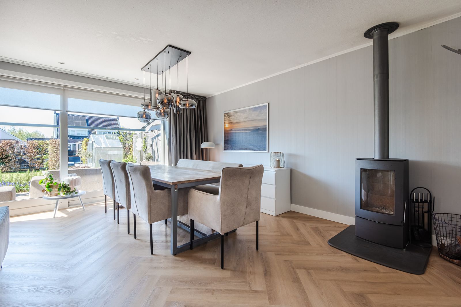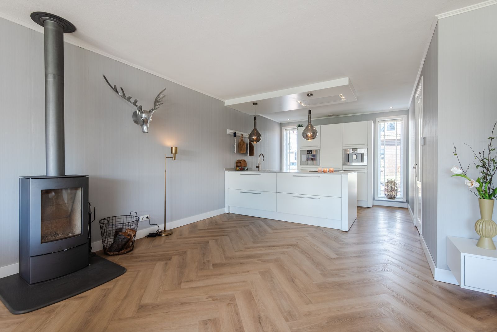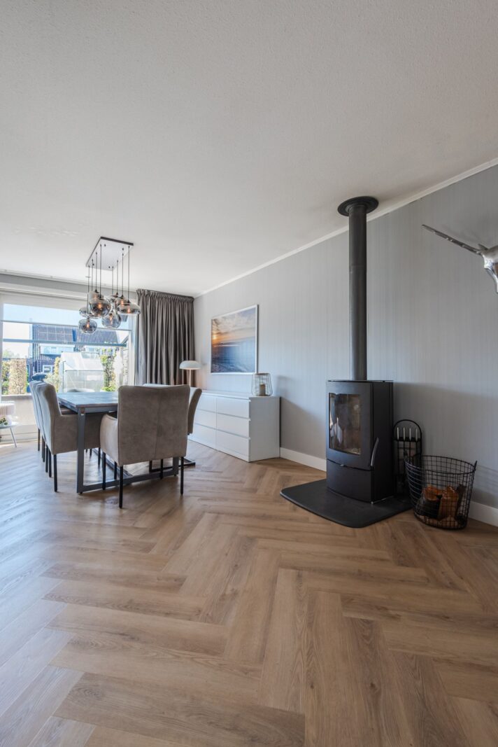 De woning voelt direct licht en rustig aan, met een moderne Scandinavische uitstraling, paneeldeuren en een visgraat PVC-vloer uit 2024 die zorgt voor een warme en stijlvolle basis. De brede indeling en de grote raampartij zorgen voor een verrassend ruimtelijk en licht gevoel. Het kenmerkende houtwerk aan de buitenzijde is in 2025 opnieuw geschilderd en draagt bij aan de verzorgde uitstraling van de woning.