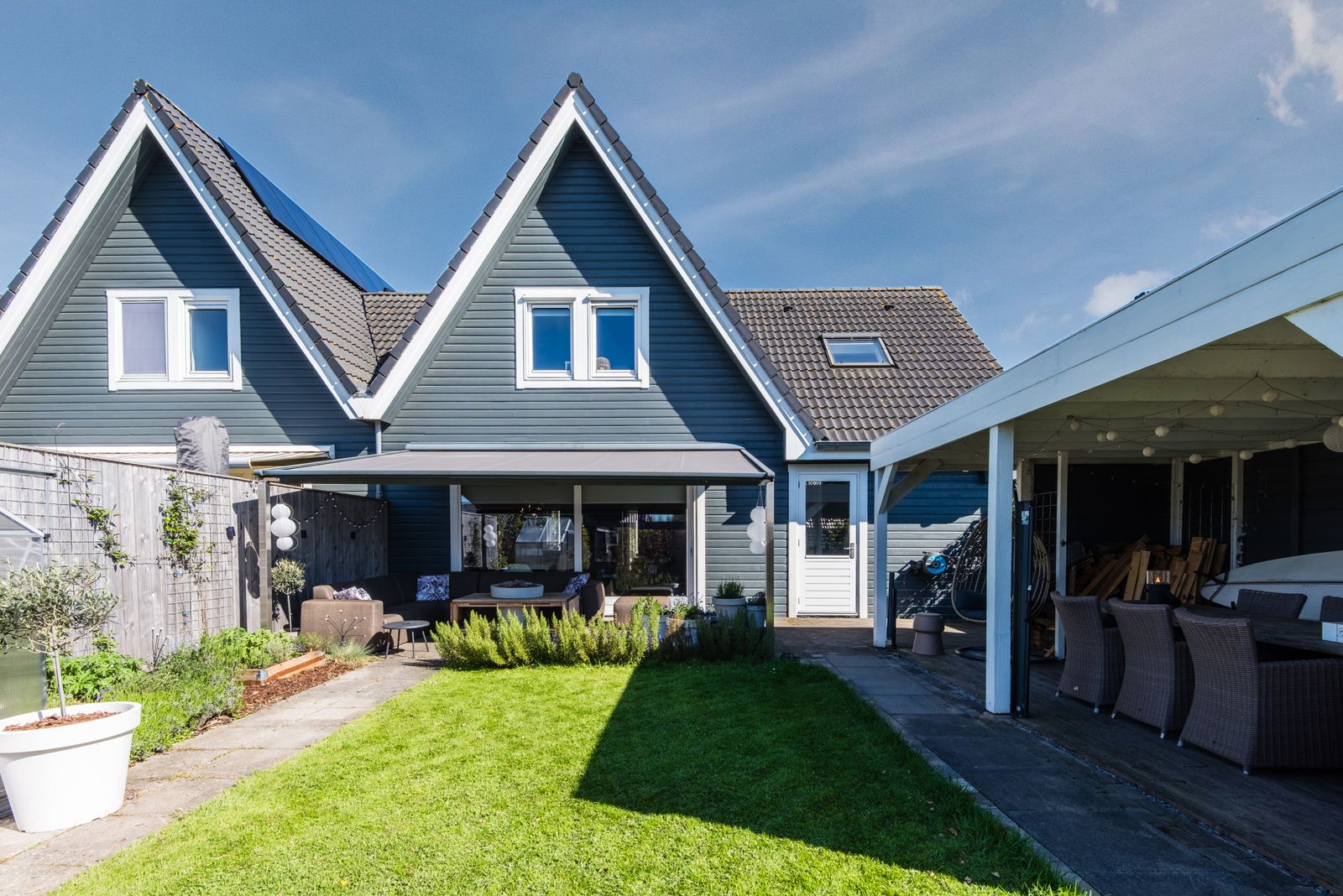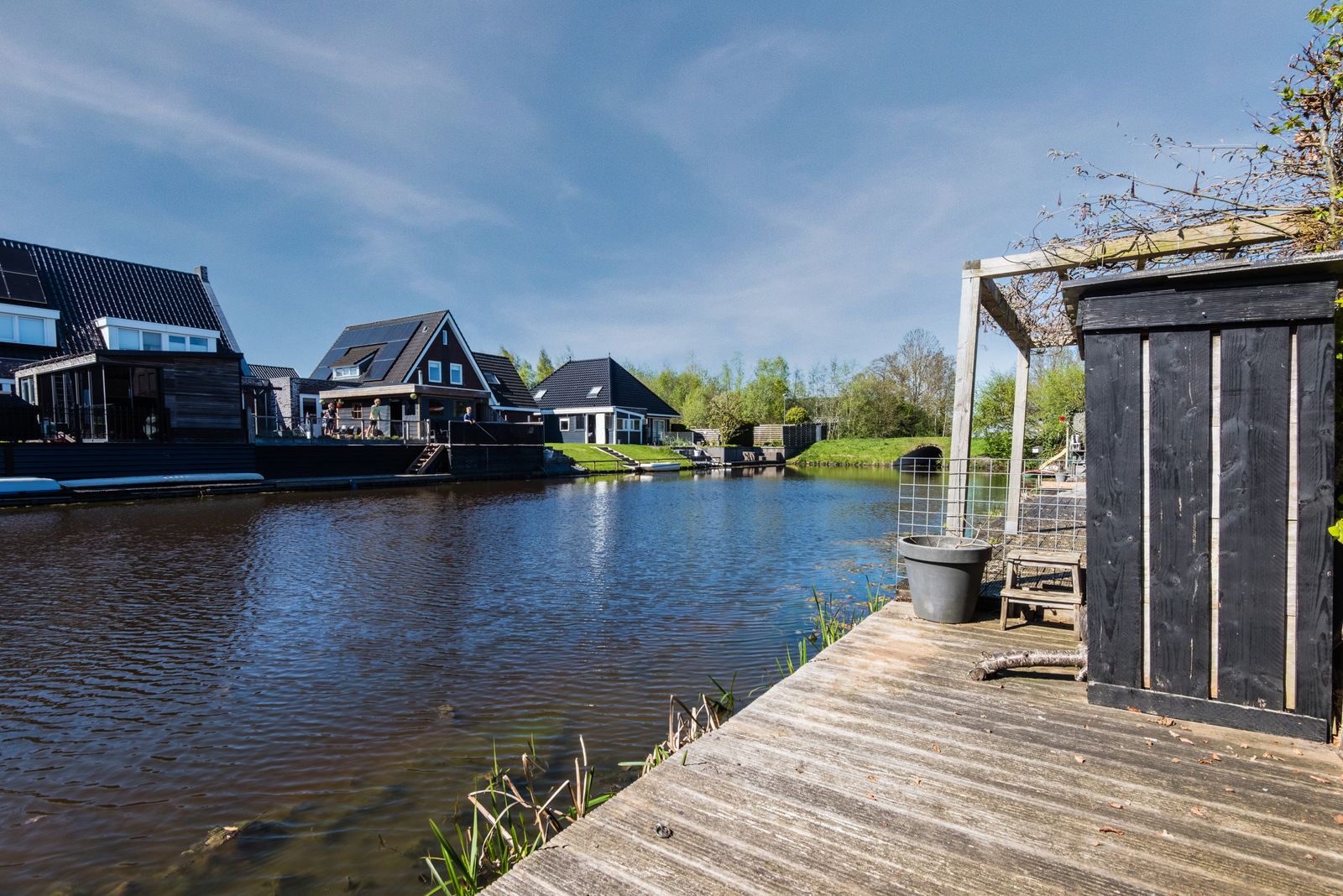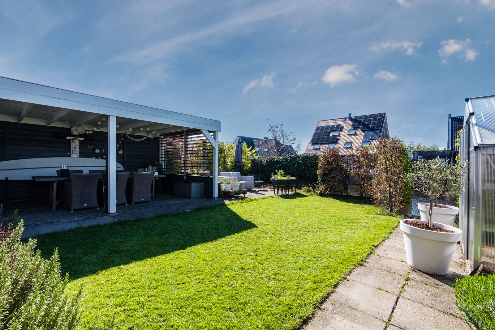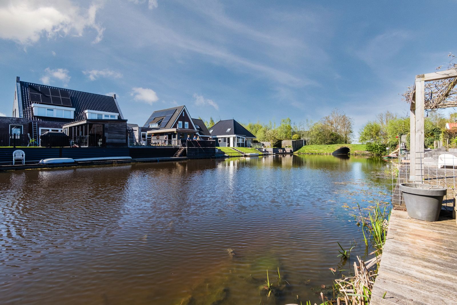 De tuin is een absolute plus: gelegen op het westen en direct aan het water. Hier geniet je van zon, rust en ruimte. Meerdere terrassen, een terrasoverkapping aan de woning en een vlonder aan het water zorgen voor een fijne overgang tussen binnen en buiten. Daarnaast is er een royale vrijstaande overkapping van circa 6,5 bij 3,75 meter, ideaal als extra zit- of loungeplek.