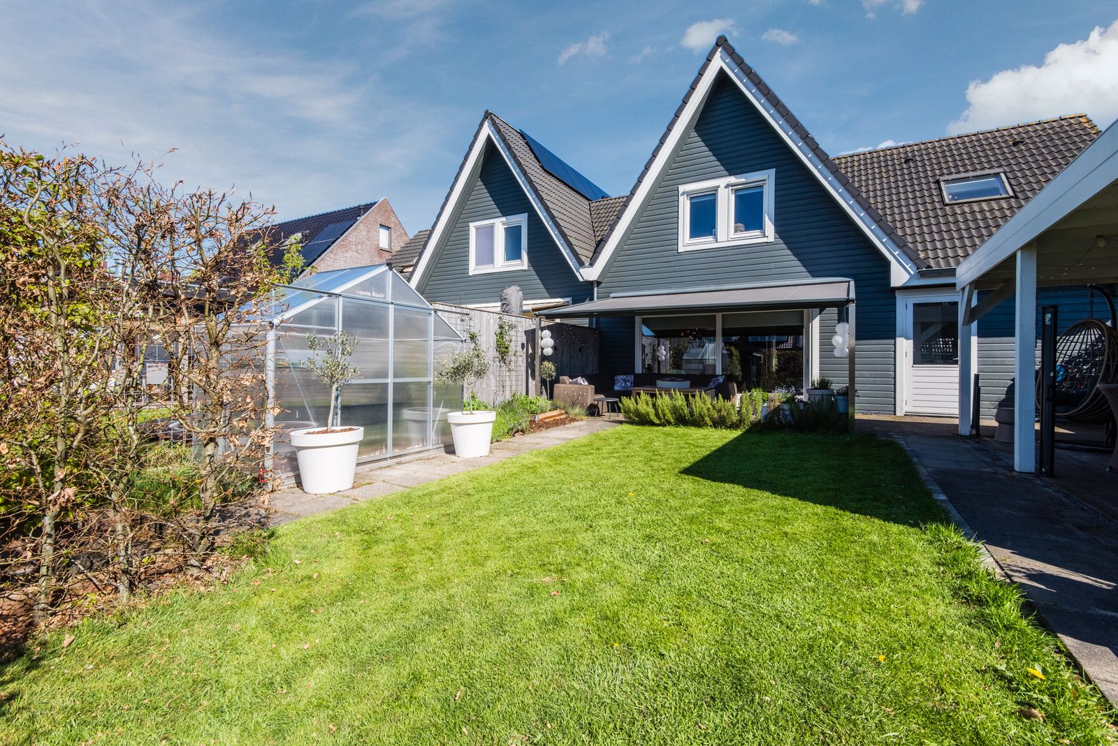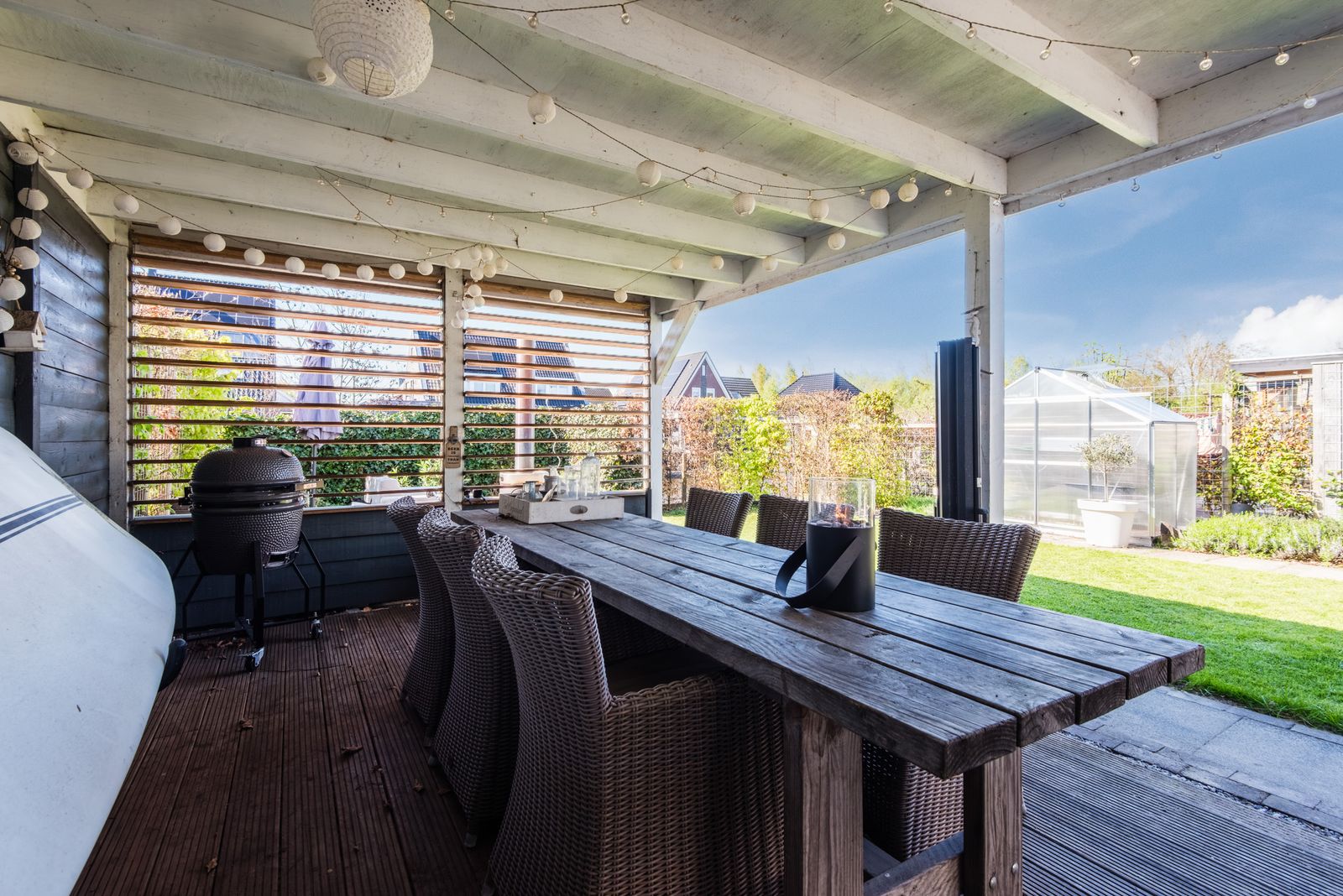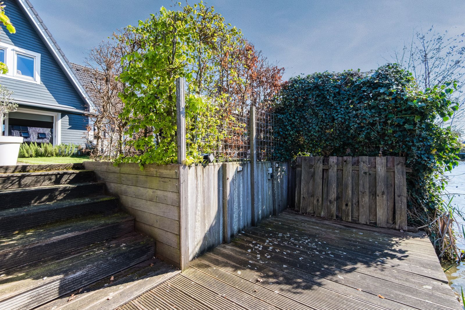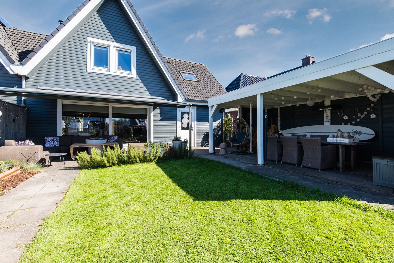 De tuin is een absolute plus: gelegen op het westen en direct aan het water. Hier geniet je van zon, rust en ruimte. Meerdere terrassen, een terrasoverkapping aan de woning en een vlonder aan het water zorgen voor een fijne overgang tussen binnen en buiten. Daarnaast is er een royale vrijstaande overkapping van circa 6,5 bij 3,75 meter, ideaal als extra zit- of loungeplek.