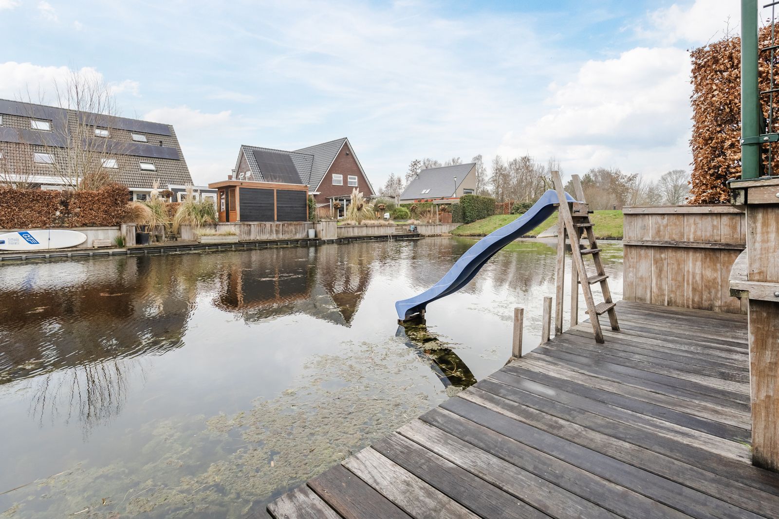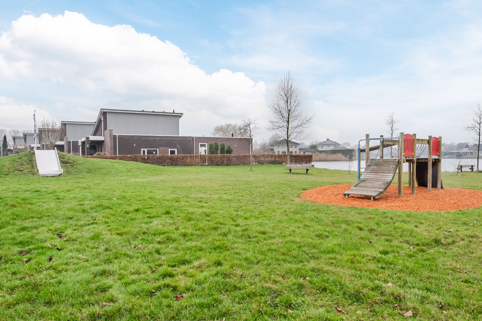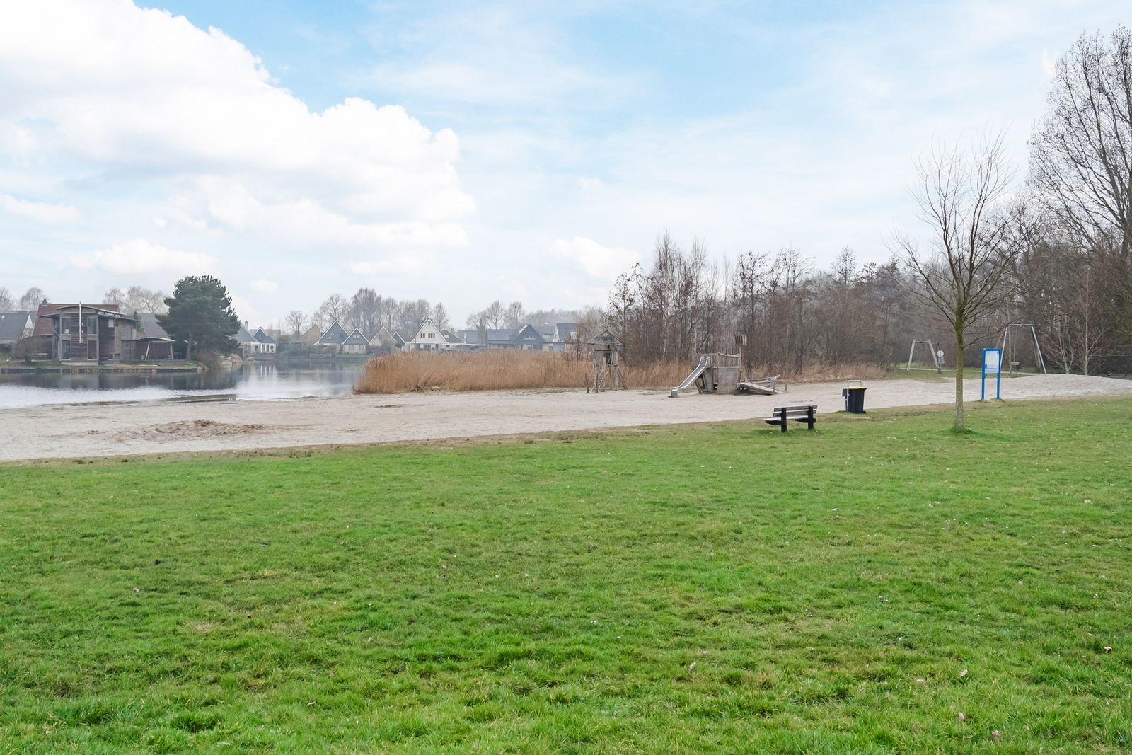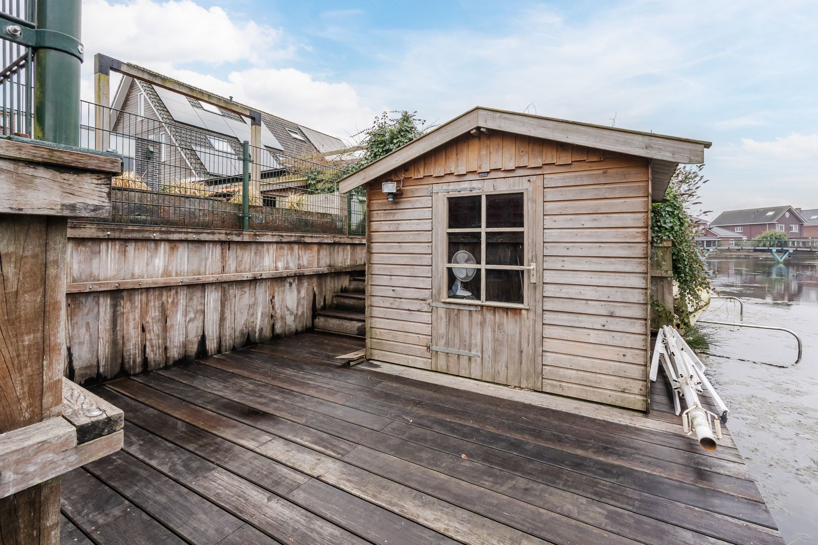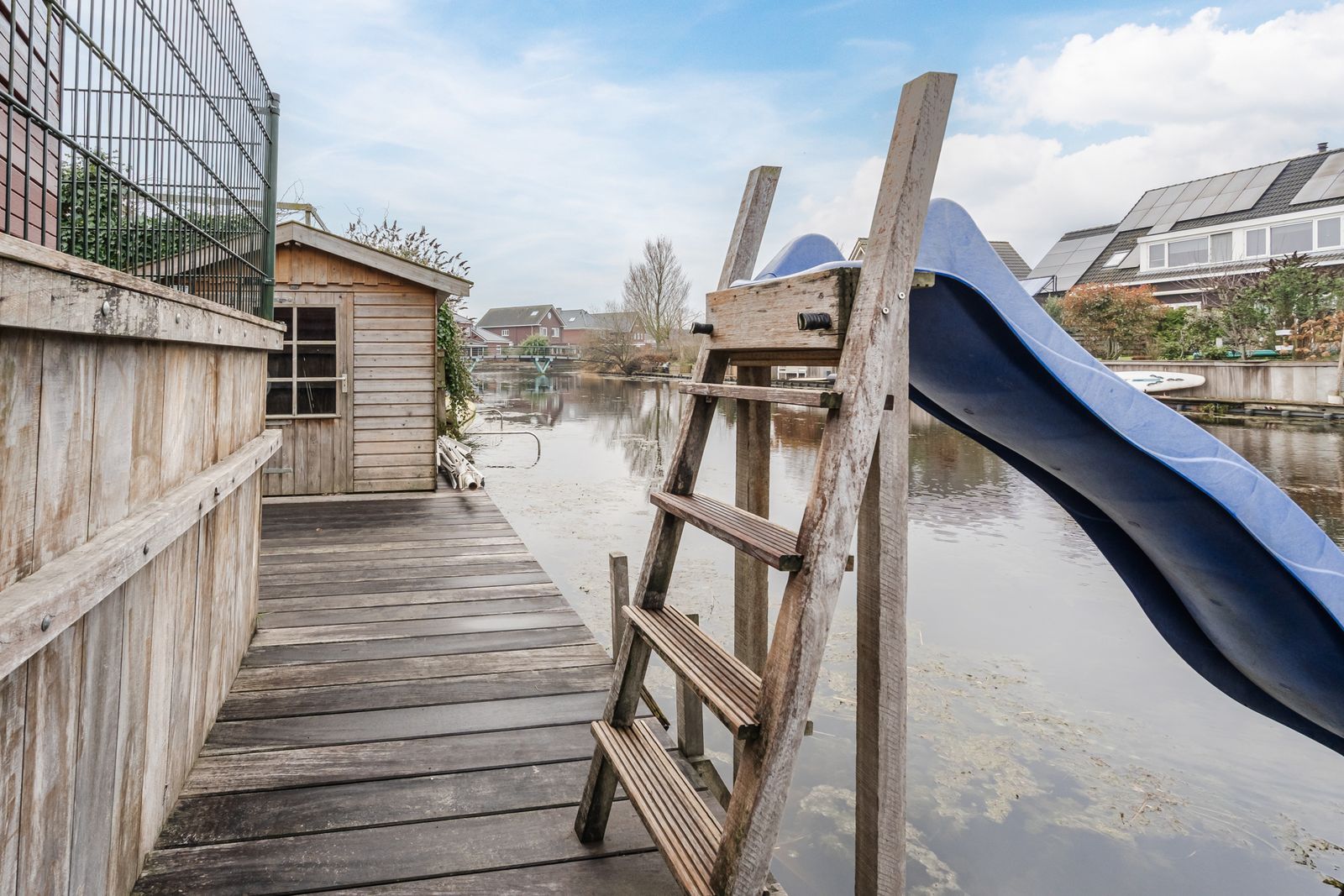 Achtertuin grenzend aan een brede waterpartij, welke in verbinding staat met het overige water in de wijk, waaronder de recreatieplas en het strandje. Vrijstaand houten tuinhuisje in de tuin. Walbeschoeiing van composiet.