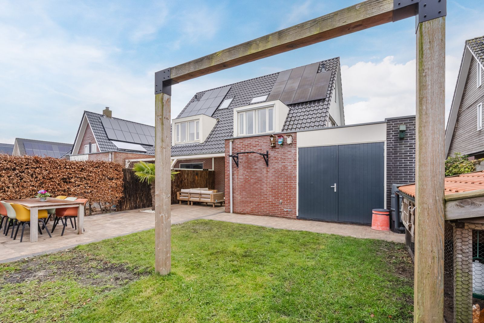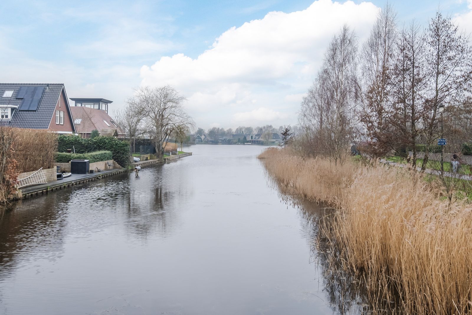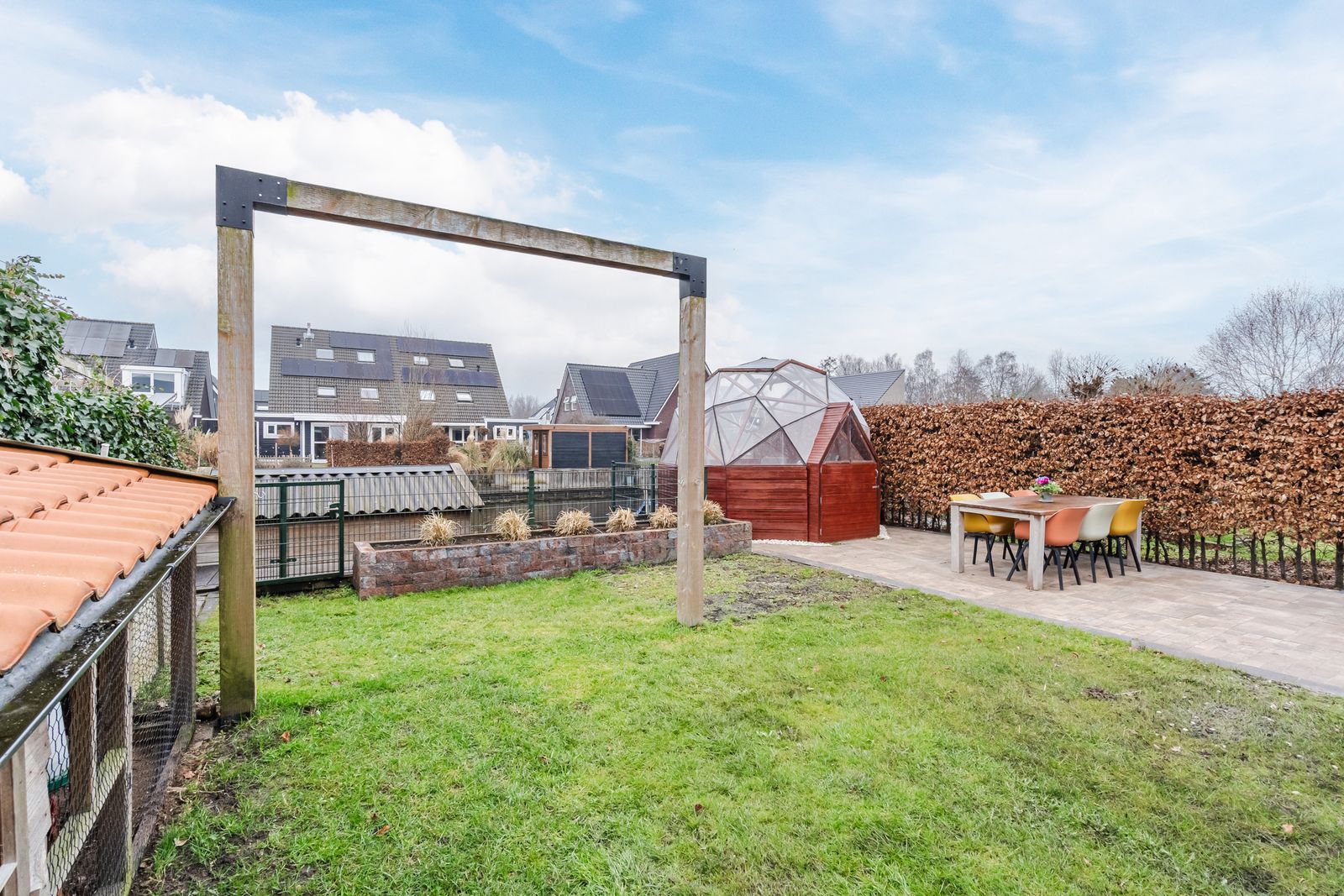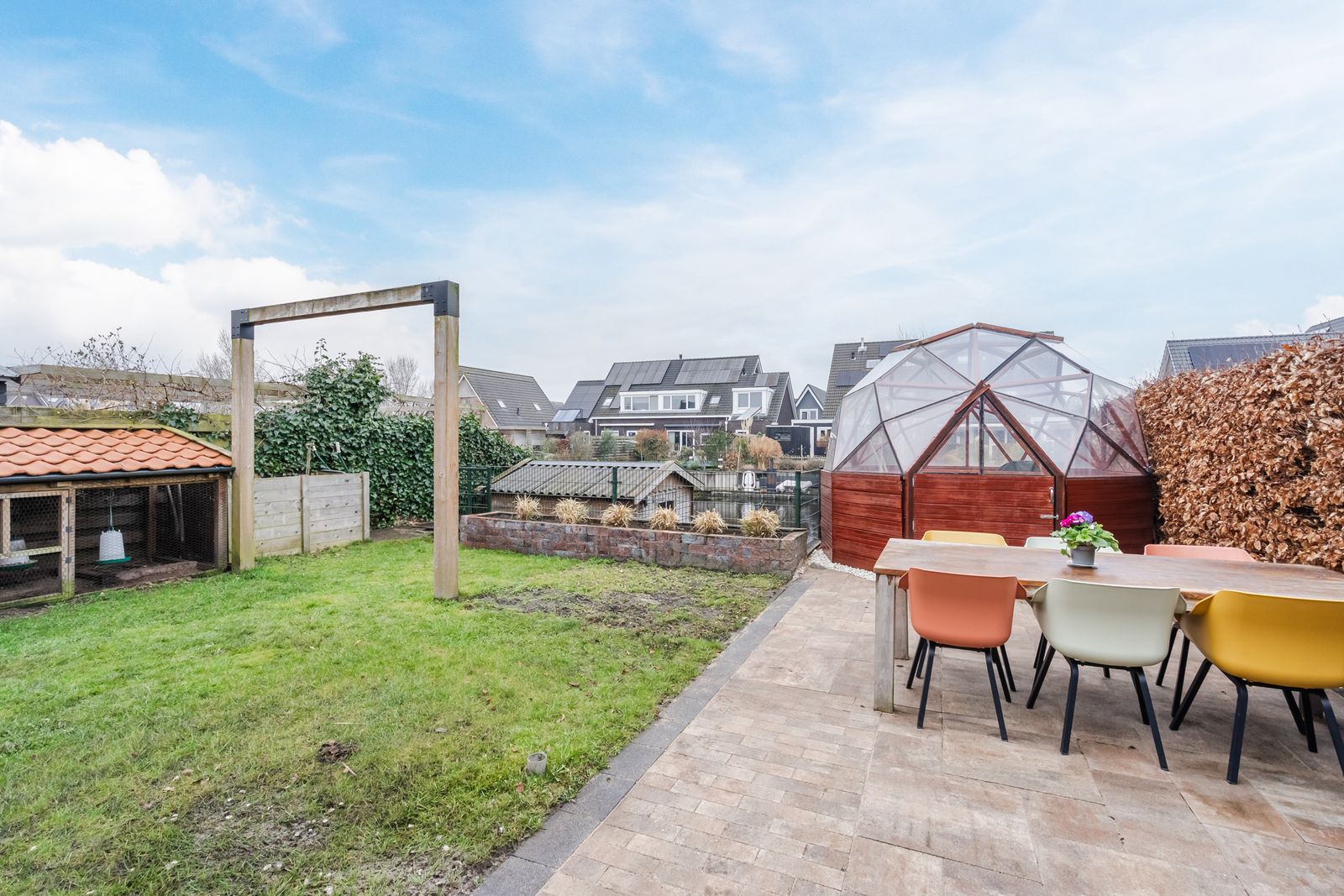 Achtertuin grenzend aan een brede waterpartij, welke in verbinding staat met het overige water in de wijk, waaronder de recreatieplas en het strandje. Vrijstaand houten tuinhuisje in de tuin. Walbeschoeiing van composiet.