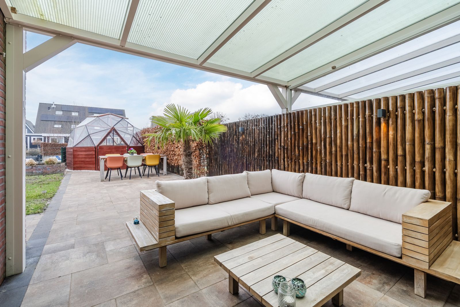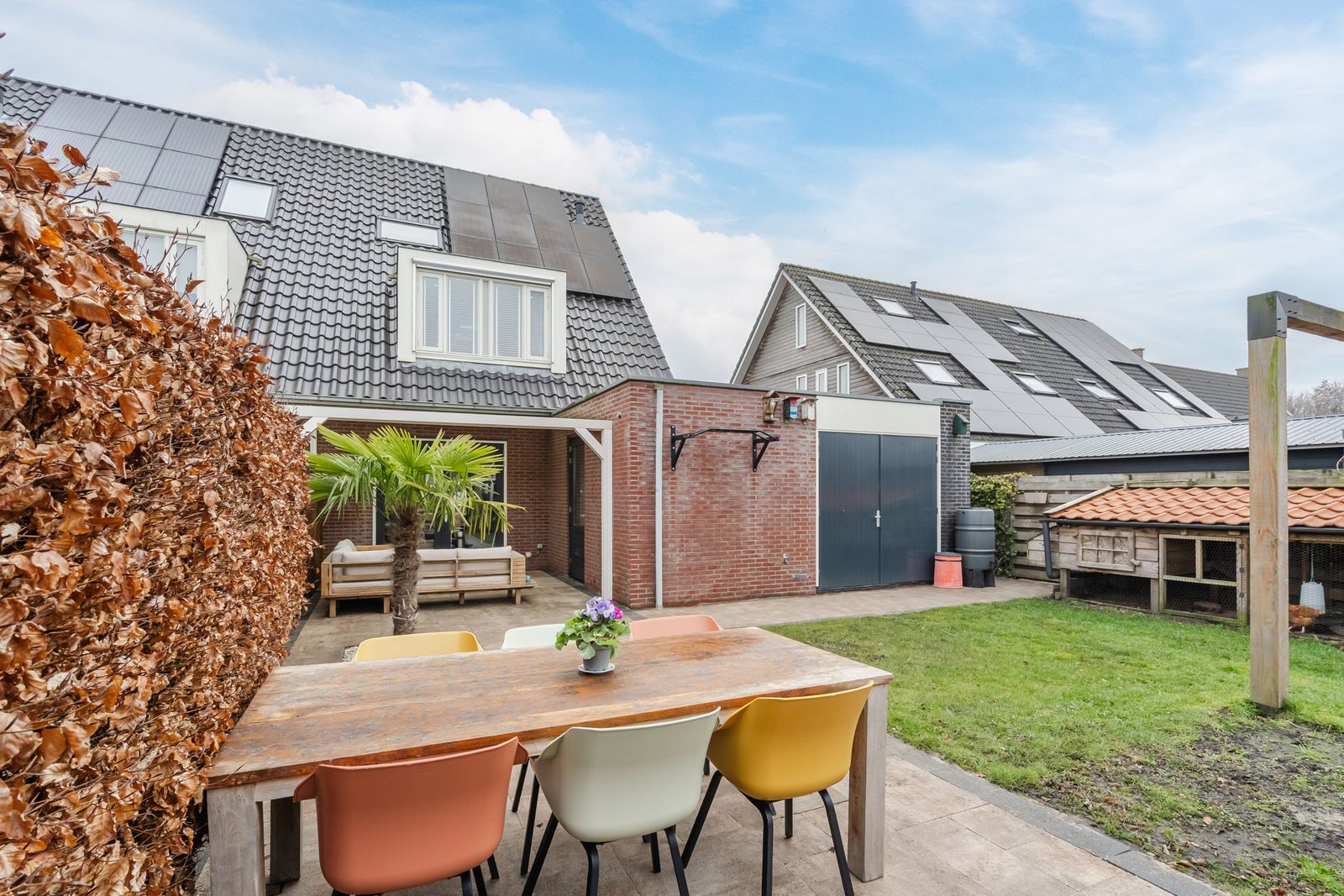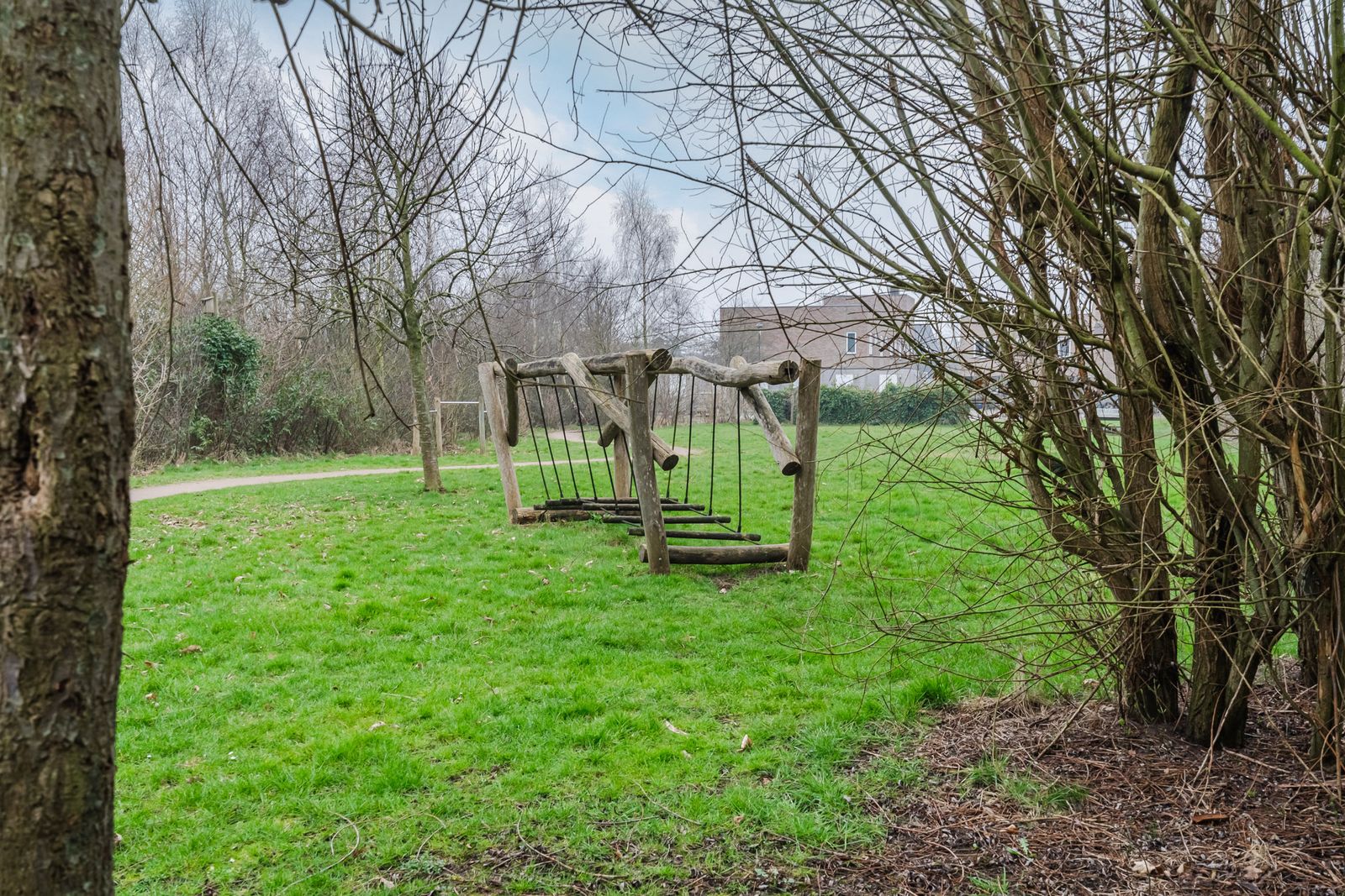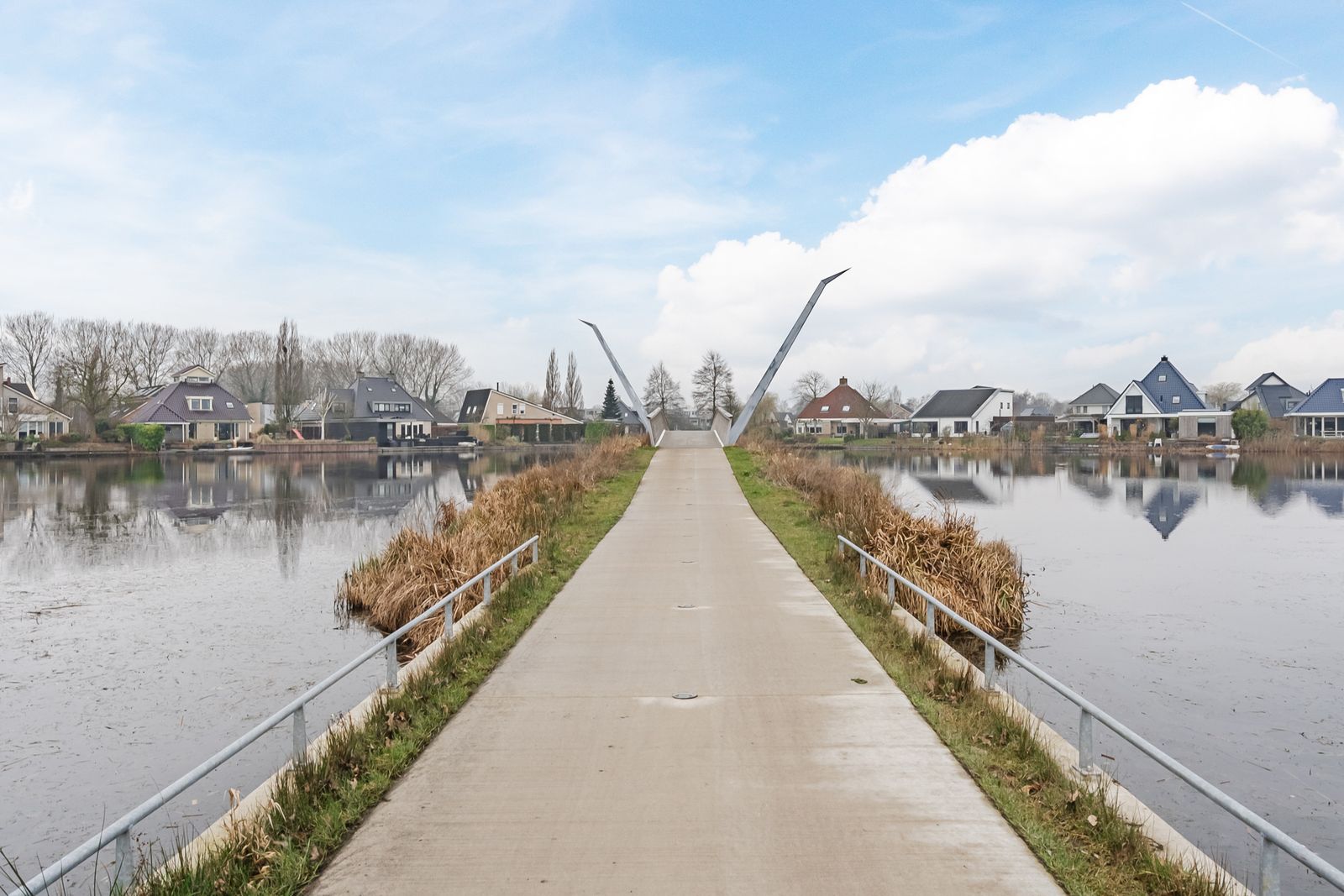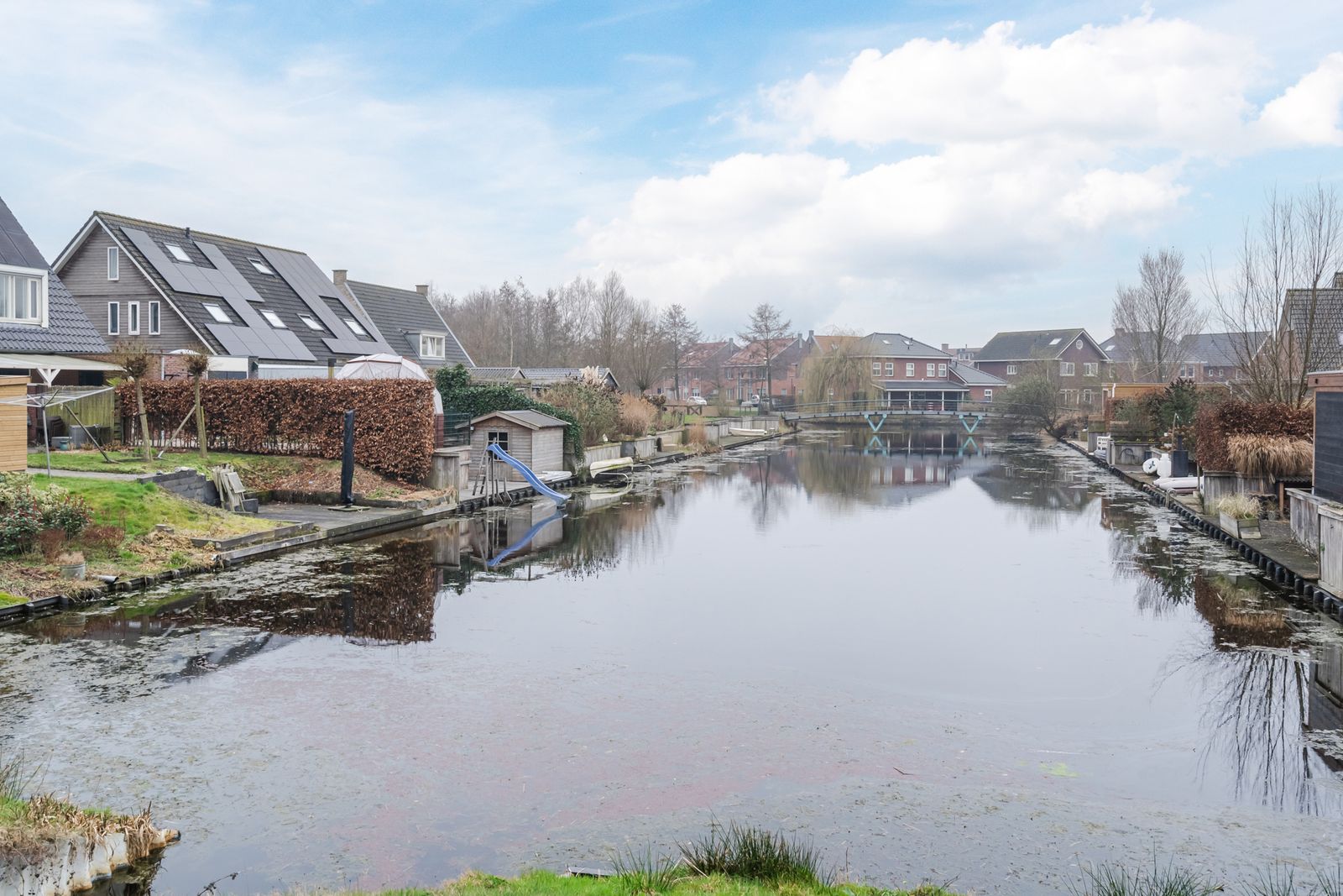 Achtertuin grenzend aan een brede waterpartij, welke in verbinding staat met het overige water in de wijk, waaronder de recreatieplas en het strandje. Vrijstaand houten tuinhuisje in de tuin. Walbeschoeiing van composiet.