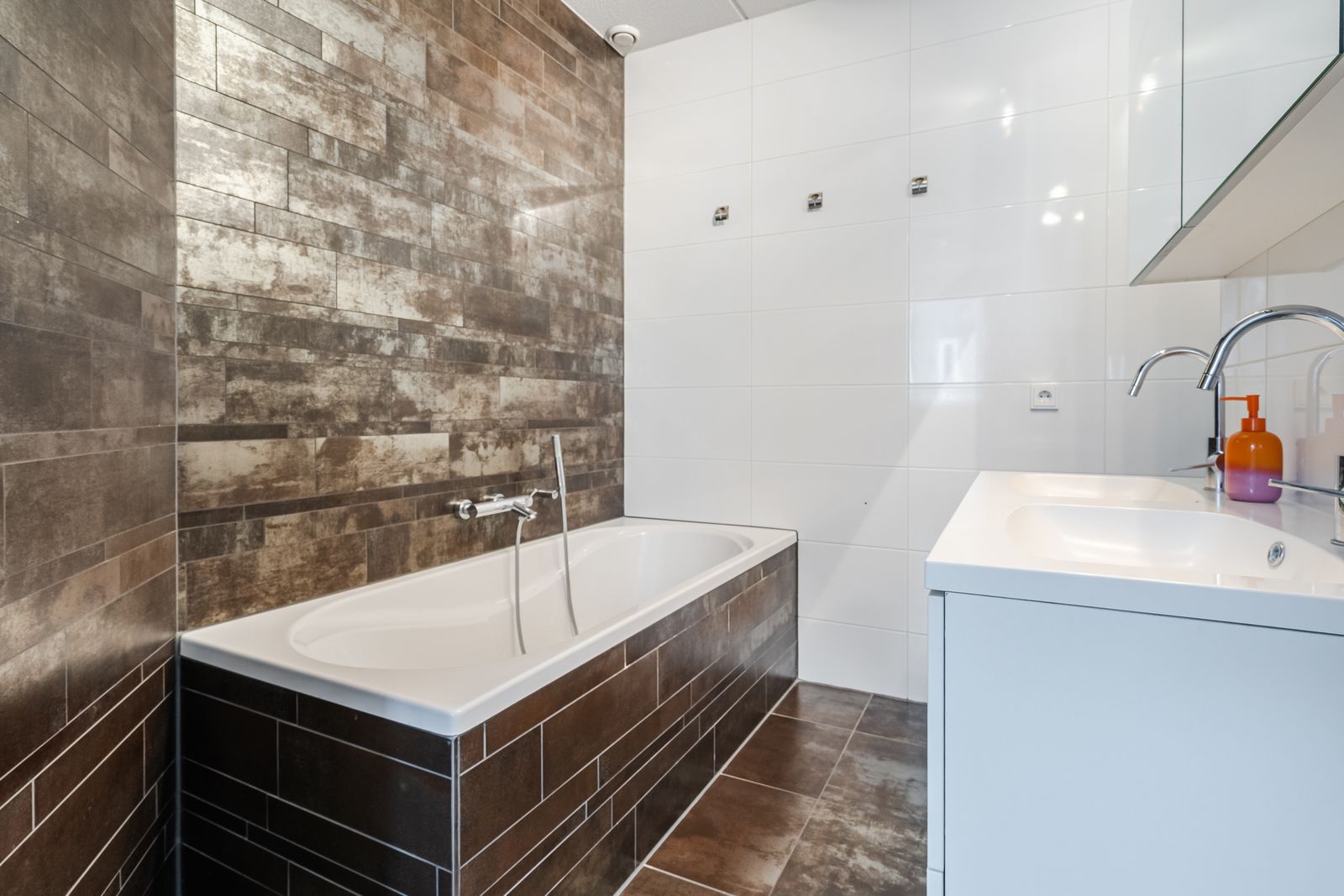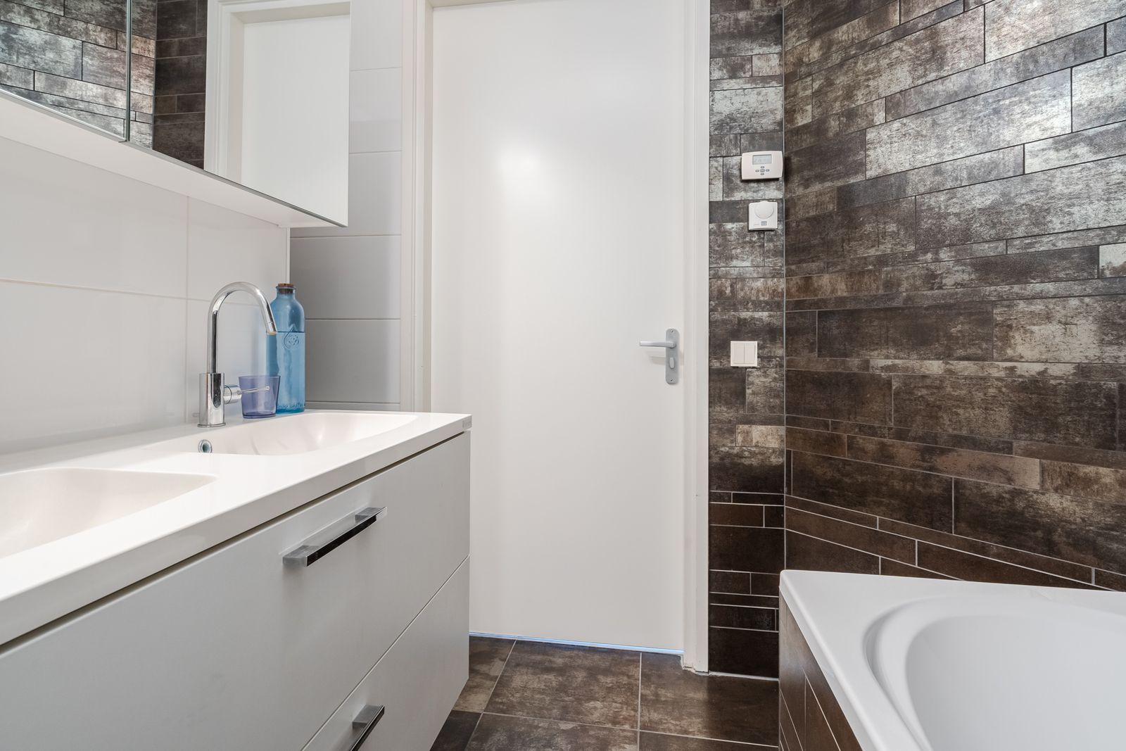 Overloop, 3 volwaardige slaapkamers en een complete badkamer. In de ruime/moderne badkamer bevindt zich een bad, douche, dubbele wastafel en 2e toilet.