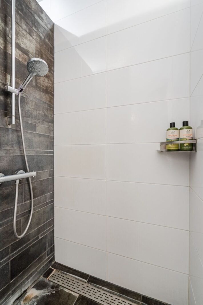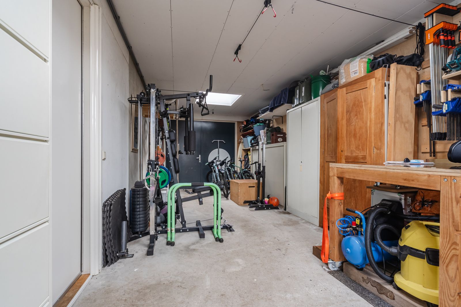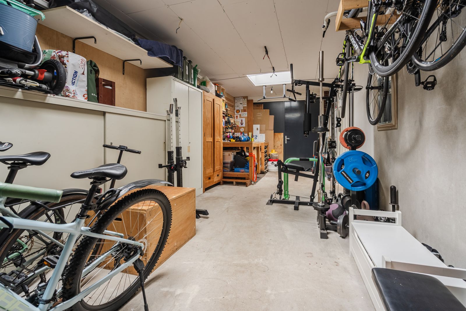 De ruime geïsoleerde garage heeft zowel aan de voorzijde als aan de achterzijde een dubbele deur, en voorzien van elektra/water en 2 geïsoleerde lichtkoepels.
